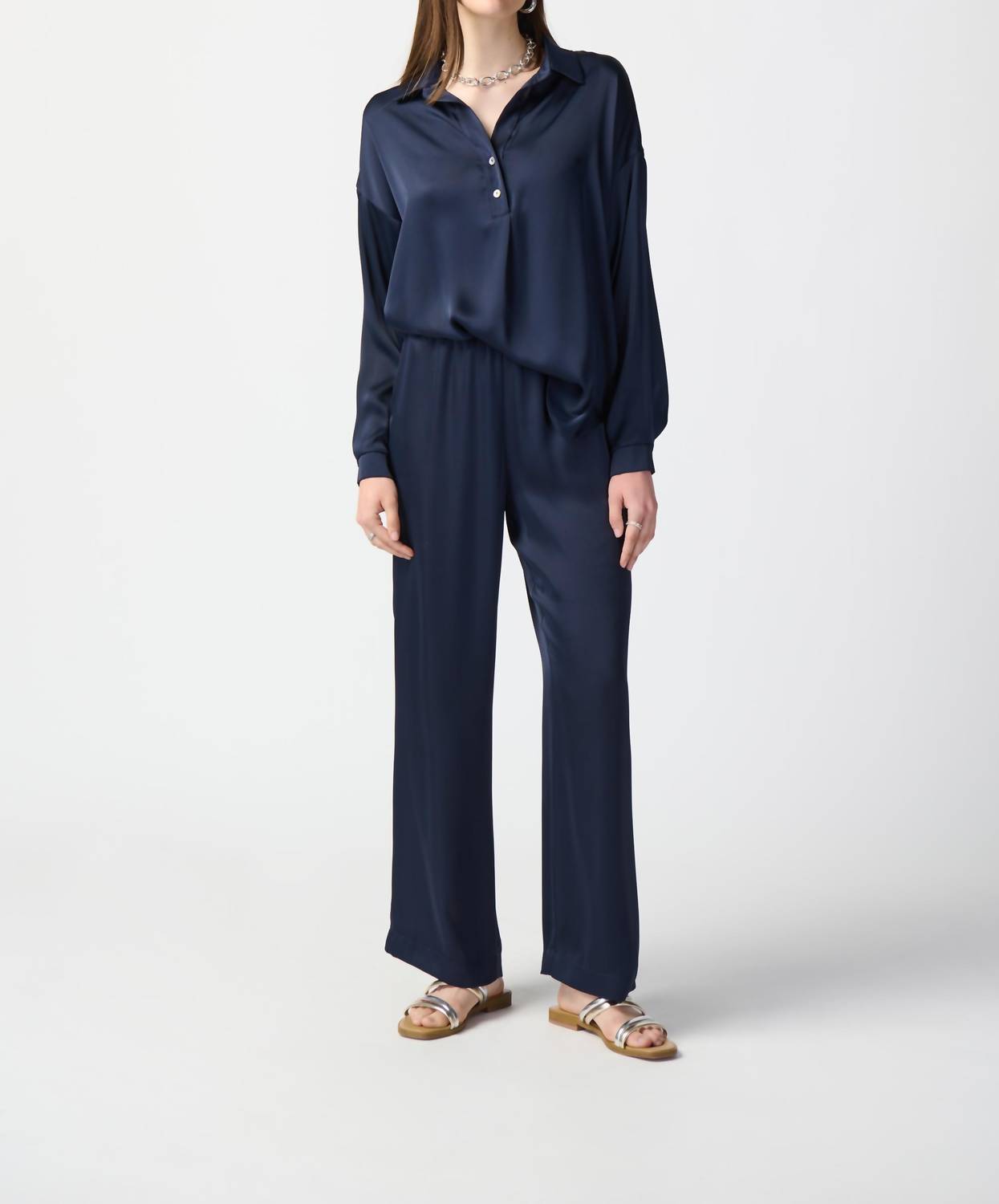 A classic button down shirt that will never go out of style. Introducing the Long Sleeve Satin Shirt by Joseph Ribkoff, a chic option in Midnight Blue. Crafted from 100% polyester, this hip-length piece made in Canada features a smart collar neckline and long, straight sleeves. Its button closure makes it a perfect choice for both professional and casual settings. Care instructions recommend hand washing and line drying to maintain its timeless elegance.