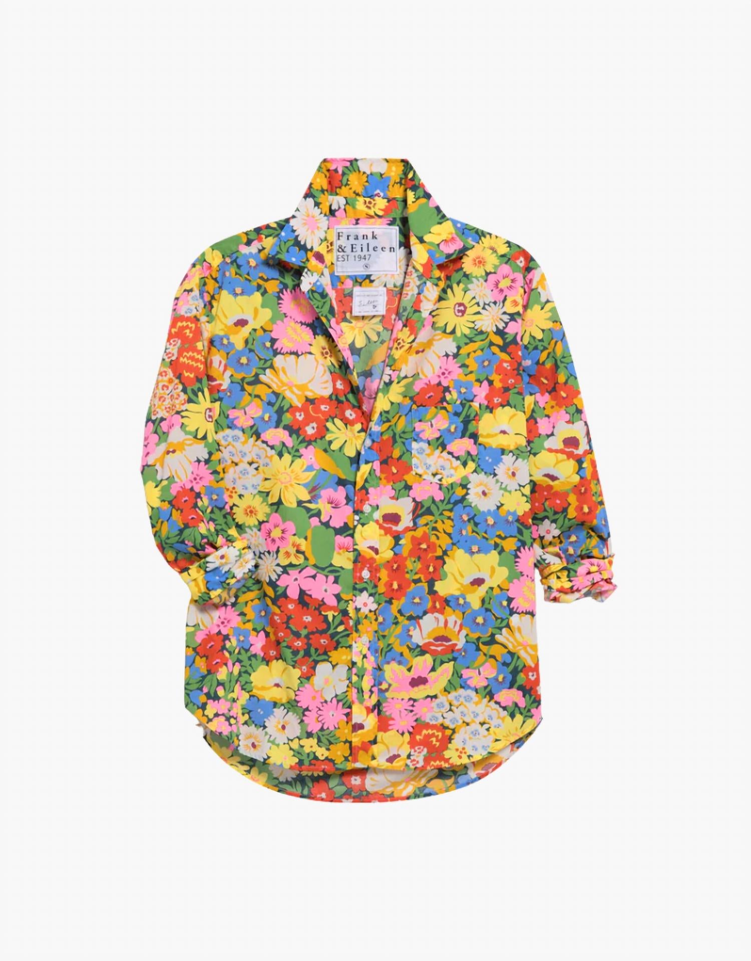This button down shirt is comfortable yet polished. Discover effortless style with the Eileen Relaxed Button-up Shirt by Frank & Eileen, featuring long sleeves with button cuffs. Expertly crafted from 100% Italian Classic Linen, it embodies casual California charm with a maximalist orange and pink floral pattern. This versatile shirt, complete with a signature bust-flattering button placement and a chest pocket, is shaped like a circle with soft rounded shoulders and a shirttail hem. Care instructions recommend turning the garment inside out, machine washing on cold, and tumble drying on low or line drying. Model Simone, 5'8" with a 34" bust, wears a size S.