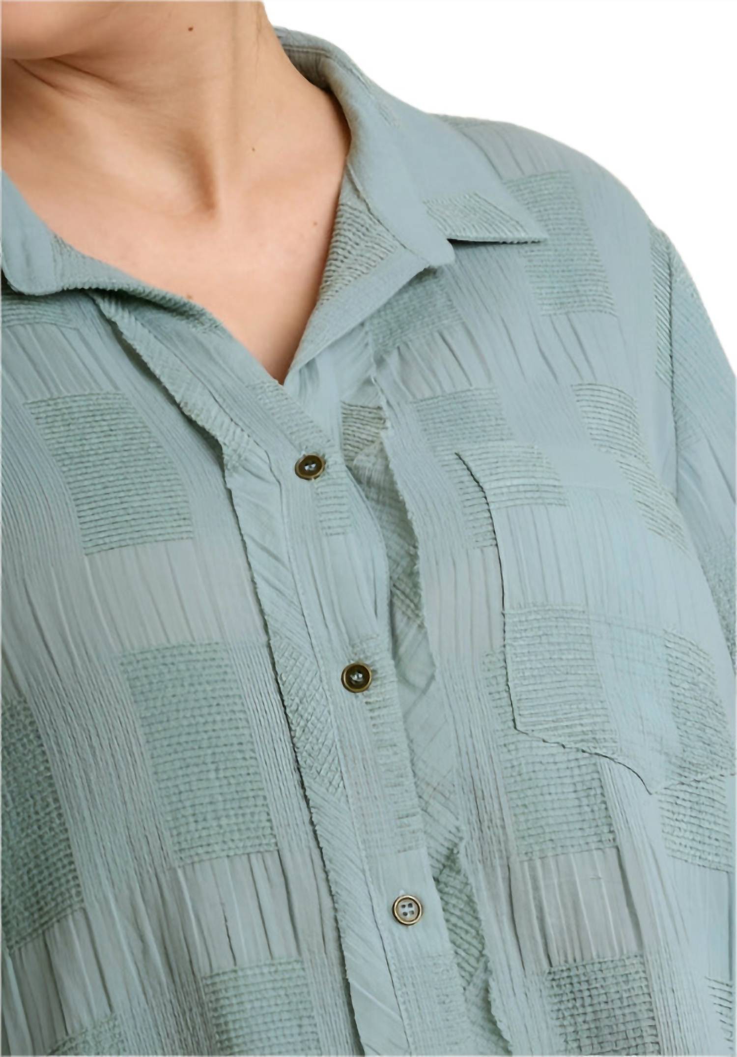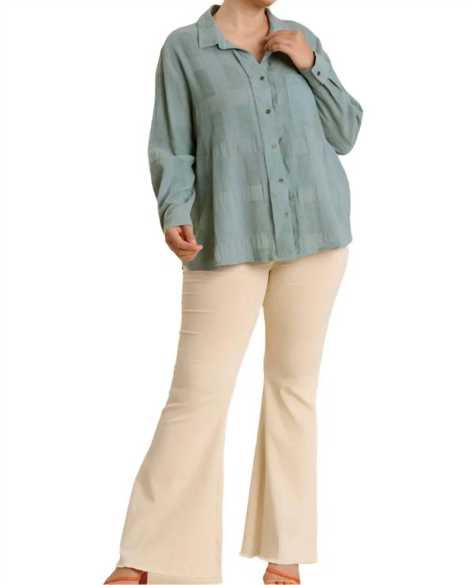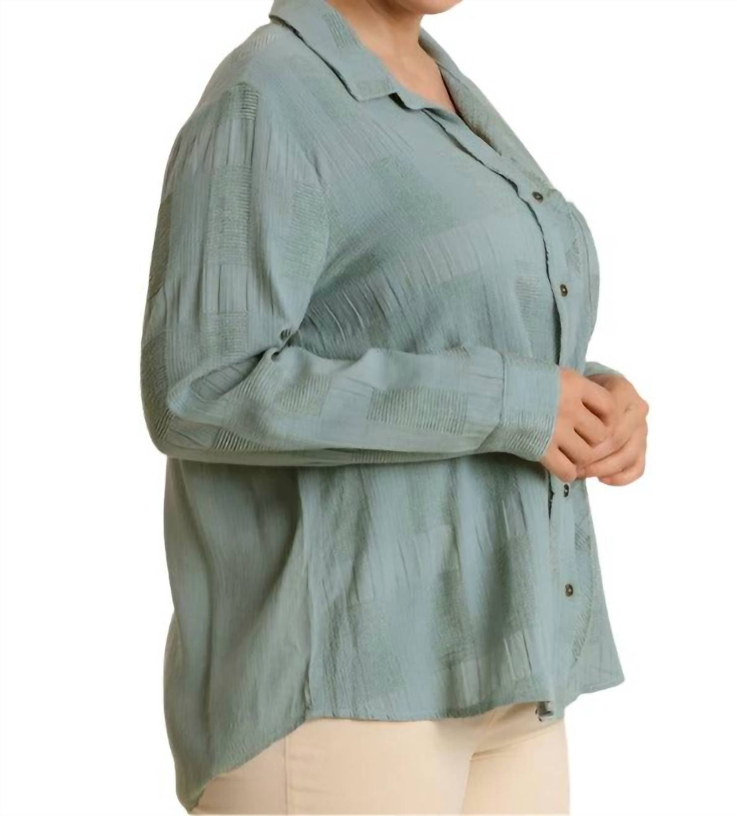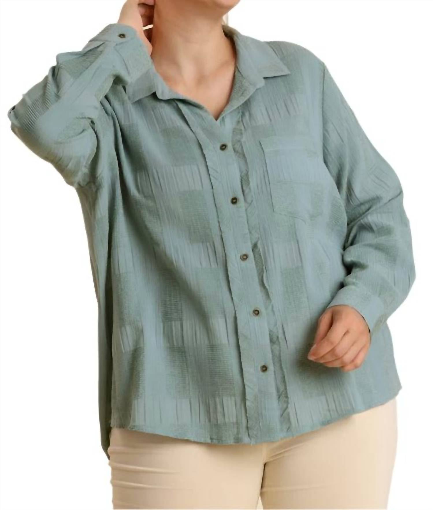 A classic button down shirt that will never go out of style. Discover the Umgee Chenille Button Down Top in Mint, a chic piece that effortlessly combines style and comfort. This long-sleeve top features a practical button closure, a stylish collar, and a handy front pocket. Crafted from 80% cotton and 20% chenille with a contrast of 100% rayon, it boasts a high-low hem and an A-line silhouette. Imported and designed for easy maintenance, simply hand wash it in cold water. Available in various sizes: XL (Bust 46", Length 26"), 1X (Bust 48", Length 26"), and 2X (Bust 50", Length 26").