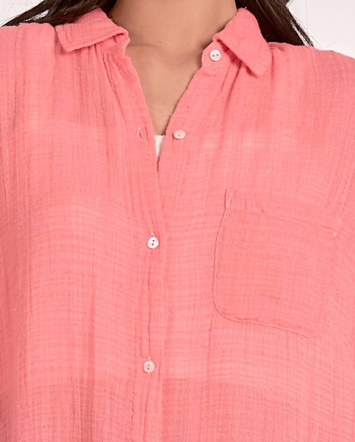 This button down shirt is comfortable yet polished. Introducing the Short-sleeve Button Down Top by ELAN, an effortlessly stylish addition to your summer wardrobe in a refreshing Coral hue. This women’s top features short sleeves, a classic collar neckline, and a solid pattern, making it perfect for a variety of occasions including vacations and Thanksgiving gatherings. Closure: Button closure. Care Instructions: Machine wash.