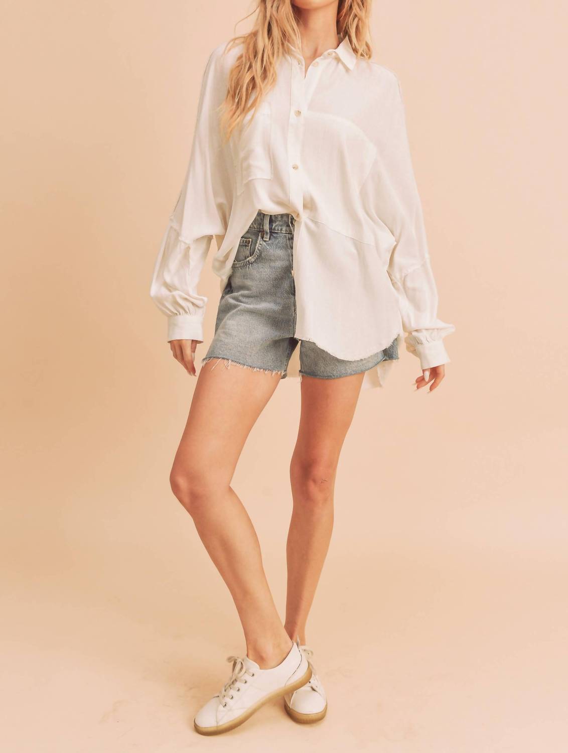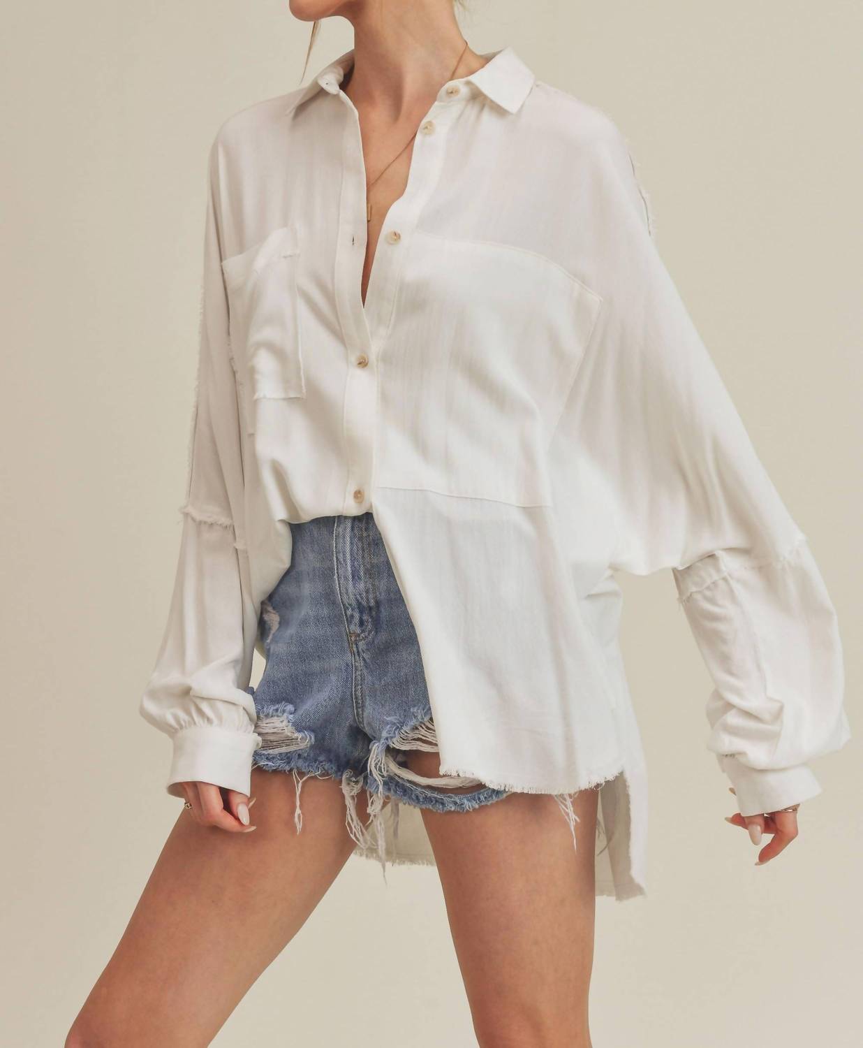 Meet your new go-to piece: the Delilah Shirt by AEMI + CO, designed in an elegant ivory color. Crafted from high-quality cotton, this long-sleeve shirt offers a timeless, classic style with a slouchy, oversized fit. It features a collar neckline and practical button closure, beautifully finished with raw-edge detailing and pockets. Ideal for adding the perfect shape to any ensemble, this solid pattern shirt is a versatile addition to any wardrobe. 100% Cotton.