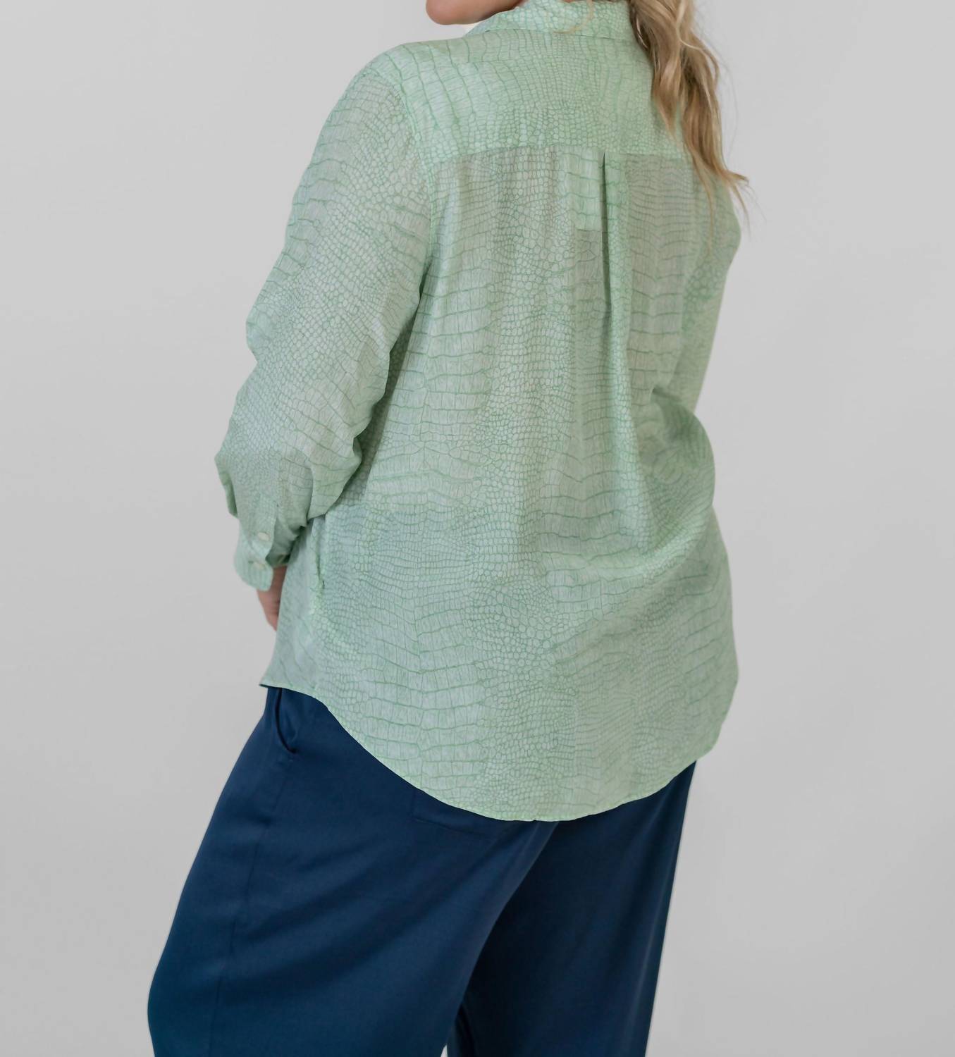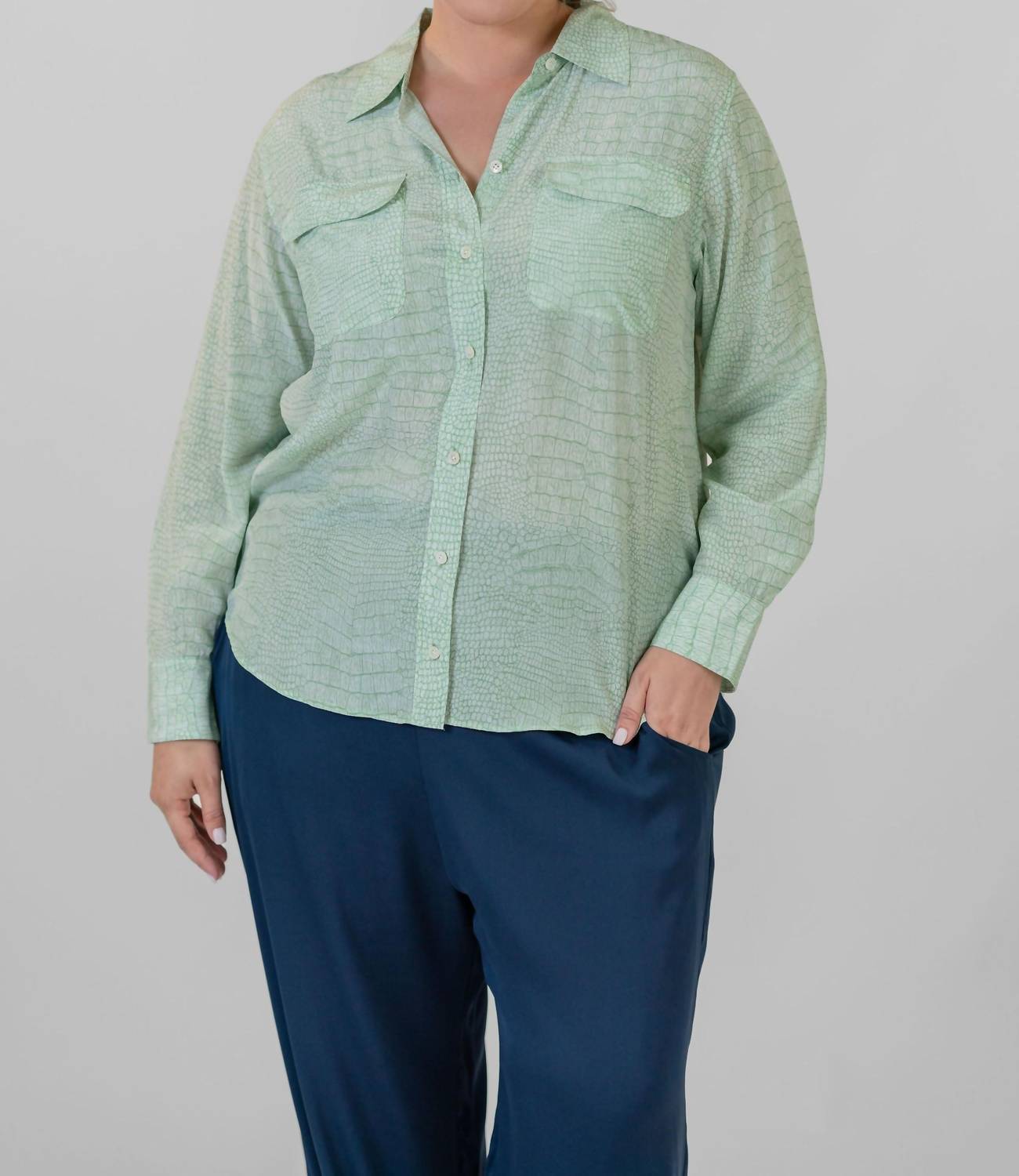 A classic button down shirt that will never go out of style. Experience timeless elegance with Equipment’s Slim Signature Button Down Silk Shirt in a sophisticated Jadesheen Green. This women's button-down shirt showcases long sleeves and a textured pattern, perfect for elevating your spring workwear or holiday party ensemble. Crafted from 100% luxurious silk, it features a collar neckline and two front pockets for added functionality. Closure: Button closure. Care: Dry clean only.