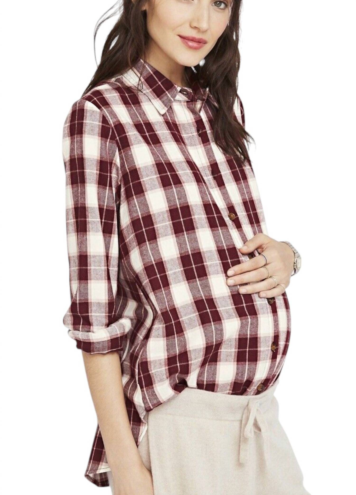 Perfectly tailored and soft to the touch. Embrace comfort and style with the Hatch Maternity Women's Flannel Button Down Shirt in Bordeaux. This long sleeve shirt is crafted from soft 100% cotton, featuring a classic plaid design that's both timeless and versatile. Closure: Button closure. Care: Machine wash. Ideal for a dinner party or casual gatherings.