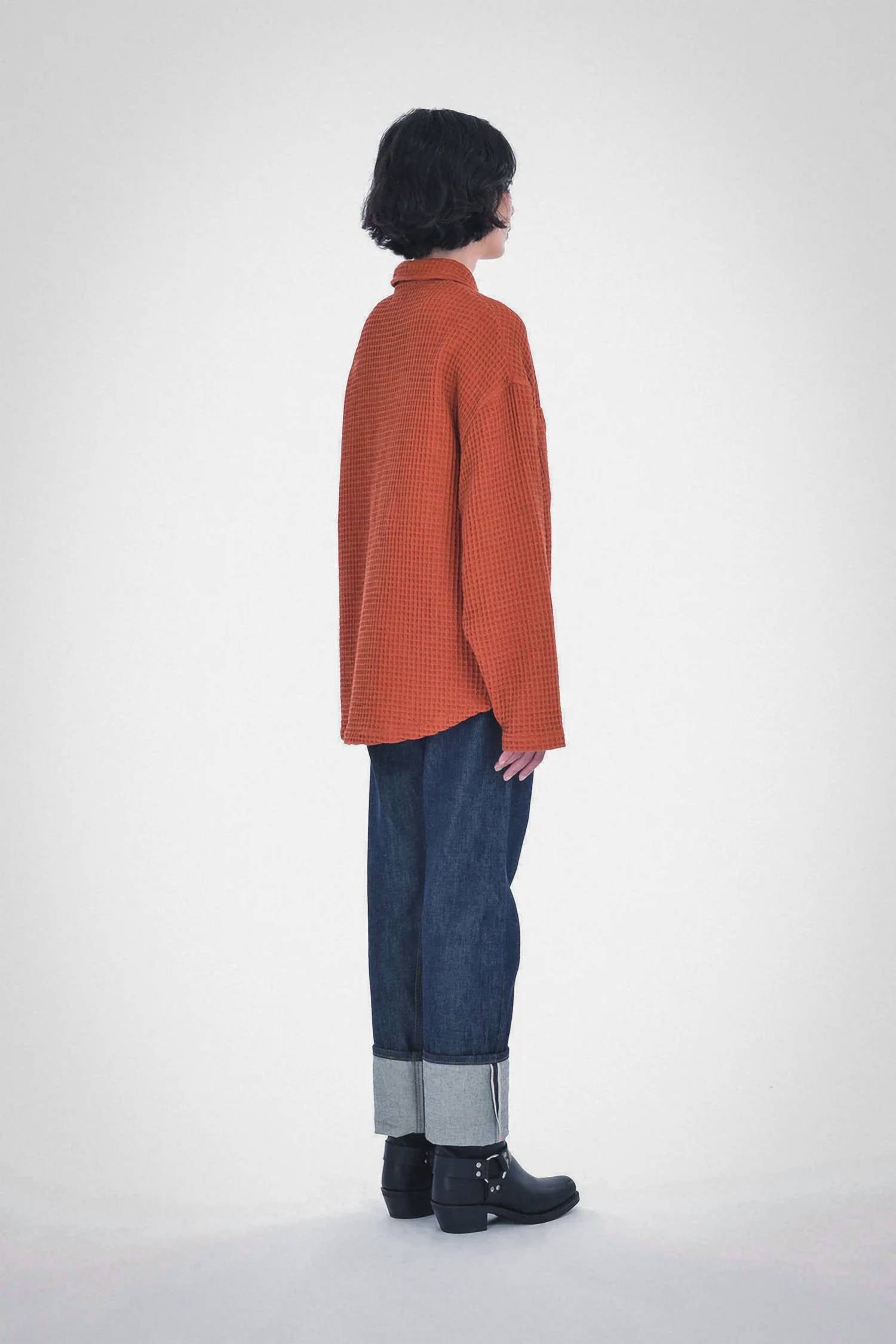 Long sleeves and crafted from 100% cotton. Feature is the large waffle knit pattern. Offering both a unique texture and visual allure. Designed with an oversized fit for a boxy, laid-back look. Features a classic collar and button closure. Care for this textured, flame-hued shirt by machine washing cold and avoiding bleach and tumble drying.