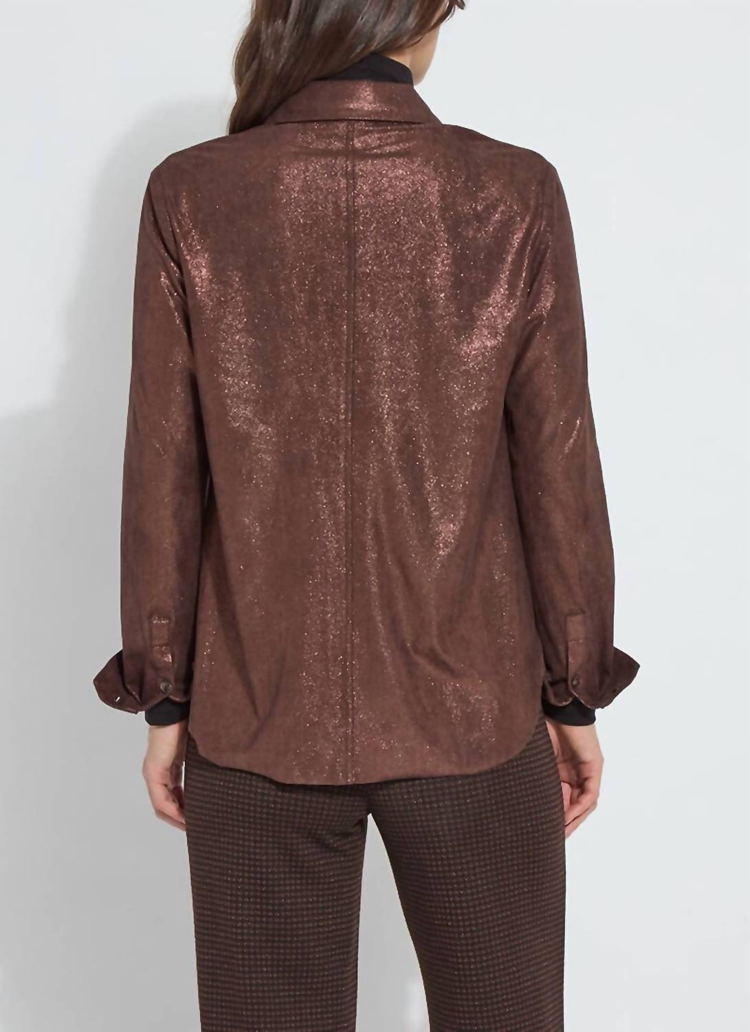 Perfectly tailored and soft to the touch. Introducing the Connie Patent Foil Vegan Suede Shacket by Lysse, a chic piece for your Fall wardrobe. With long sleeves and a sleek metallic copper sheen, this hip-length shacket exudes an effortlessly stylish vibe. Crafted from 90% polyester and 10% spandex, it features a button closure and is designed for easy maintenance with machine wash and tumble dry instructions. Its textured pattern and menswear collar make it ideal for both workwear and evening events. Model is 5'10" and wearing size S.
