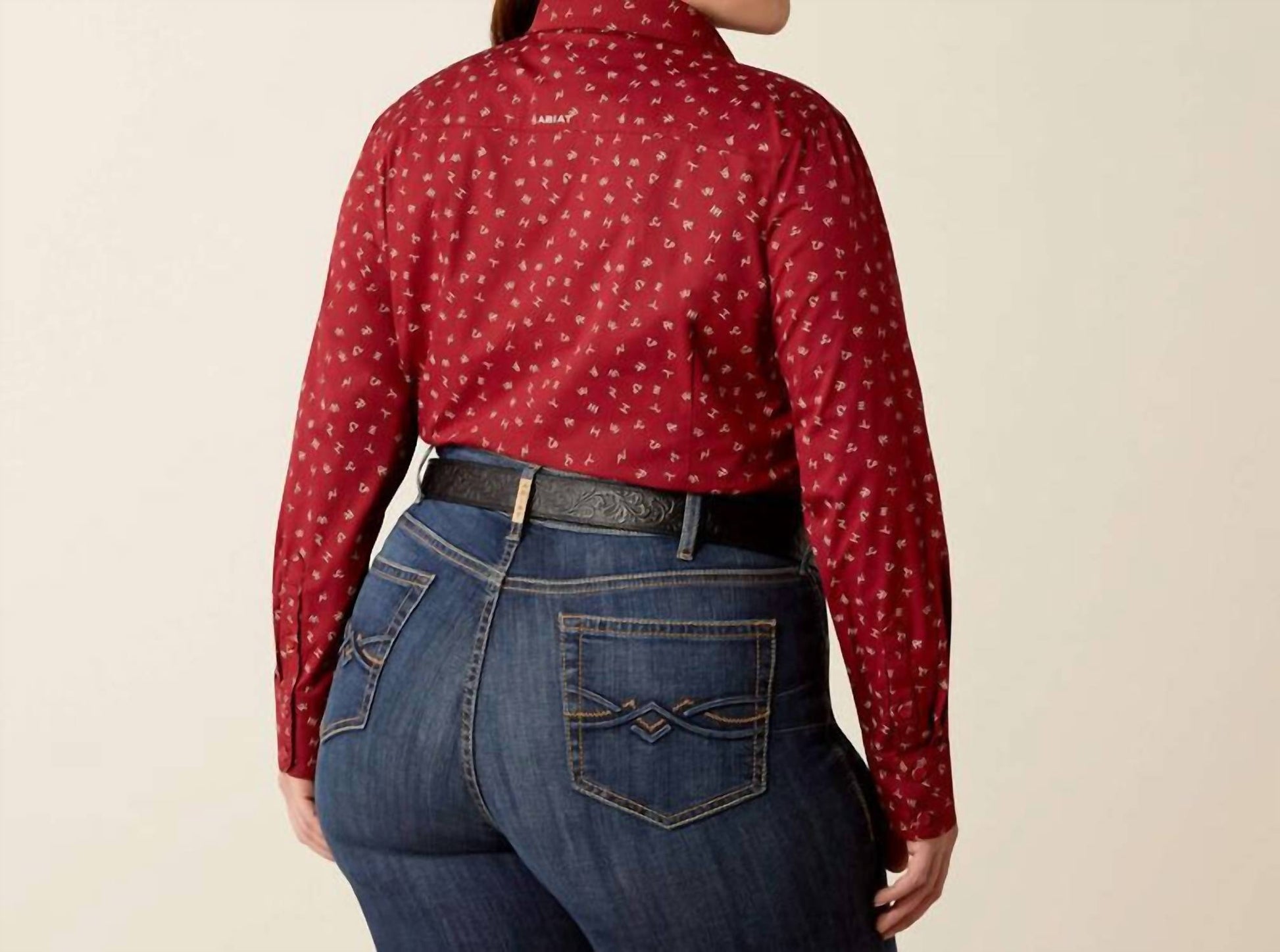 This button down shirt is comfortable yet polished. Introducing the Kirby Gia Cattle Brands Long Sleeve Shirt by ARIAT, a vibrant red button-down designed for style and functionality. This women's shirt features an eye-catching patterned design and a classic collar, complemented by practical pockets. Closure: Button closure. Perfect for a holiday party in the spring season.