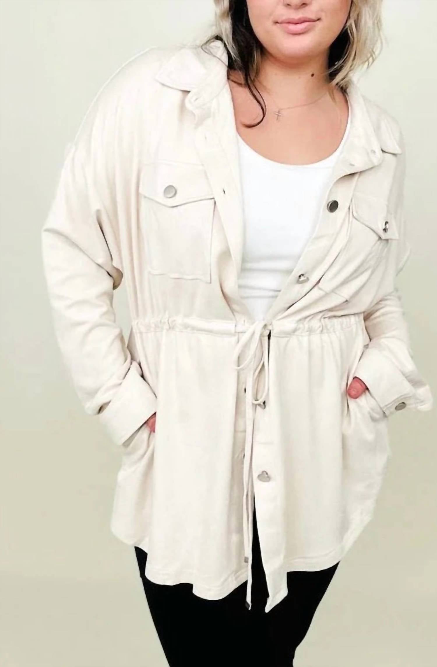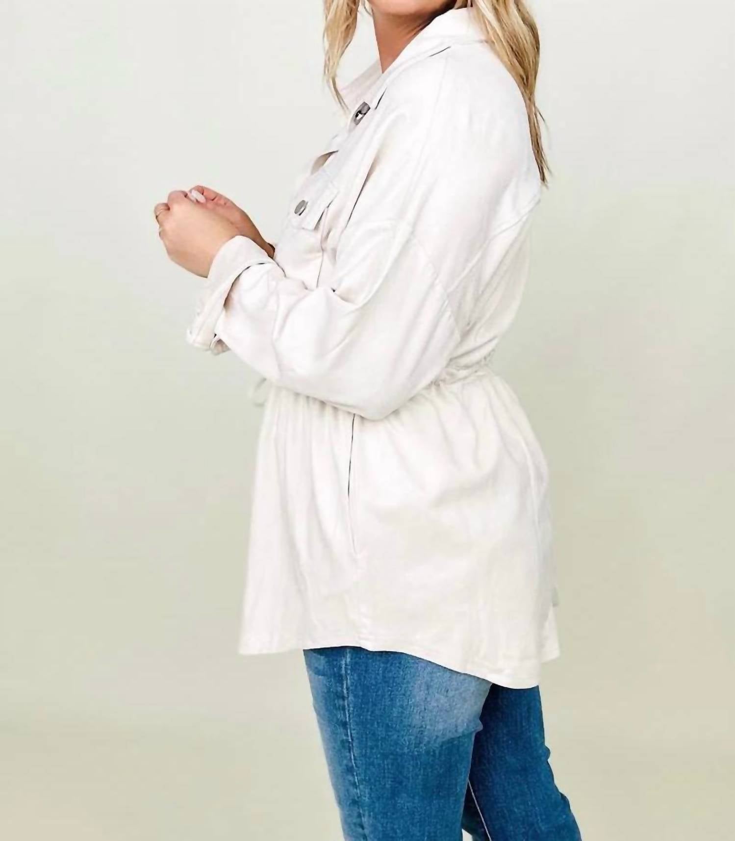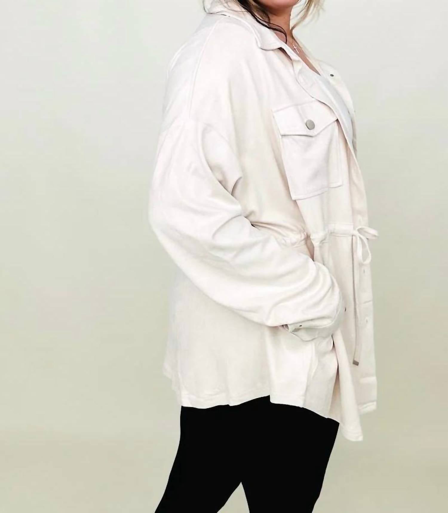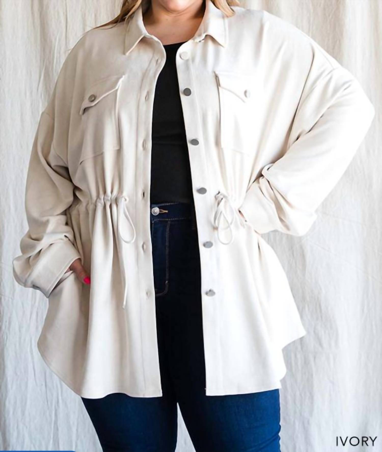 This button down shirt is comfortable yet polished. Elevate your casual wardrobe with the Faux Suede Shirt Jacket by Cotton Bleu, featuring long sleeves and a stylish drop shoulder design. This piece offers a cozy fit with slight stretch, and its classic button closure is accented by practical details like buttons, pockets, and a drawstring. Available in standard and plus sizes, this jacket is crafted from a plain, solid pattern in a versatile ivory color. Care is simple with the option for both machine and hand washing, just avoid bleaching to keep it looking fresh.