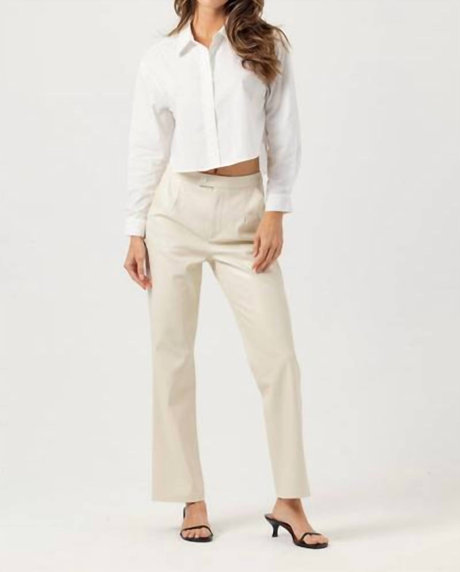 Tailored with a classic shirt collar and button front. Slightly boxy fit. Cropped length that finishes just below the belly button. An elevated pleat back detail. Machine wash cold with like colors, tumble dry low. 100% Cotton Poplin.