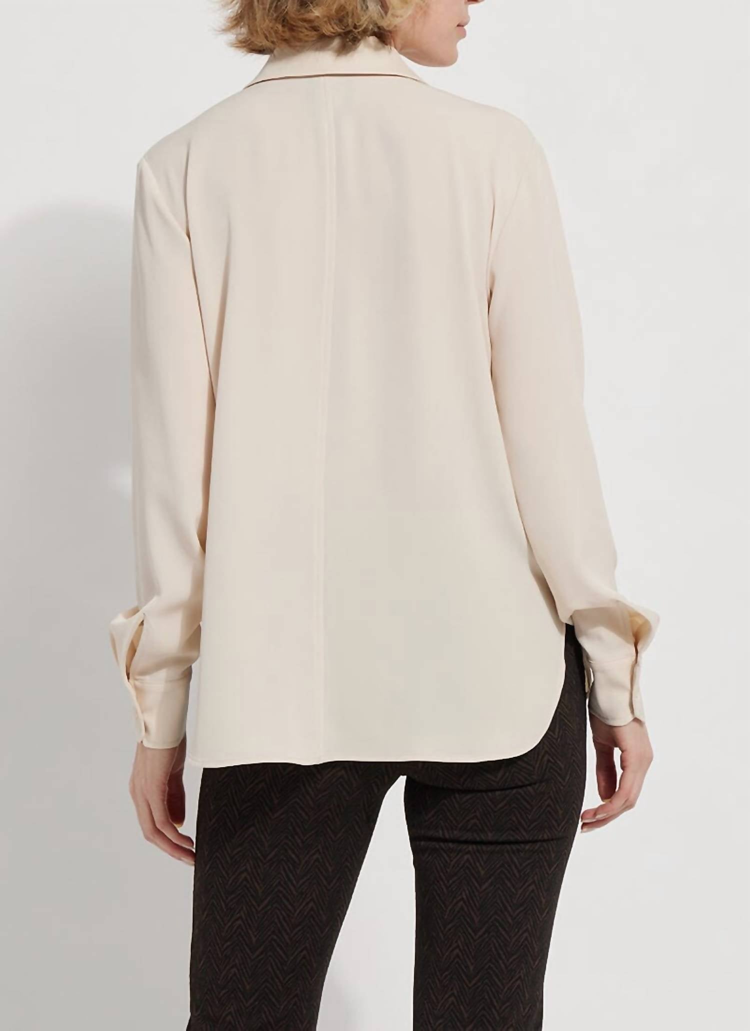 Offers a slimmer fit and curved, hip-length hem that tails longer in the back than front. Features a shirt collar and clean cuffs. 2-way stretch. Stretch Woven- 95% Polyester, 5% Spandex. Machine wash cold. Slim fit. Model is 5’10”, wearing size S.