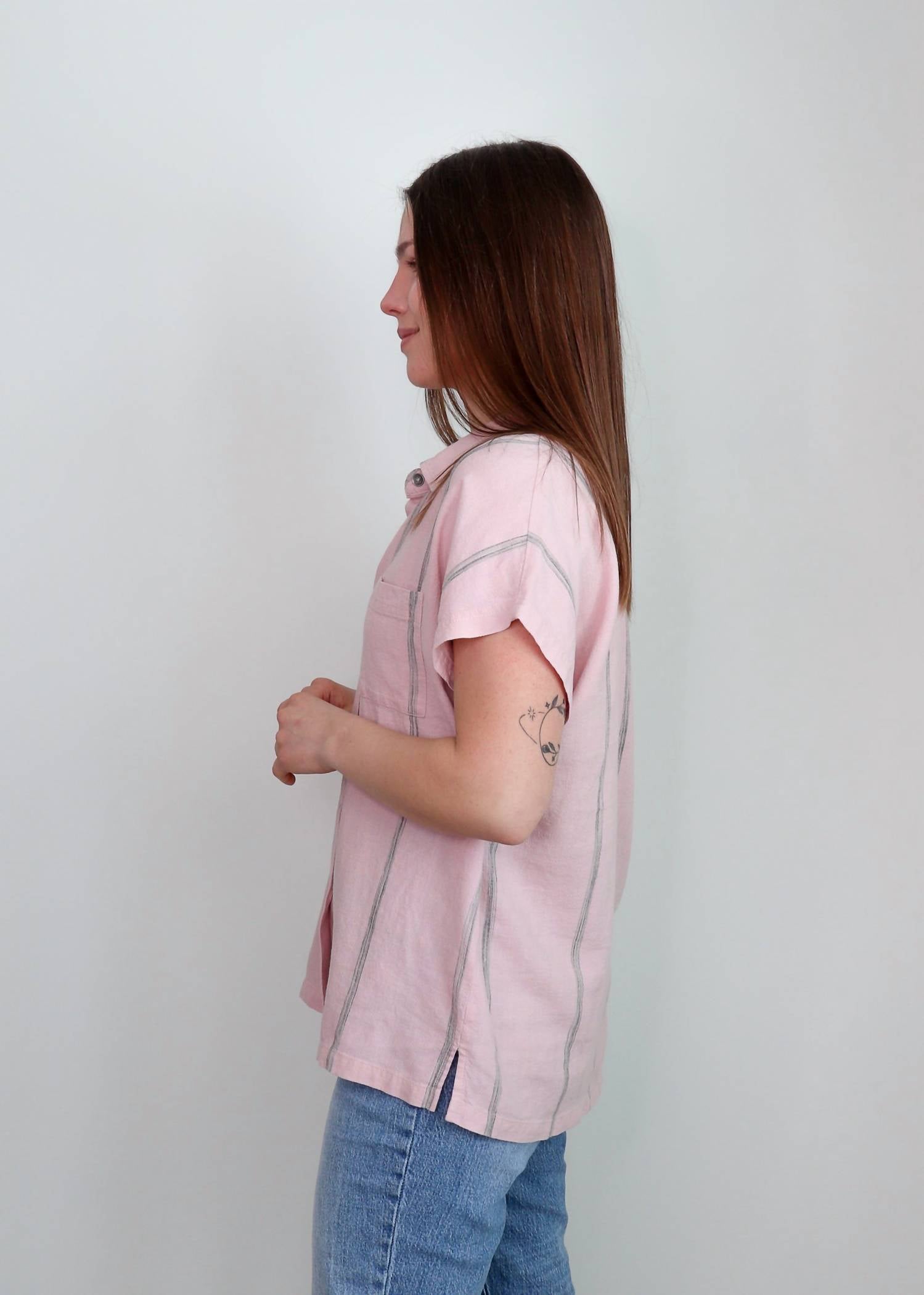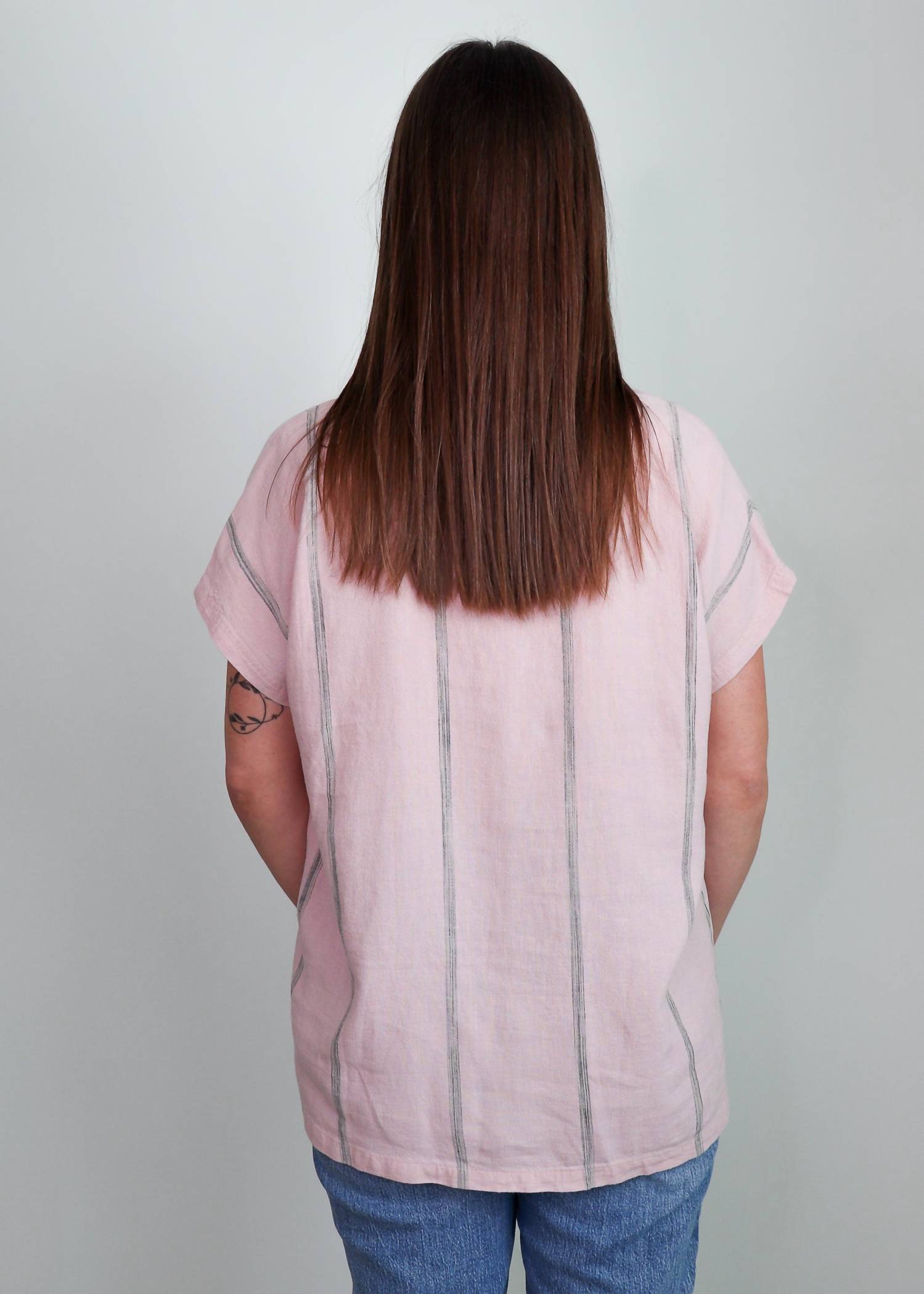 This button down shirt is comfortable yet polished. Introducing the Giada Short Sleeve Point Collar Button Front Shirt by Splendid in a charming Pink Stripe, perfect for your casual spring and summer wardrobe. Crafted from a Linen/Viscose blend, this shirt features a relaxed silhouette with a dropped shoulder design and a button closure. It falls effortlessly right below the hips, offering both style and comfort. For easy maintenance, simply machine wash and lay flat to dry. Model is 5'4" and is wearing a size small.