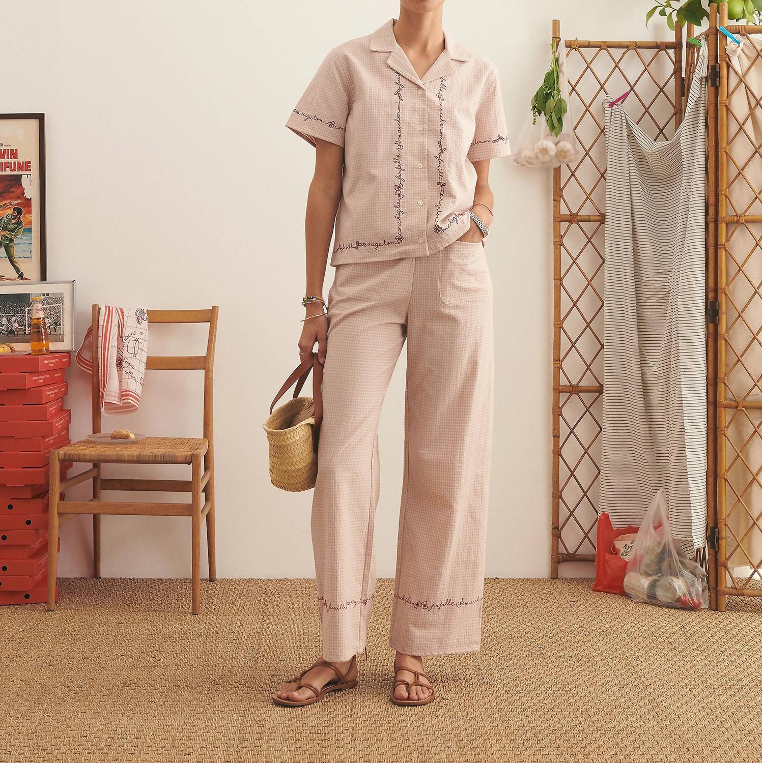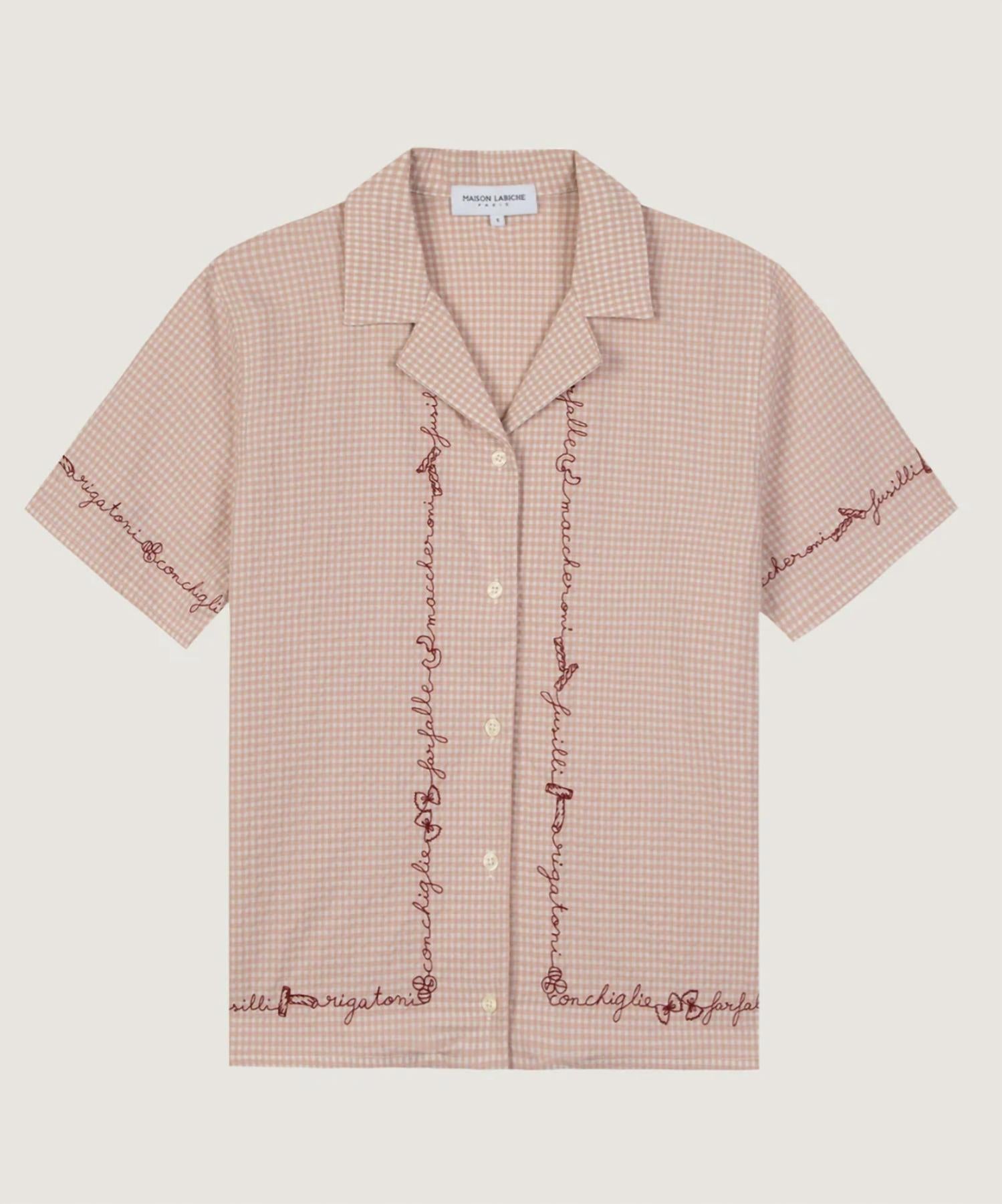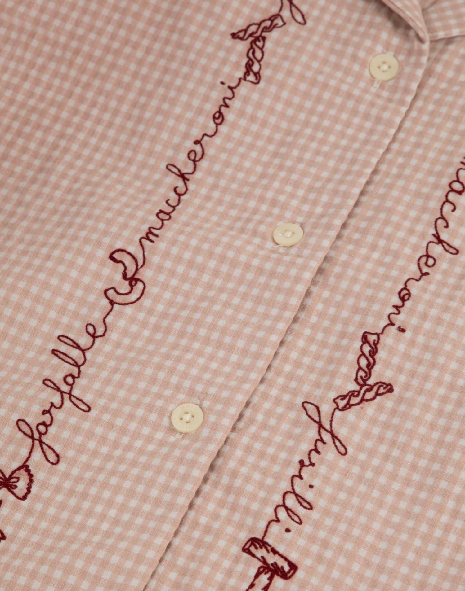 Perfectly tailored and soft to the touch. Introducing the Pasta Button Down Tee by MAISON LABICHE, a perfect blend of style and comfort for any vacation-ready wardrobe. This short-sleeve shirt, in a playful pink plaid & check pattern, features a classic button-down design with a collar neckline. Crafted from a cotton blend and adorned with embroidery for pasta enthusiasts, it reflects the brand's attention to detail. Made in Portugal, it offers easy care with machine wash instructions, ensuring practicality alongside 90s fashion flair. 60% cotton 40% polyester.