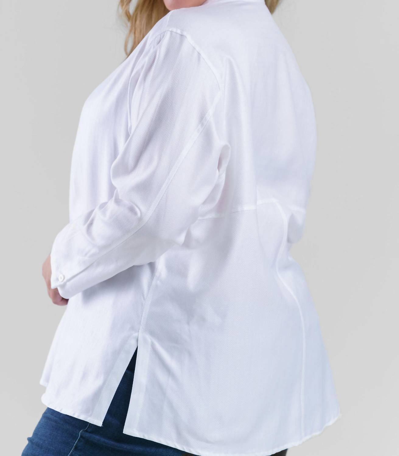 This button down shirt is comfortable yet polished. Featuring long sleeves and a classic stand collar, this button-down shirt offers a relaxed fit with a three-piece back and subtle side slits for a touch of elegance. Button closure.