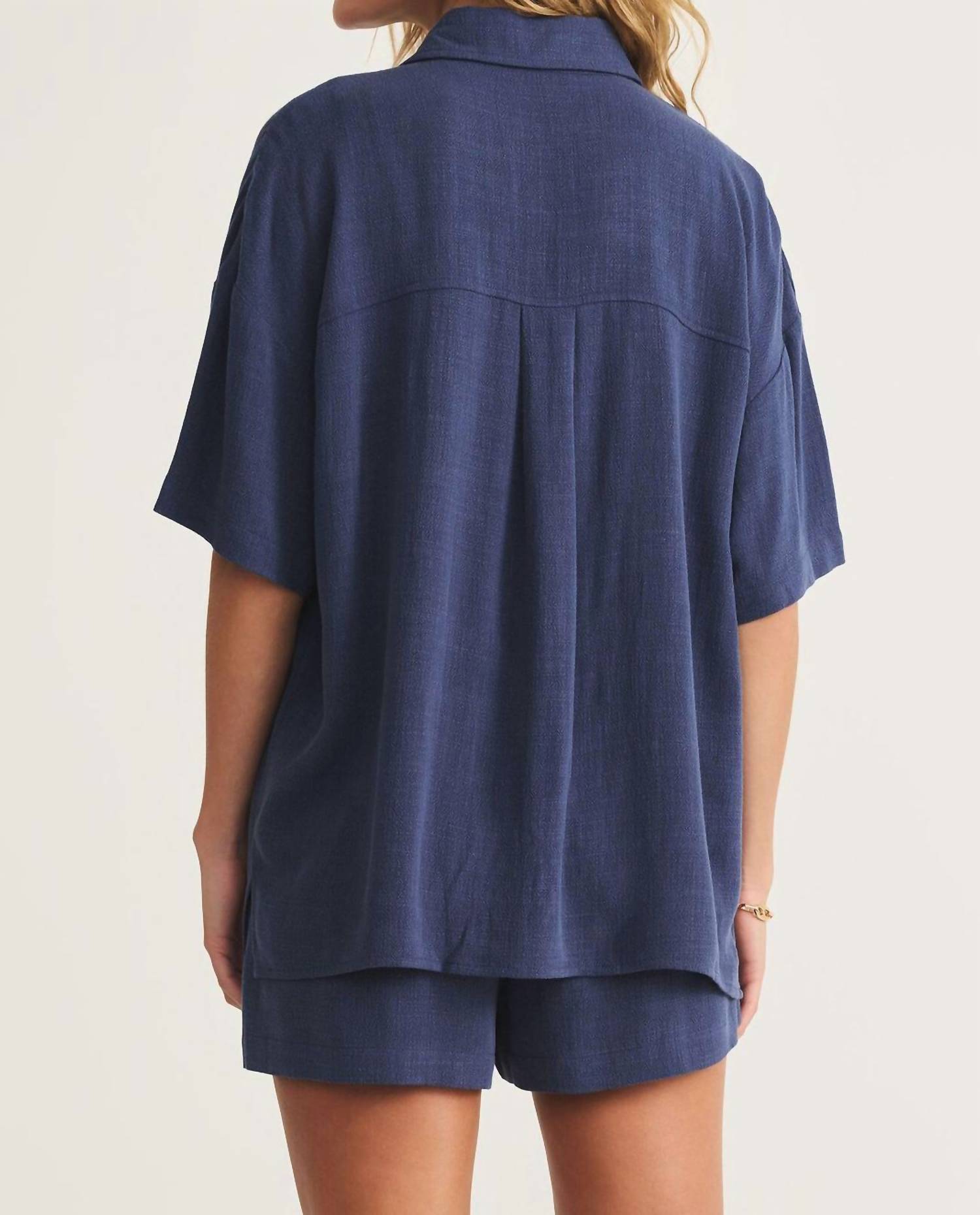 Perfectly tailored and soft to the touch. The Tinsley Button Up Shirt by Z Supply in Yacht Blue offers a chic and relaxed style with its classic collar and button closure. It features long sleeves and a composition of 86% Rayon and 14% Linen providing a midweight, soft-washed feel. Lengths range from 24.5" to 26" for a relaxed fit, complemented by practical side slits and an oversized front pocket. Model is 5'9.5" and wears size S, with bust measurements for a size S at 45".