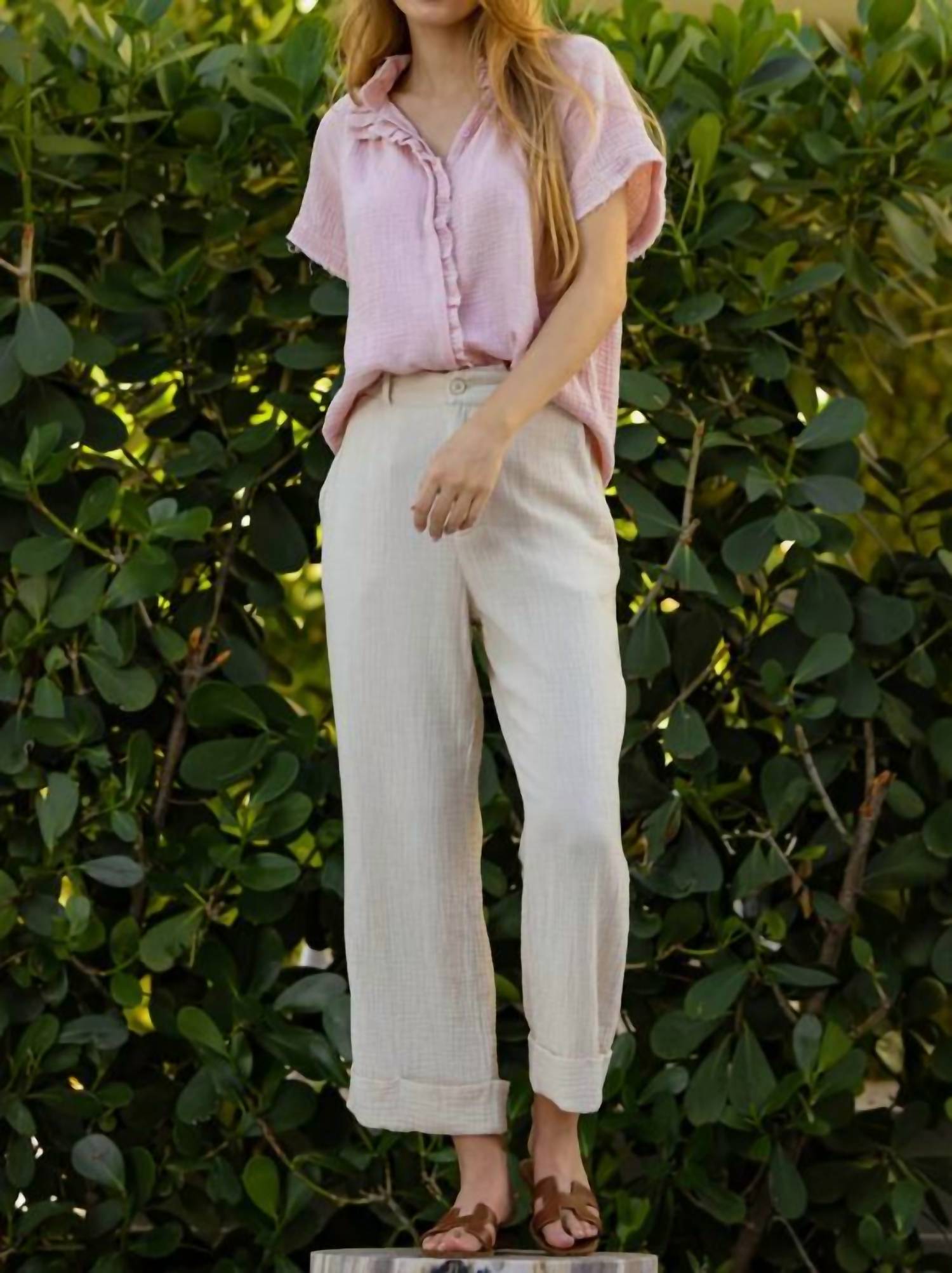 Leah is back and better than ever. With a relaxed-fit button-down shirt, Leah has a statement ruffle collar to elevate any look. She is made in our signature cotton gauze fabric and will add a  fresh update to your spring wardrobe. Complete the look with the Storm pants.