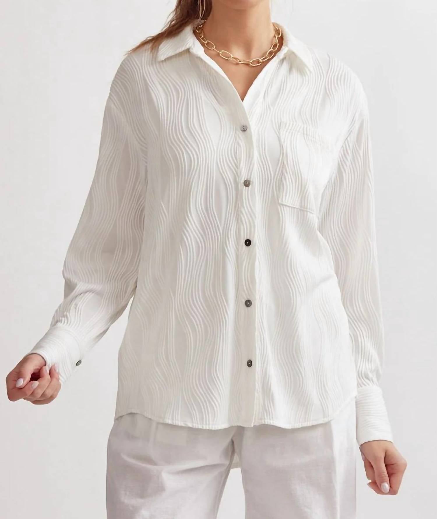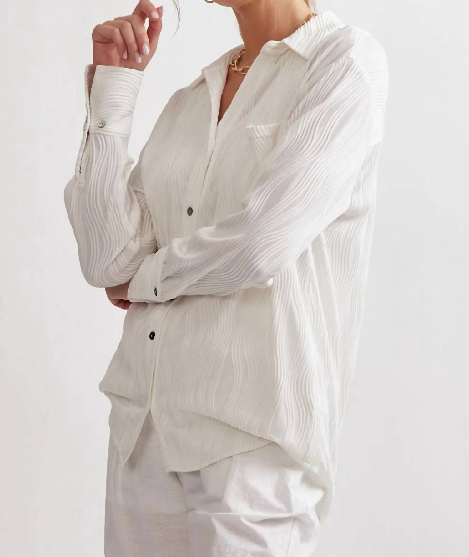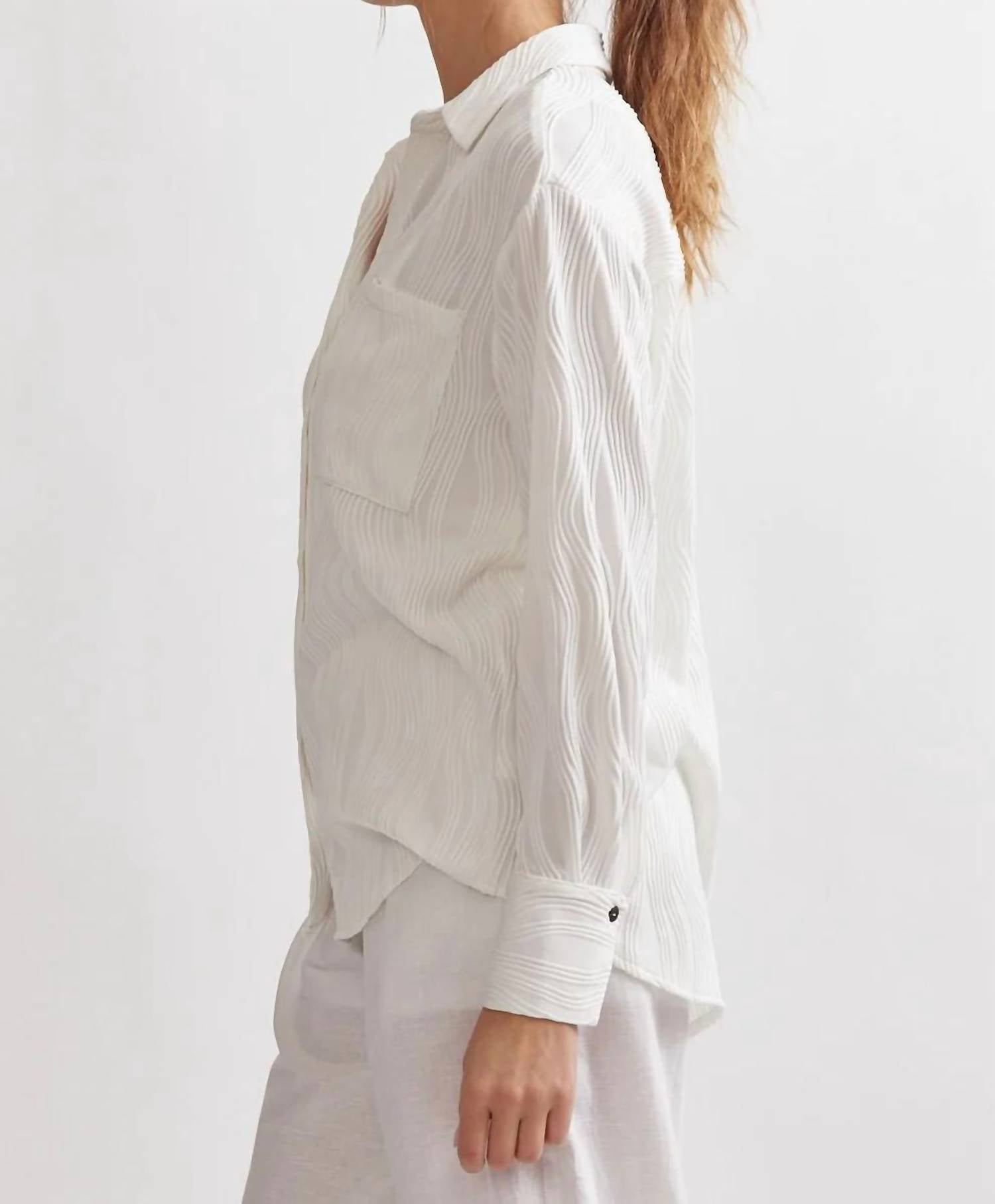 Perfectly tailored and soft to the touch. Chic addition to your minimalist travel wardrobe. Long sleeve button-up shirt in solid cream features a textured wave fabric paired with a classic collar, combining style with functionality. Made from 95% polyester and 5% spandex. Designed with pockets at the front for convenience. Care for this piece by hand washing it in cold water and hanging it to dry.