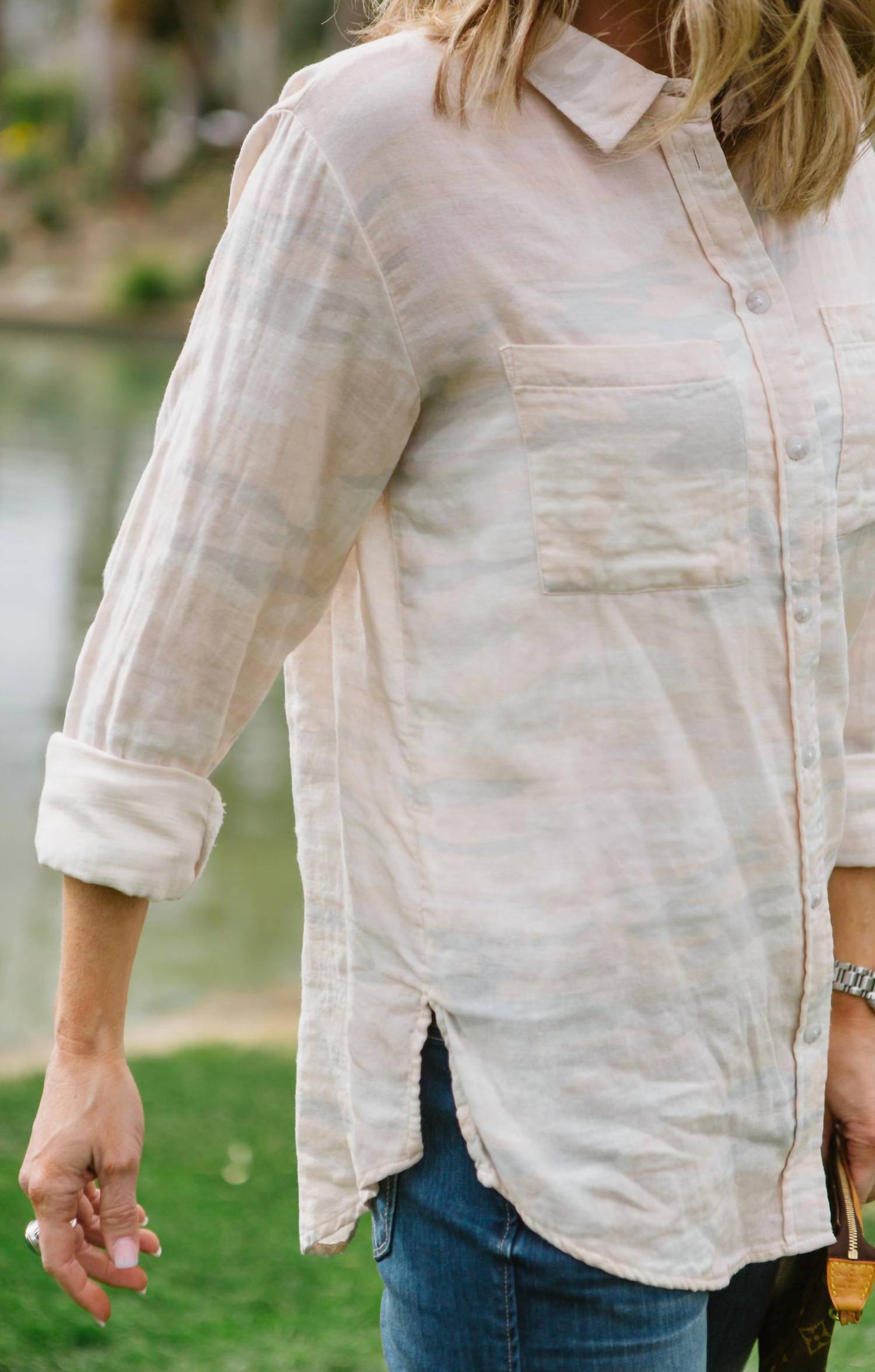 Details:Printed Button Front Boyfriend Shirt2 Front PocketsHigh Low HemLight weight materialSemi-sheerFront Length 28"Back Length 28"Sleeve Length 32 1/2"Model information:Height: 5'4"Bust: 32"Waist: 26"Hips: 32"Wearing size XSCare instructions:Wash on gentle cycle, coldNon-chlorine bleachLay flat or hang to dryLow iron if needed