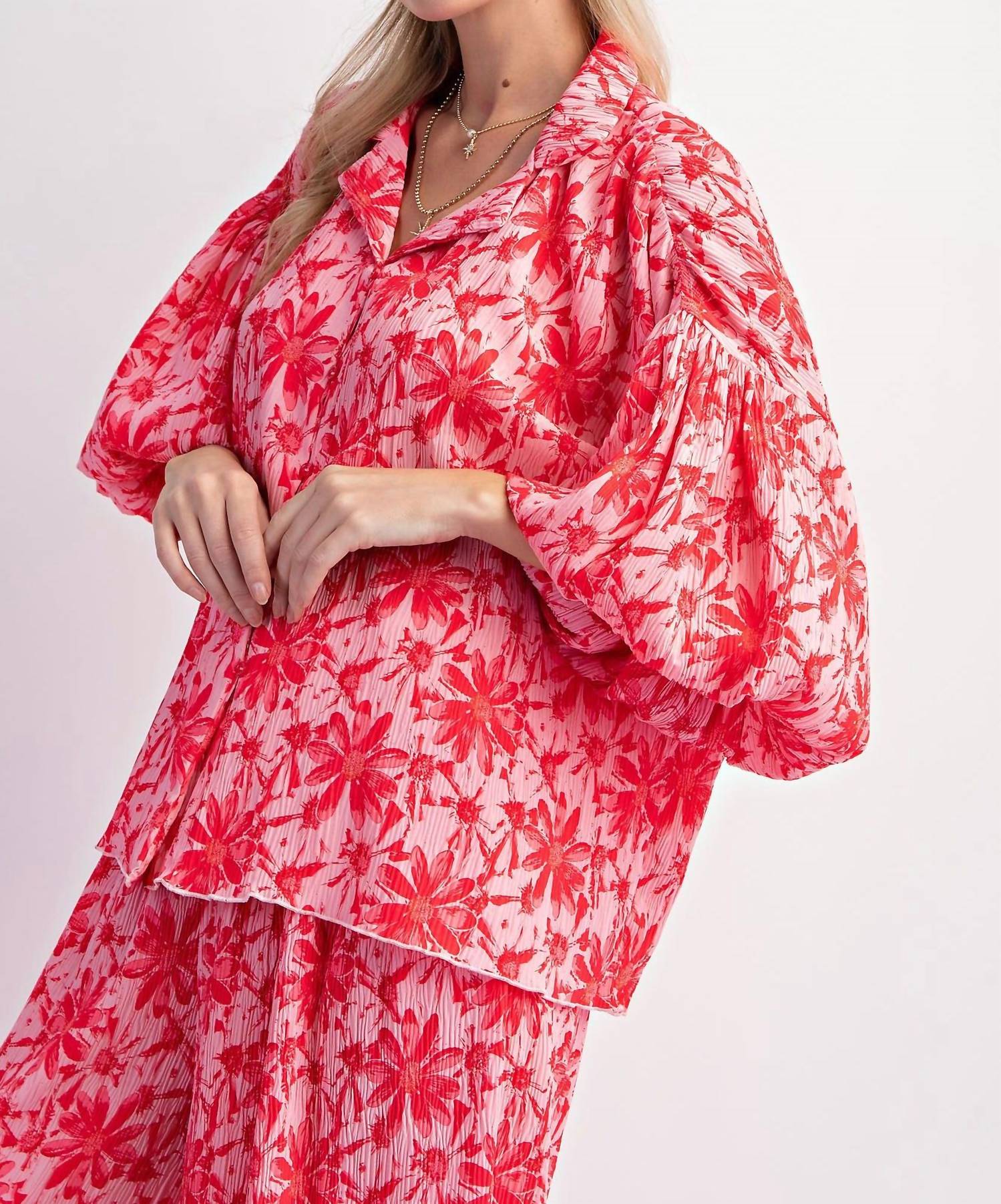 Vibrant shirt. Crafted from breezy crinkled Polyester. Floral print pops. Lapel-collared neckline and bubble sleeves. Loose, relaxed fit and comfortable dropped shoulders. Button down. Splash of cheerful elegance.