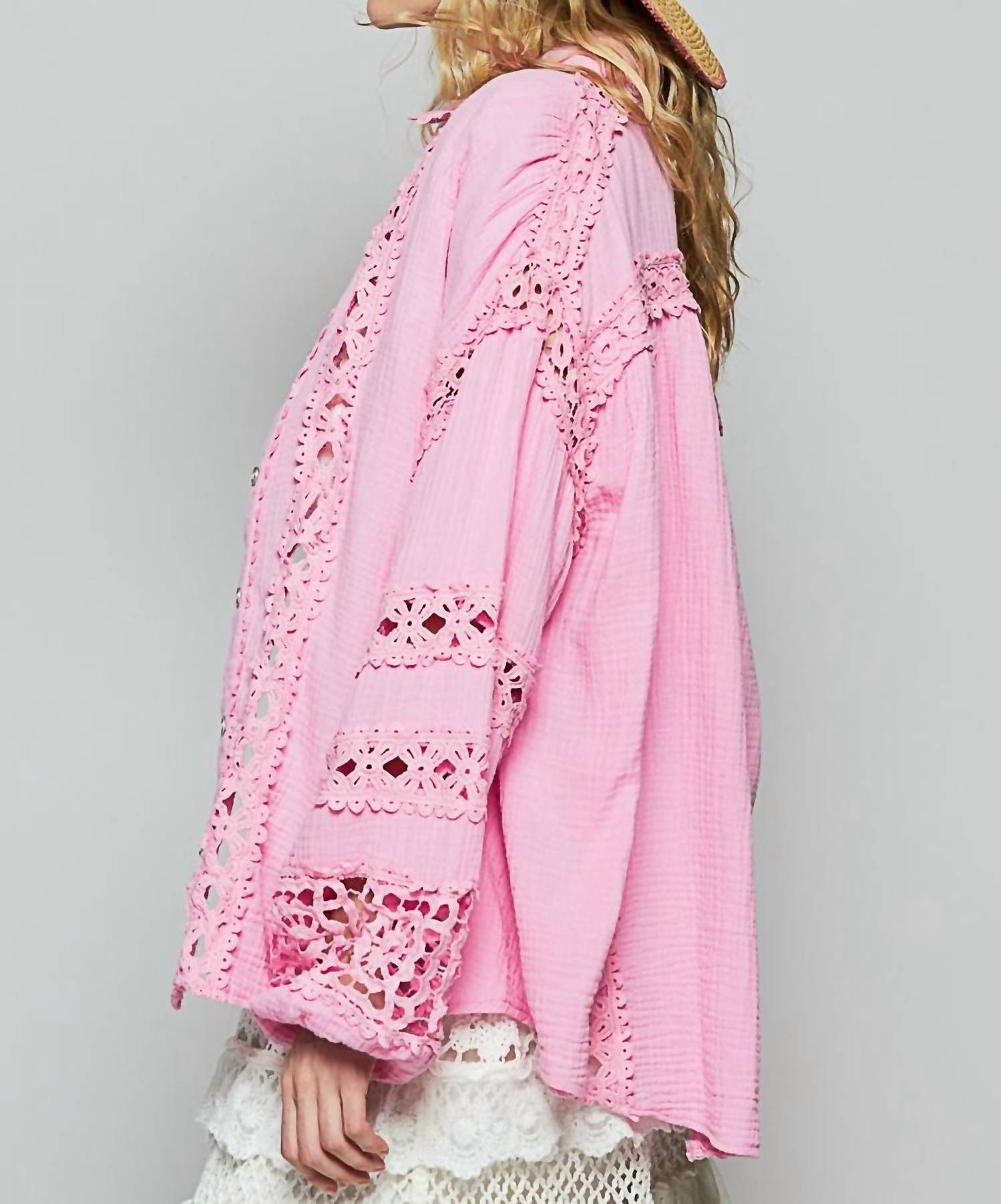 A classic button down shirt that will never go out of style. Embrace effortless style with the Crochet Lace Button Up Top by POL, a perfect addition to your summer wardrobe. This pink, button-down shirt features long sleeves and a collar neckline crafted from soft cotton for comfort. Designed with a relaxed fit, the see-thru trim detail adds a touch of elegance to its solid color. Care instructions include machine washing and line drying for easy maintenance.