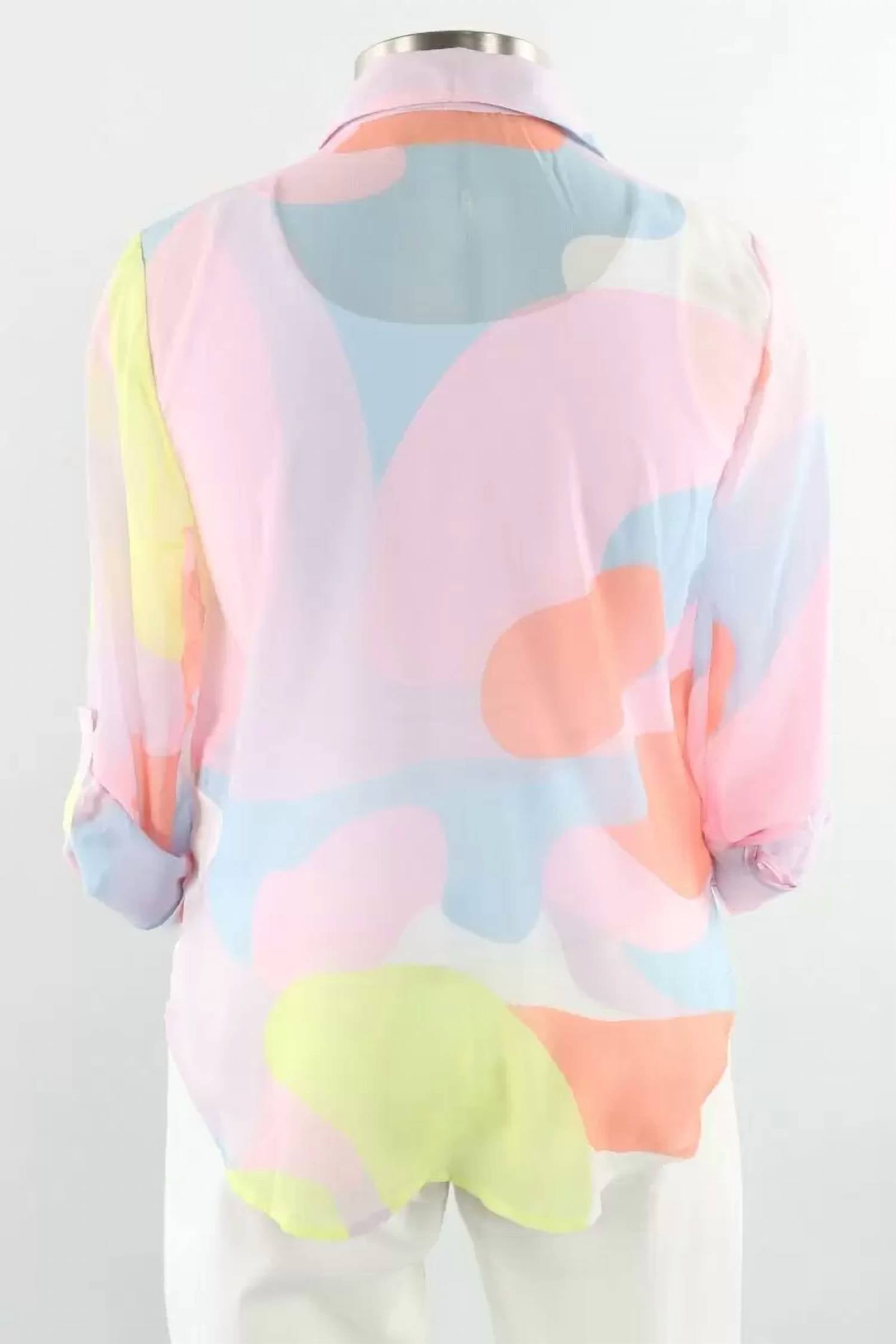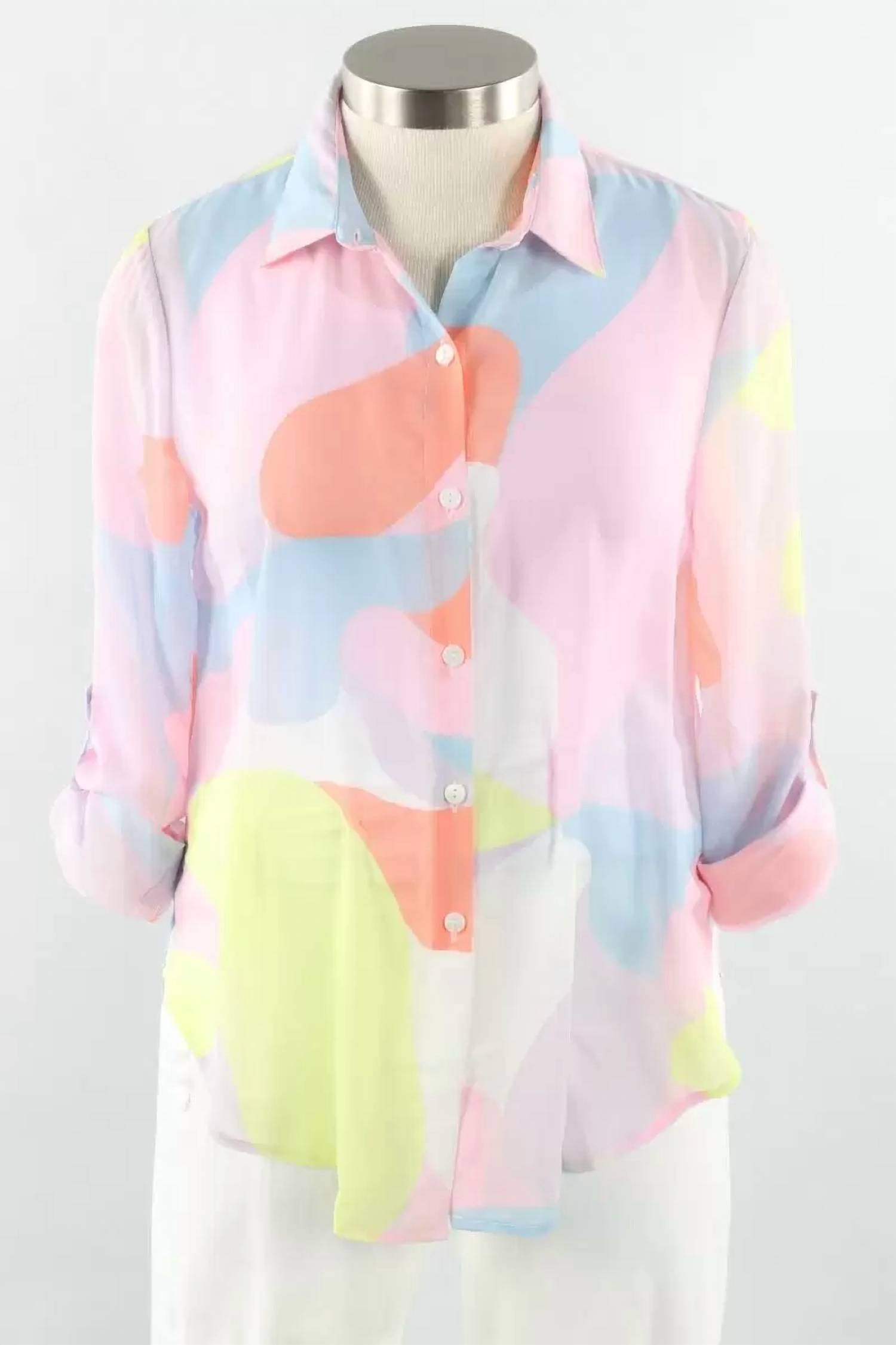 Perfectly tailored and soft to the touch. Discover the perfect blend of comfort and style with the Women's Long Sleeve Shirt by CHARLIE B, featuring a playful graffiti color for a unique look. This shirt is crafted from 100% polyester with long sleeves and buttoned cuffs, complemented by a classic lapel collar and a front button closure. Designed with side vents at the shirttail hemline for ease of movement, the small size measures 38" in bust and 29" in length. Care is simple: machine wash gently and hang to dry.