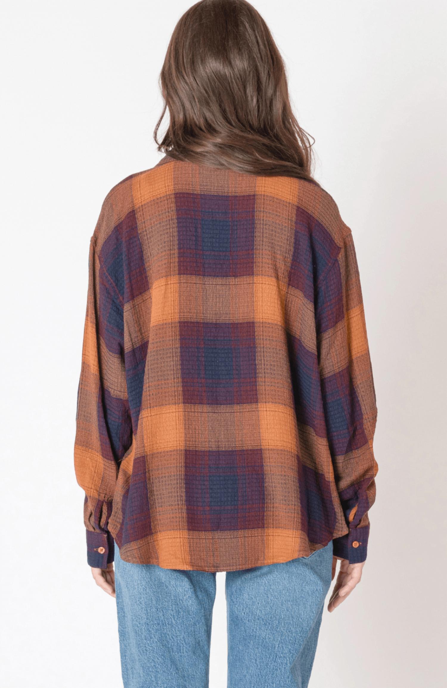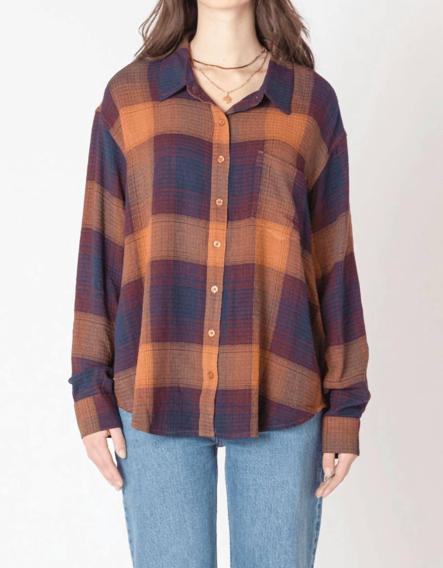 A classic button down shirt that will never go out of style. Introducing the Aria Plaid Button Down by Dex, a staple for cozy, effortless style this fall. This women's shirt in rust and navy features long sleeves with button cuffs and a classic collar. It offers a relaxed, easy fit with a convenient button-front closure and a chest pocket detail. Ideal for layering over a tee or pairing with denim, this plaid & check patterned top is perfect for Thanksgiving travel or embracing 90s fashion trends.
