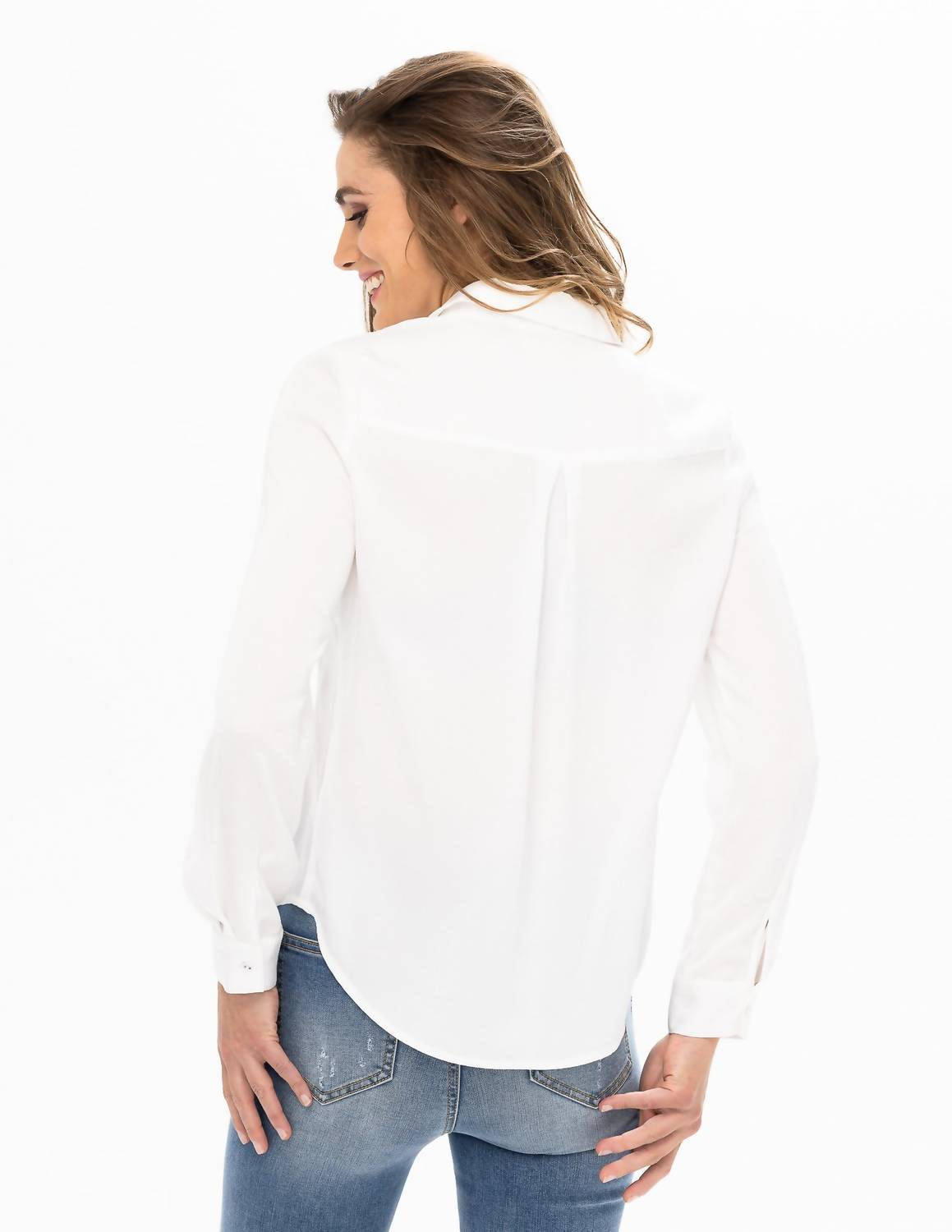Renuar presents the elegant Long Sleeve Collared Airflow Blouse in a sophisticated creme hue, perfect for versatile styling. Crafted entirely from polyester, this blouse offers a breathable comfort that's ideal for everyday wear. It boasts a classic button closure and a collared neckline, with a garment length of 26 inches for a flattering fit. Designed with long sleeves for a sleek look, this solid-pattern piece is conveniently machine washable.