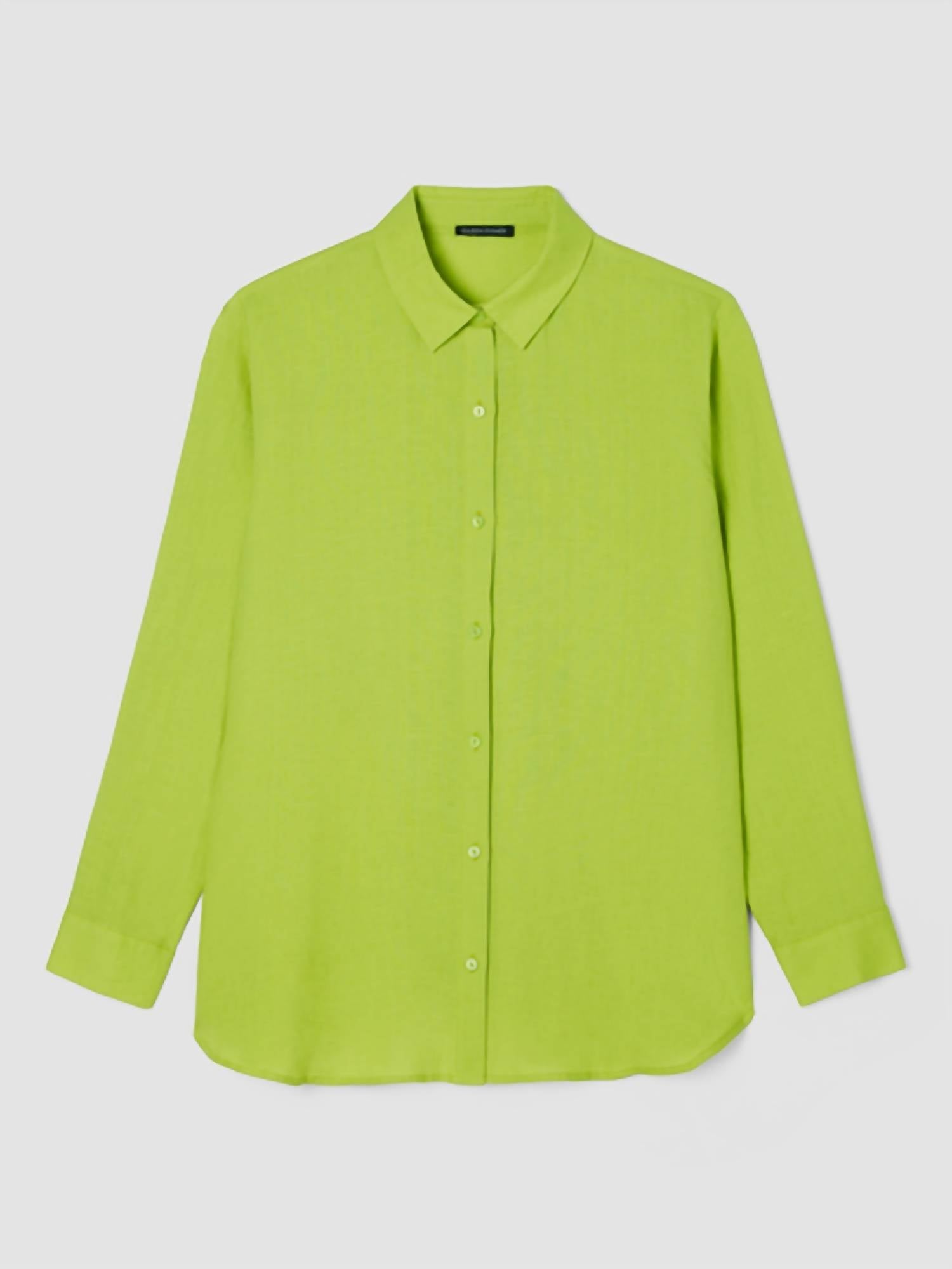 This button down shirt is comfortable yet polished. Buttoned up, but never stuffy. The classic collar shirt—an essential shape with a stepped hem, in crisp organic linen. Made in a Fair Trade Certified™ factory. Style No. S5OLA-T6368 Close at the shoulders, wider at the hem. A silhouette that fits the body with ease. Start with the Foundation. This shirt is designed to be worn on repeat. It’s part of our system of dressing that lets you do more with less. Select colors may vary by store. White shirt only available in stores. Bo Bay is 5'9" and wears a size XS, which measures 28 1/2 inches in front and 29 1/2 inches in back. Size PS measures 27 inches in front and 28 inches in back. Size 1X measures 31 1/2 inches in front and 32 1/2 inches in back. Classic collar, button front and button cuffs with double pleat. Back yoke with center back box pleat. River shell buttons.
