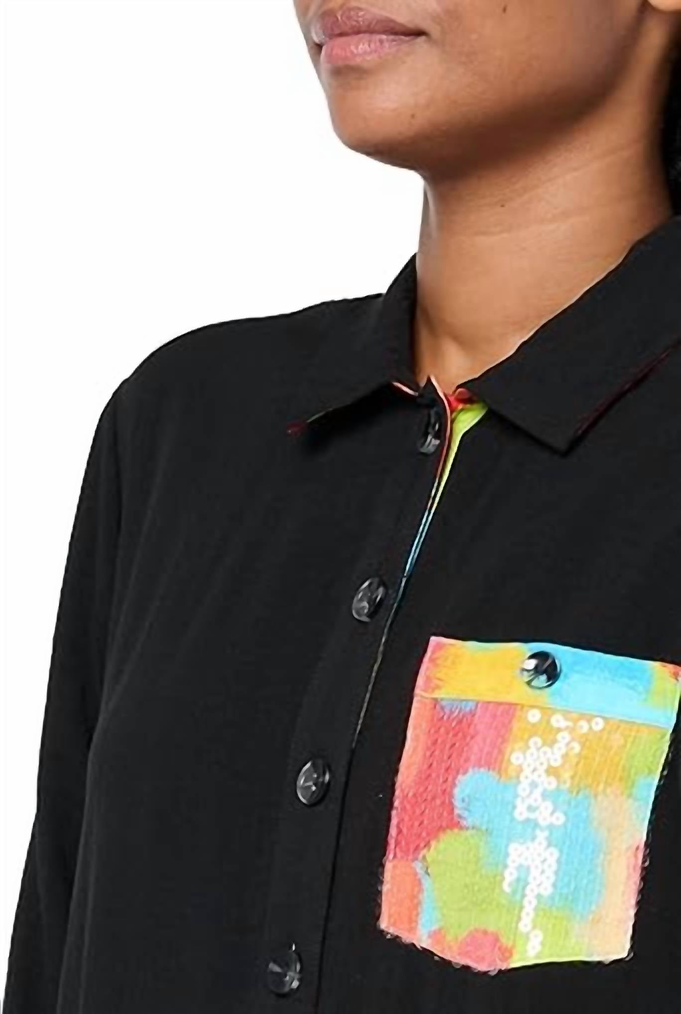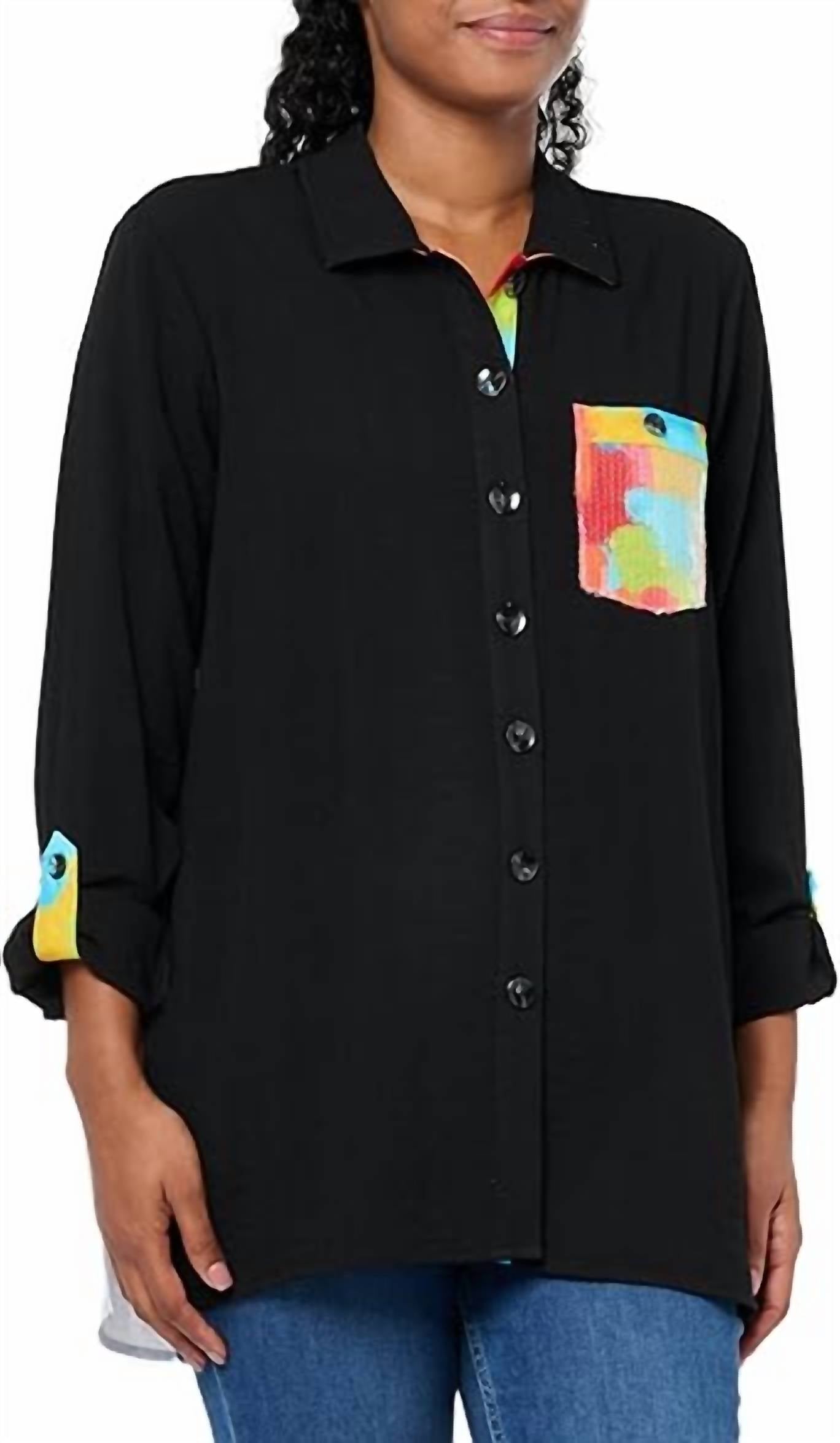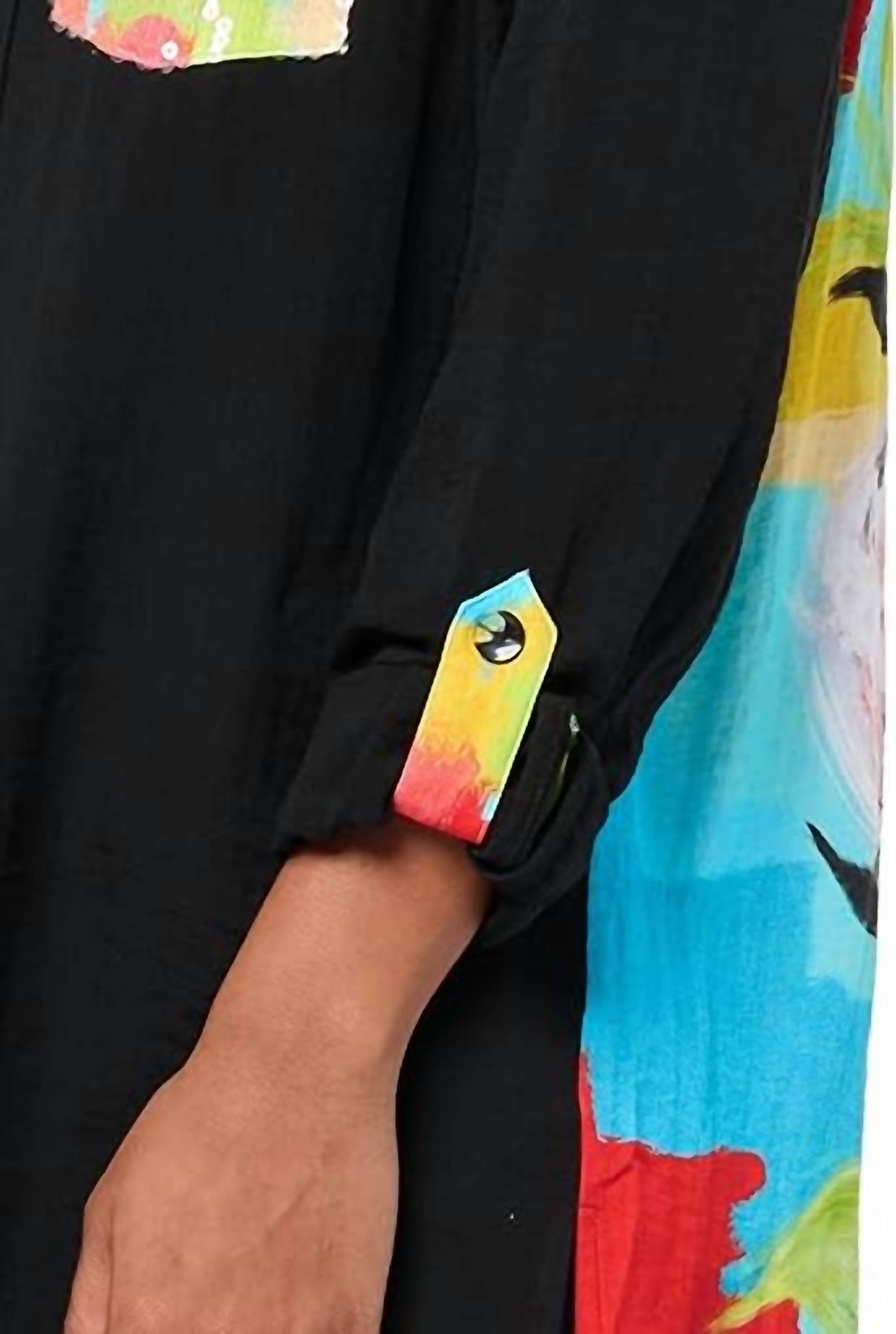 A classic button down shirt that will never go out of style. Elevate your wardrobe with the Colorful Accents Roll Tab Top by Multiples, a striking item featuring long roll-tab sleeves and a vibrant floral pattern on the back. Composed of 80% rayon and 20% nylon, this versatile piece can double as a jacket with its charming colorful accents in shades of blue, red, yellow, and green. It offers a classic collar and convenient button closure, ideal for layering over a tank such as the Multiples scarlet. Easy to care for, this top requires a machine wash inside out, making it both stylish and practical for any occasion.