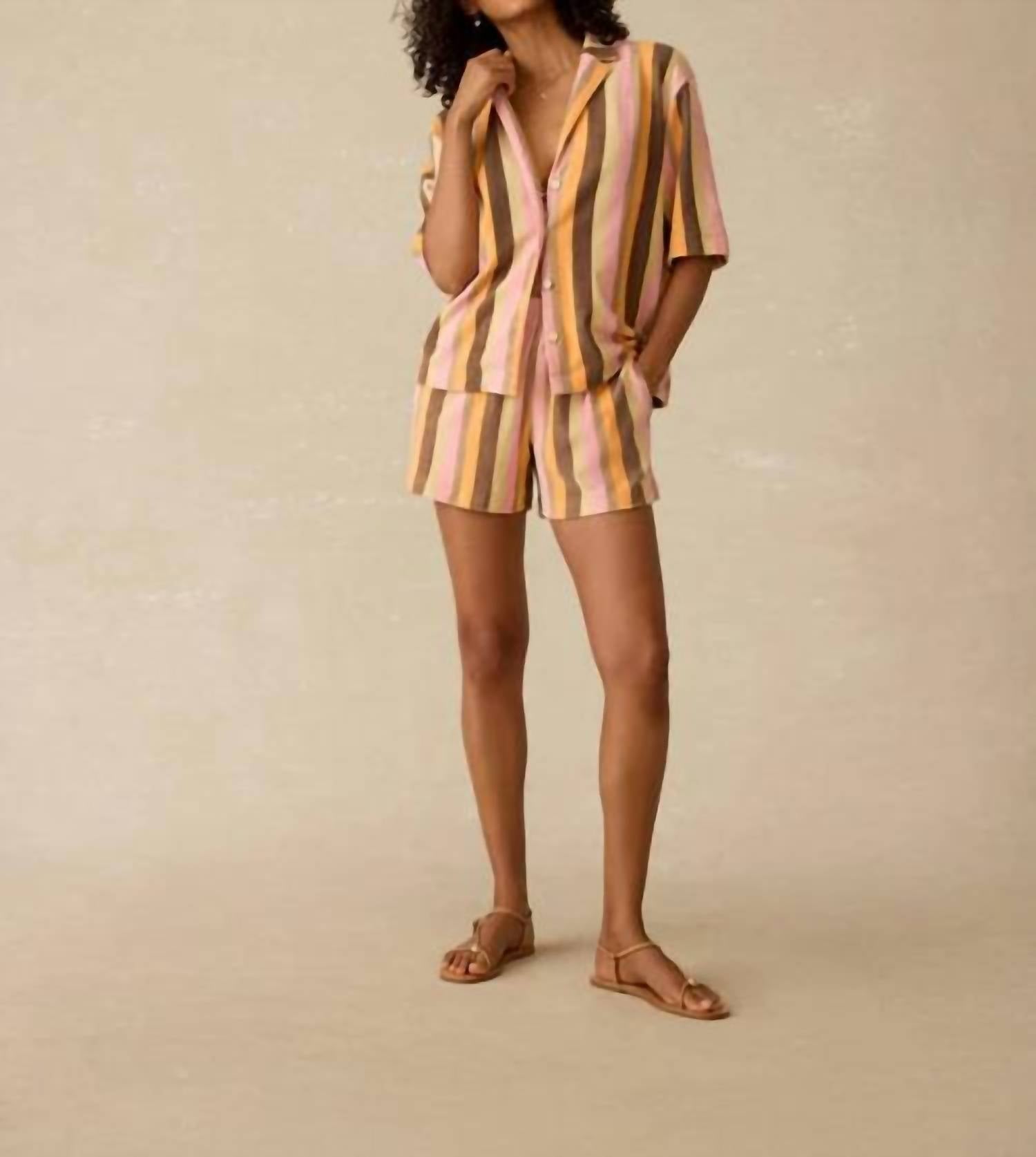 A classic button down shirt that will never go out of style. Introducing the Faherty Cabana Towel Terry Camp Shirt in Sun Kissed Stripe, perfect for lazy weekends, poolside lounging, or soaking in the sun. This shirt features elbow sleeves, crafted from 100% organic cotton with a relaxed fit and a cropped length of 24.75 inches. Its design boasts a stylish camp collar with a functional placket and coco buttons. Care instructions include turning inside out, machine washing cold with like colors, using a gentle cycle, and tumble drying low; a cool iron can be used if necessary. Model Angelica is 5’10" and wears a size small.