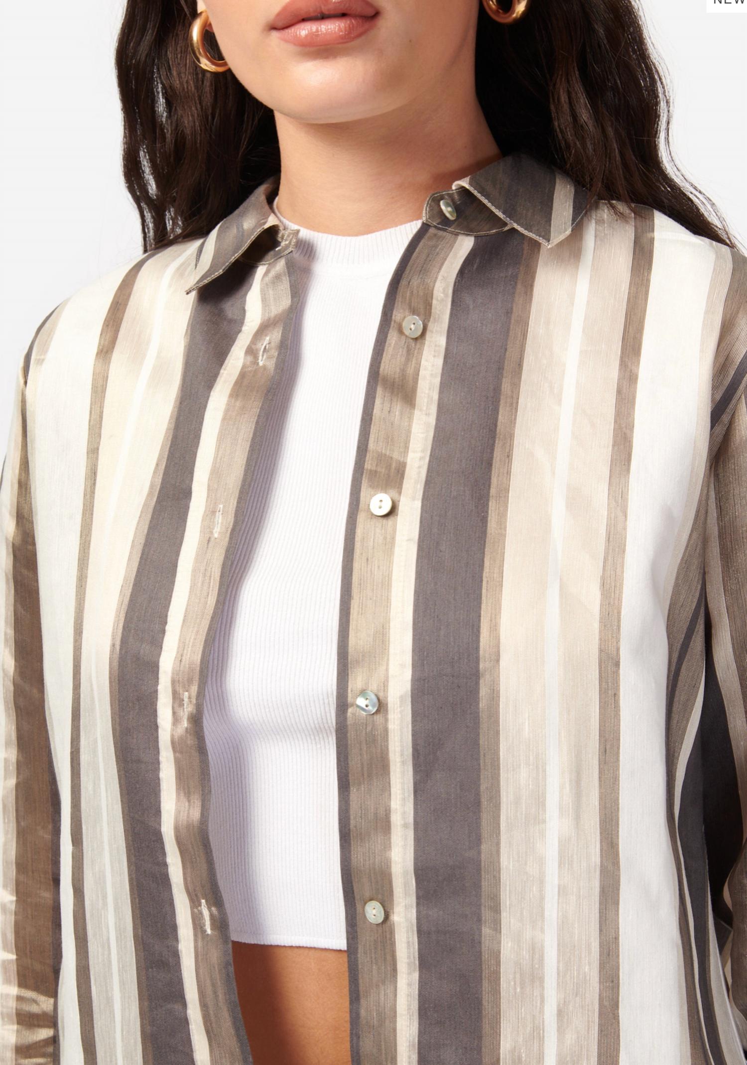 A classic button down shirt that will never go out of style. Metallic striped linen. Relaxed fit, long sleeve button down. Shell buttons at center front and cuffs. Dry clean & steam only. 50% linen, 38% polyester, 12% cotton. Imported. Style #: U24-T06.