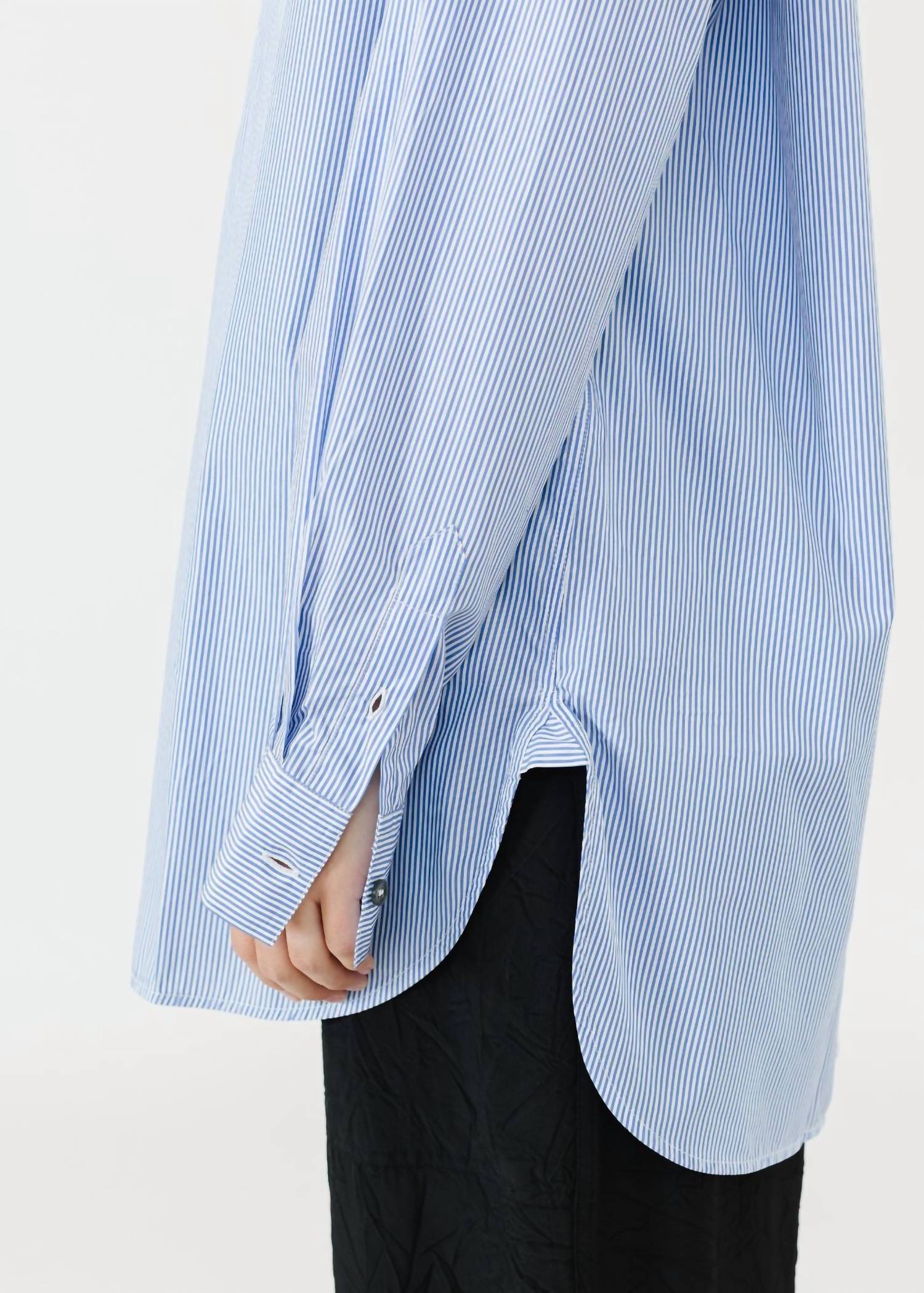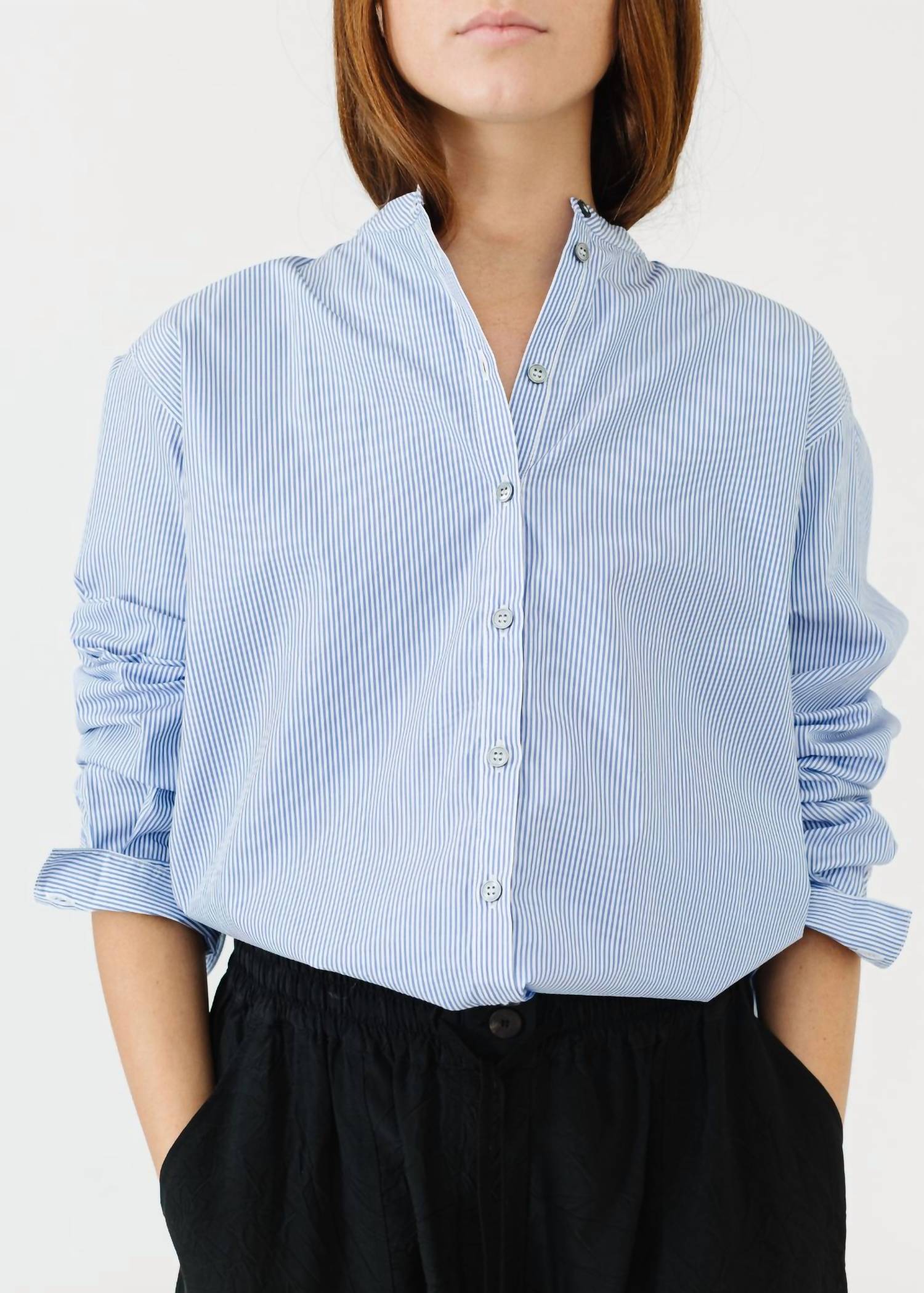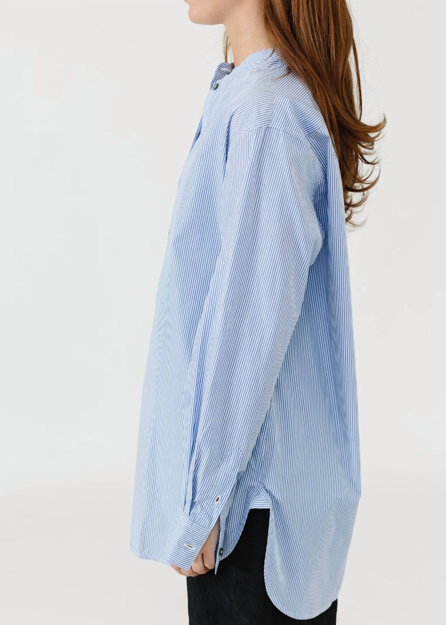This button down shirt is comfortable yet polished. Introducing the Cici Banker Stripe Shirt by Studio Nicholson, a masterful blend of classic style and modern comfort. This long sleeve shirt is made from 100% cotton and features a grandad collar with a three-quarter length placket. The design includes buttoned cuffs, a curved hem with triangle side gussets, and a rear box pleat for a refined look. Closure is managed by a button closure, and it is recommended to handle with a delicate wash and warm iron.