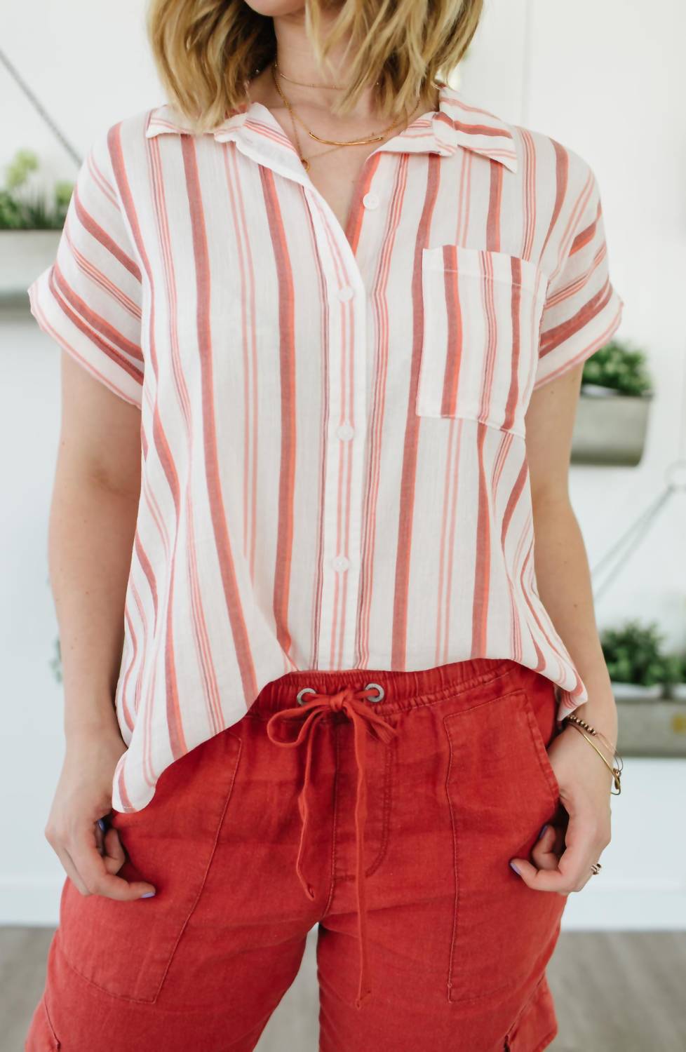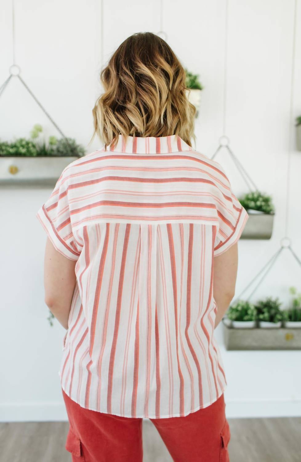Details:CollarFull button frontCap sleeves with cuffStripped patternRelaxed, boyfriend fitSingle front pocketSide slit detailsSemi-sheer fabricPerfect for the office or the weekendModel Details:Height: 5'7"Bust: 37"Waist: 29"Hips: 41"Wearing size MCare Instructions:Hand wash cold or gentle cycle Wash with like colorsDo not bleachTumble dry low heat or hang dryLow iron if needed