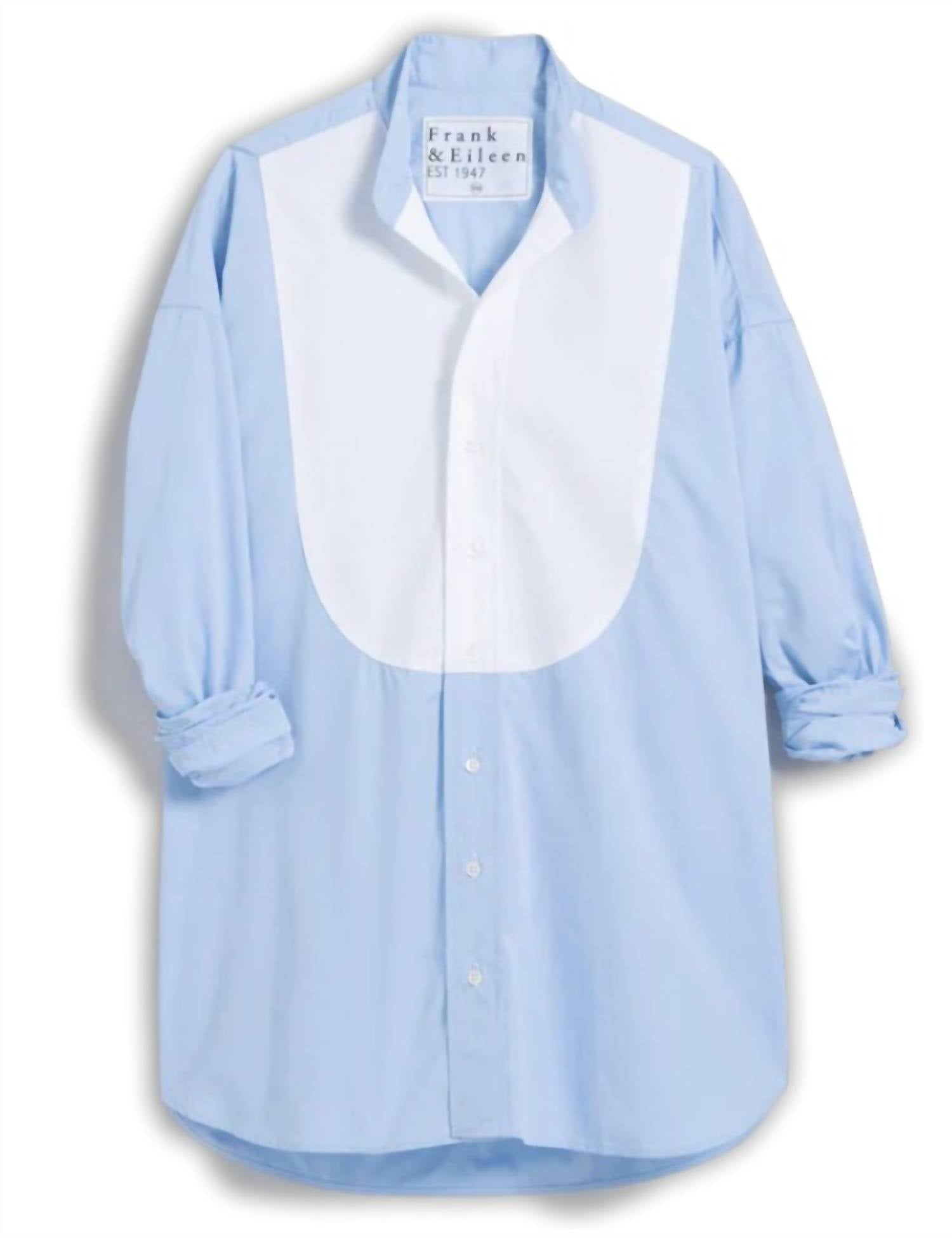 Perfectly tailored and soft to the touch. Introducing the Victoria Italian Tuxedo Shirt by Frank & Eileen, a testament to Italian luxury in a striking French Blue with a White Bib. This button-down shirt features three-quarter sleeves, a collarless design, and a sophisticated woven jacquard bib, perfectly tailored to showcase a more feminine look with its soft, oval-shaped shoulders. Crafted from 100% premium Cotton, it offers signature bust-flattering button placement for added elegance. With a button closure, machine wash care, and a curved shirttail hem for coverage, this shirt is set to add a touch of Audrey Hepburn-inspired charm to your spring workwear collection.