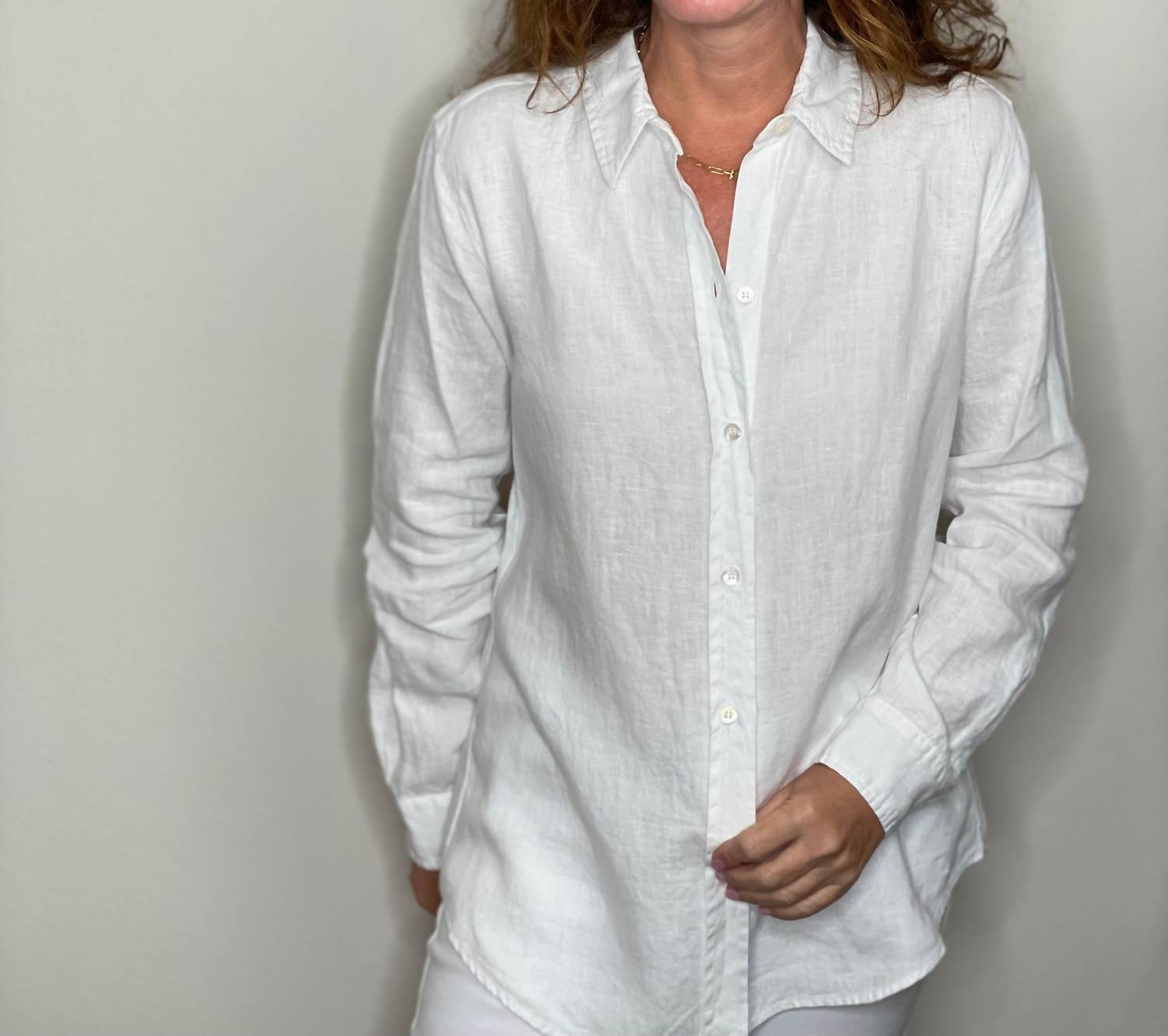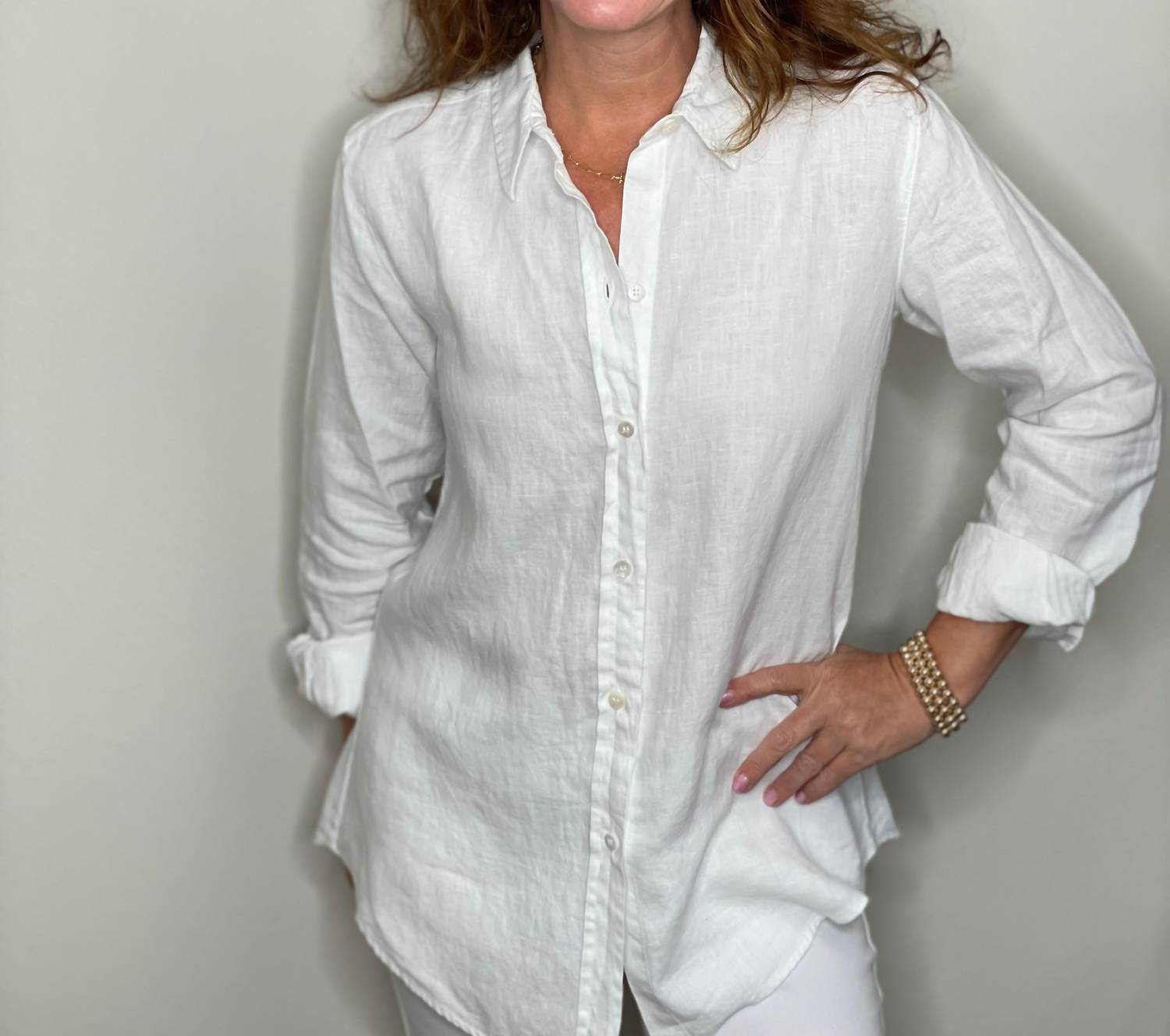 Perfectly tailored and soft to the touch. Discover the timeless allure of the Button Down Linen Shirt by Pure Amici, a wardrobe essential crafted for both style and comfort. This shirt boasts long sleeves and a classic collar, with a hemline that elegantly falls below the hip. It's crafted from 100% linen, featuring a solid pattern ideal for versatile styling. Closure: Button closure. Care: Machine wash cold. Model Cathleen is 5'4" and is wearing a size small.