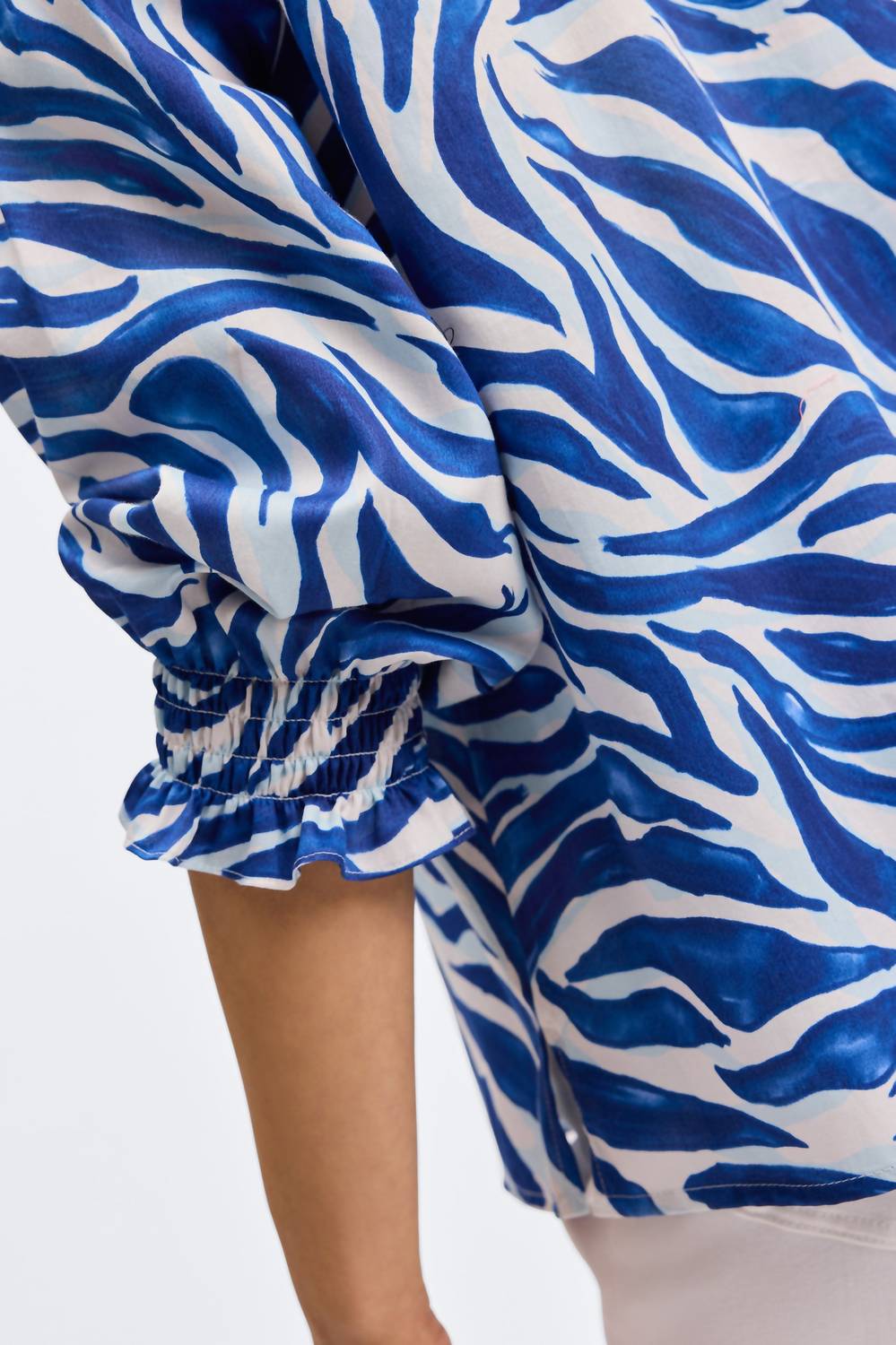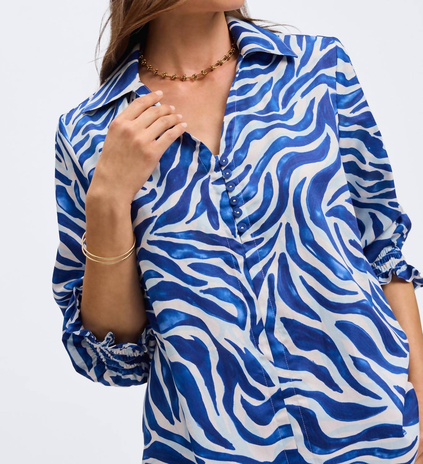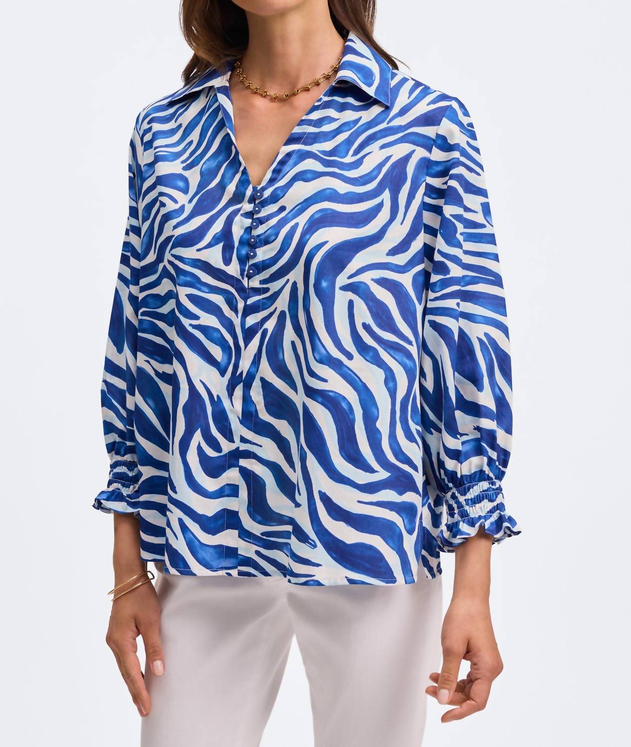 Perfectly tailored and soft to the touch. Introducing the Alexis 3/4 Sleeve Popover Shirt by Foxcroft, a sophisticated choice for the modern woman. This cotton-poplin top in vibrant blue and white features striking paisley patterns and three-quarter sleeves with sweetly smocked cuffs. Crafted from 100% cotton, it has a polished spread collar and a convenient button half placket. Imported and easy to care for, simply machine wash and tumble dry to maintain its elegant drape and subtle sheen.
