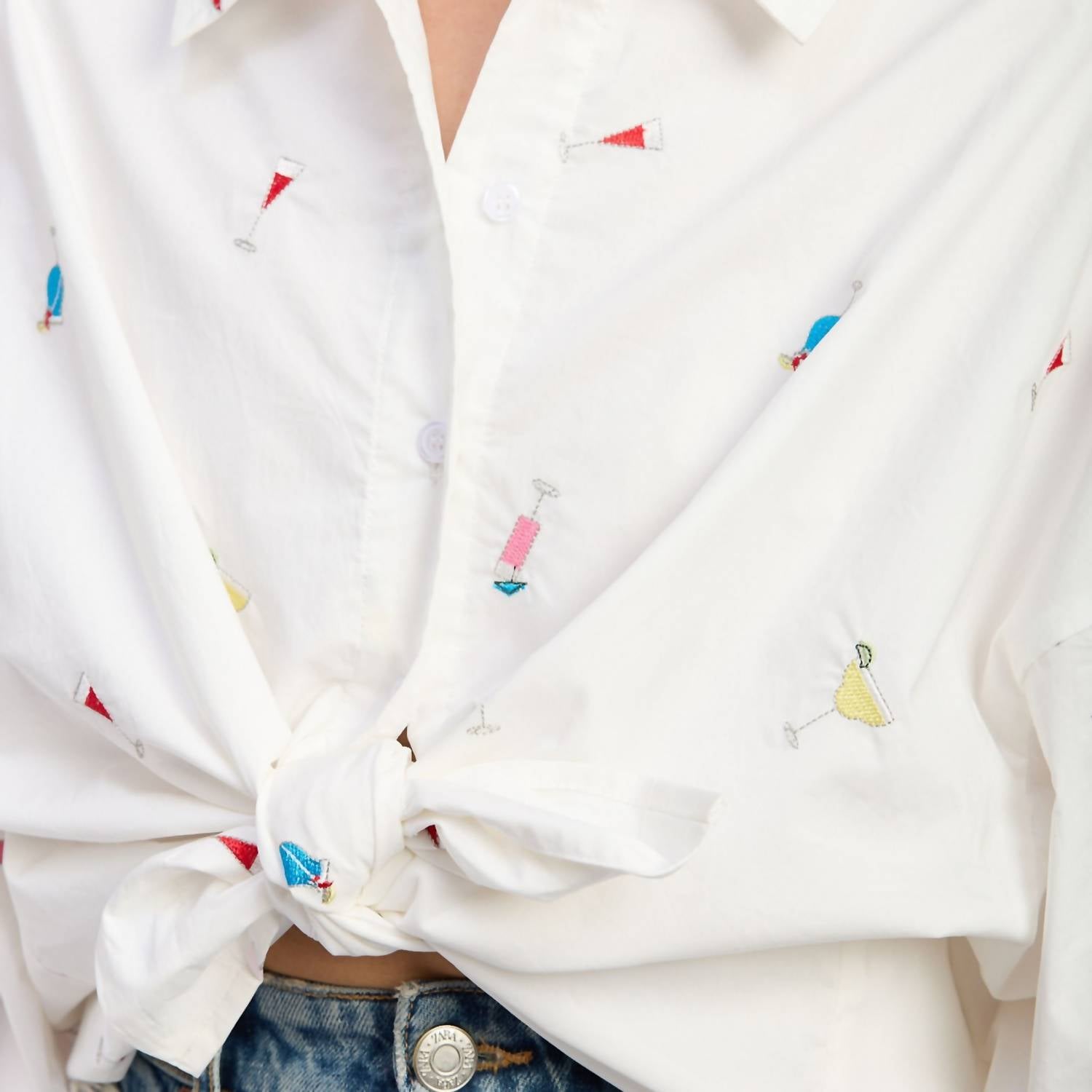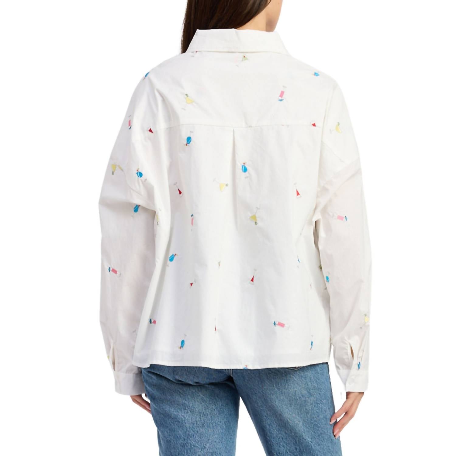 A classic button down shirt that will never go out of style. Introducing the Nellie Cocktail Button Shirt by En Saison, a chic addition to any casual wardrobe. This oversized white button-up shirt is made from breathable cotton fabric and features long sleeves with buttoned cuffs for a timeless look. Closure: Button closure. The embroidered patterned details add a playful touch, perfect for spring engagements or workwear ensembles.
