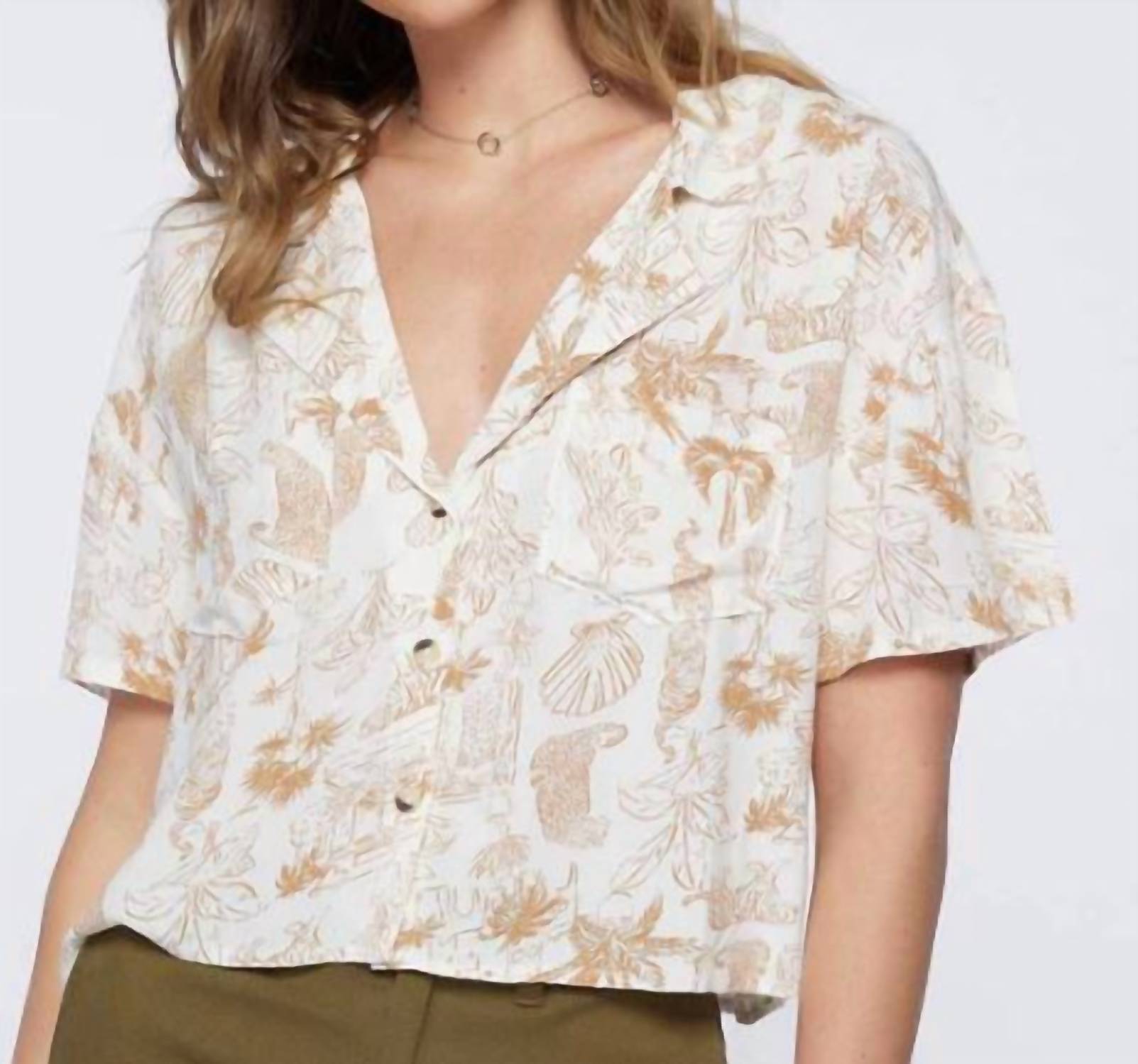 Perfectly tailored and soft to the touch. Introducing the Ophelia Top by O'Neill, a perfect blend of cute and classic for the spirited woman. This skimmer length top in white features short sleeves and a relaxed fit, complete with an eye-catching allover graphic print. Crafted from 100% viscose, it has a stylish front button closure and a collared neckline. Ideal for streetwear or a music festival during the spring season.