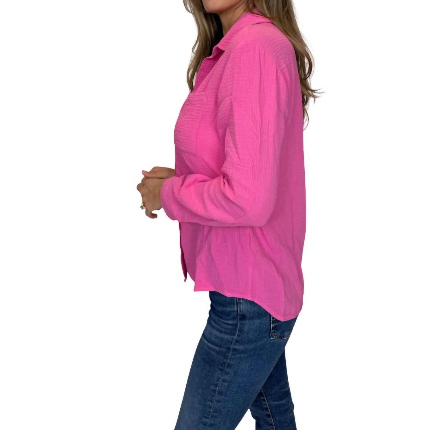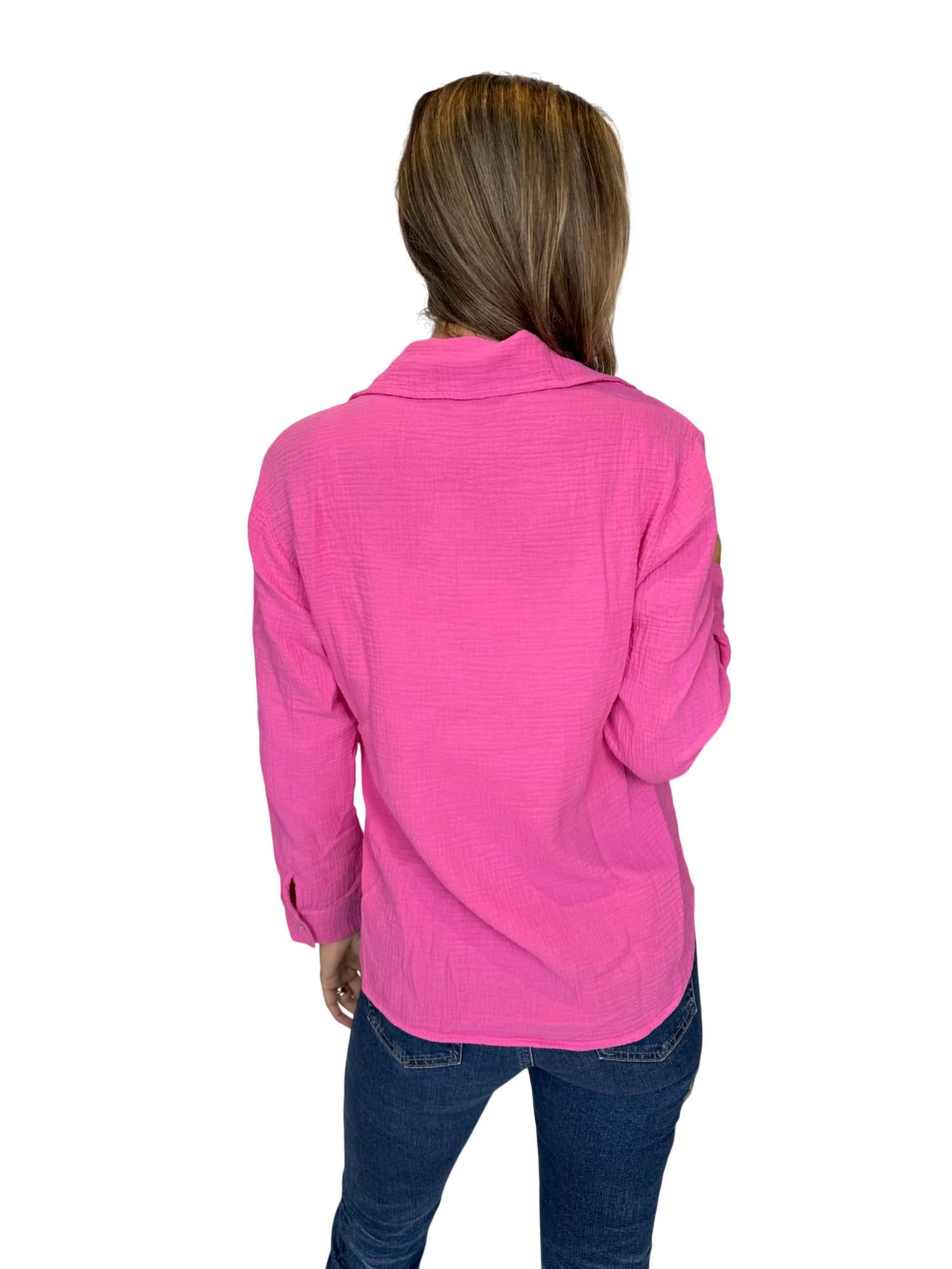 This button down shirt is comfortable yet polished. Introducing the Sundry Long Sleeve Button Down in a refreshing pink hue, a staple for effortless style and comfort. Crafted from 100% cotton gauze, this textured shirt is made in the USA to keep you light and breezy during warmer days. With convenient pockets and a classic collar, this shirt closes with buttons for a polished finish. Care instructions include machine washing in cold water and tumble drying on low for easy maintenance. Model Alyssa is 5'10" and wears a size small.