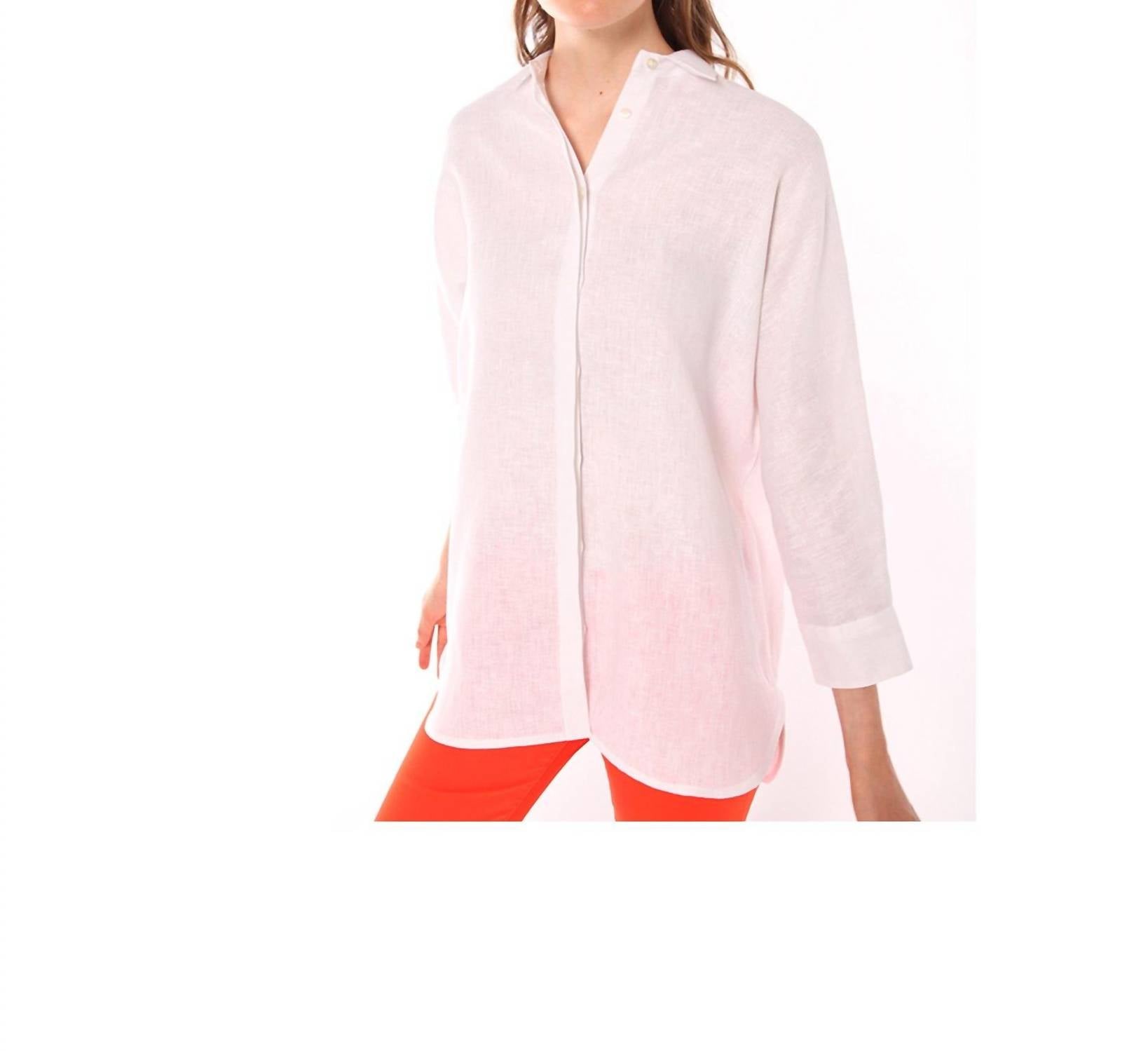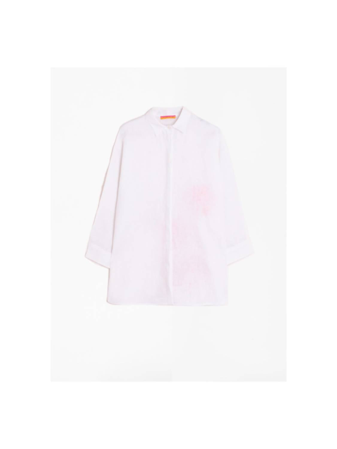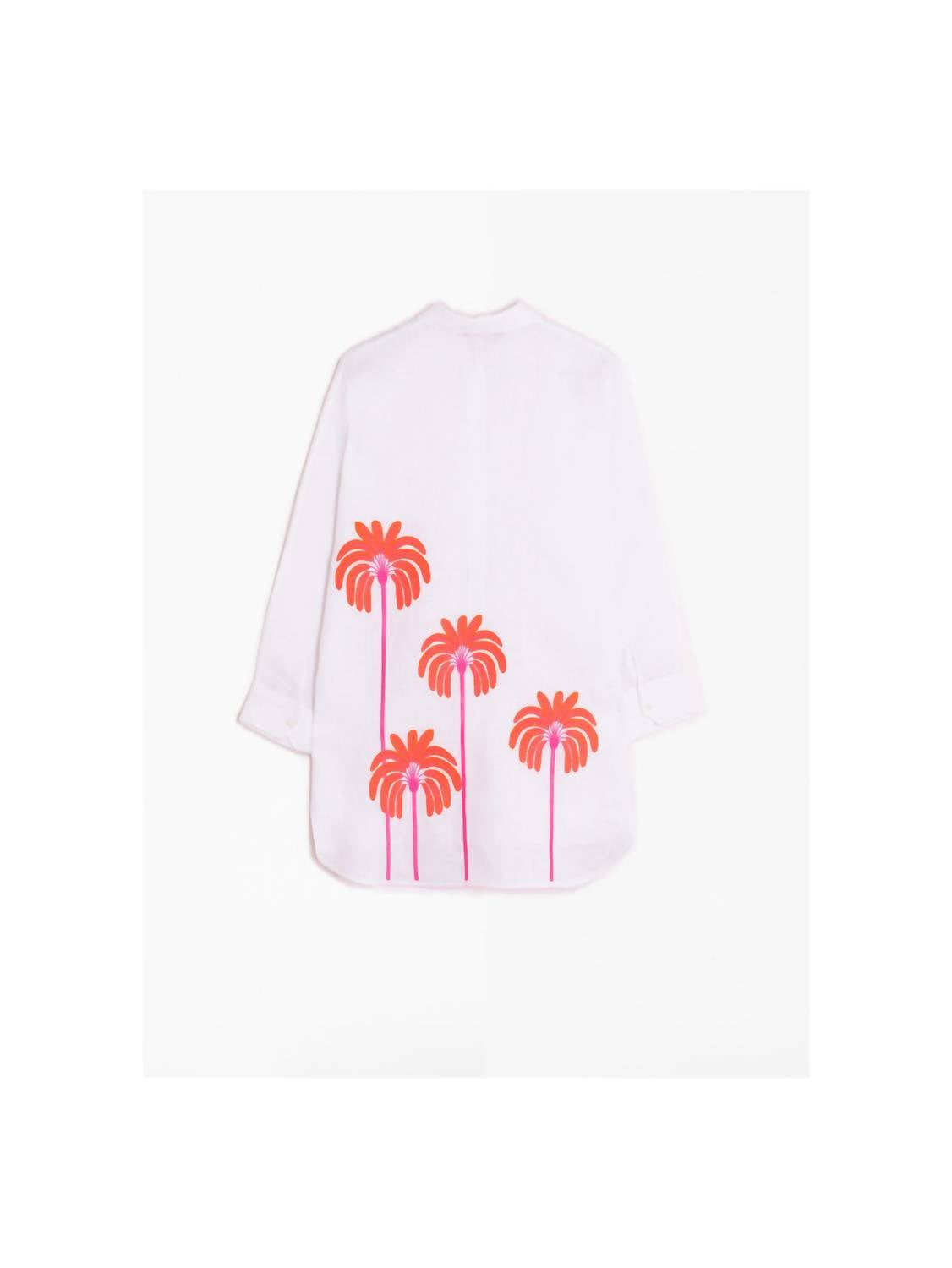 A classic button down shirt that will never go out of style. Embrace playful sophistication with the Louisa Embroidered Shirt by Vilagallo, featuring whimsical neon pink and orange palm trees embroidered at the back. Crafted from 100% pure linen, this shirt maintains a cool, refreshing feel ideal for festive occasions. It boasts a shirt collar and three-quarter-length sleeves, finished with a button closure for effortless wear. Care for this elegant piece with machine wash and tumble dry, perfect for season-long streetwear vibes. Model height: 178 cm and wears size 38.