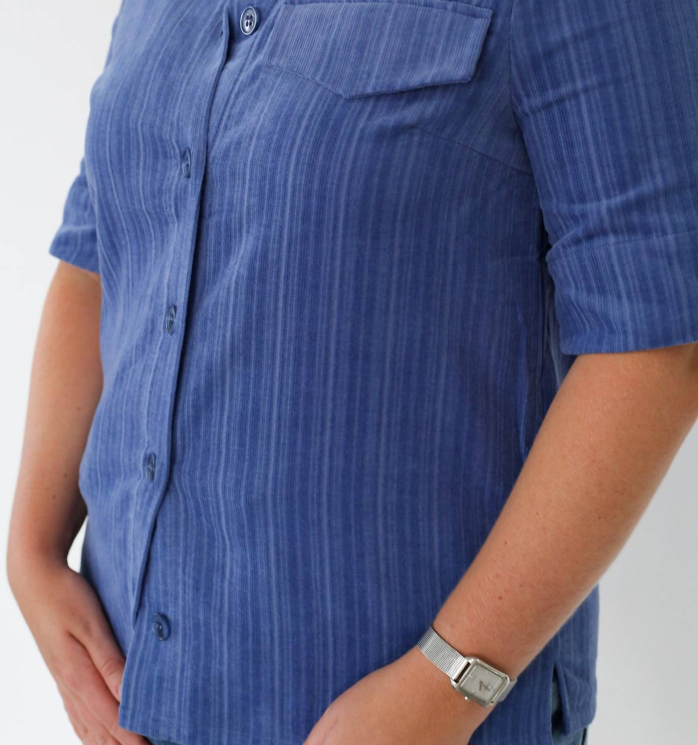 This button down shirt is comfortable yet polished. Introducing the Margo Button Down Shirt by Baum und Pferdgarten, a perfect blend of classic style and modern trend in a striking blue stripe. This long sleeve shirt is crafted from 100% cotton, ensuring comfort and breathability for any spring occasion, particularly music festivals. Designed with large button closures and a chic false pocket flap, this slightly oversized shirt embodies a touch of 90s fashion with its collared neckline. Elevate your wardrobe by pairing it with pants for a coordinated look.