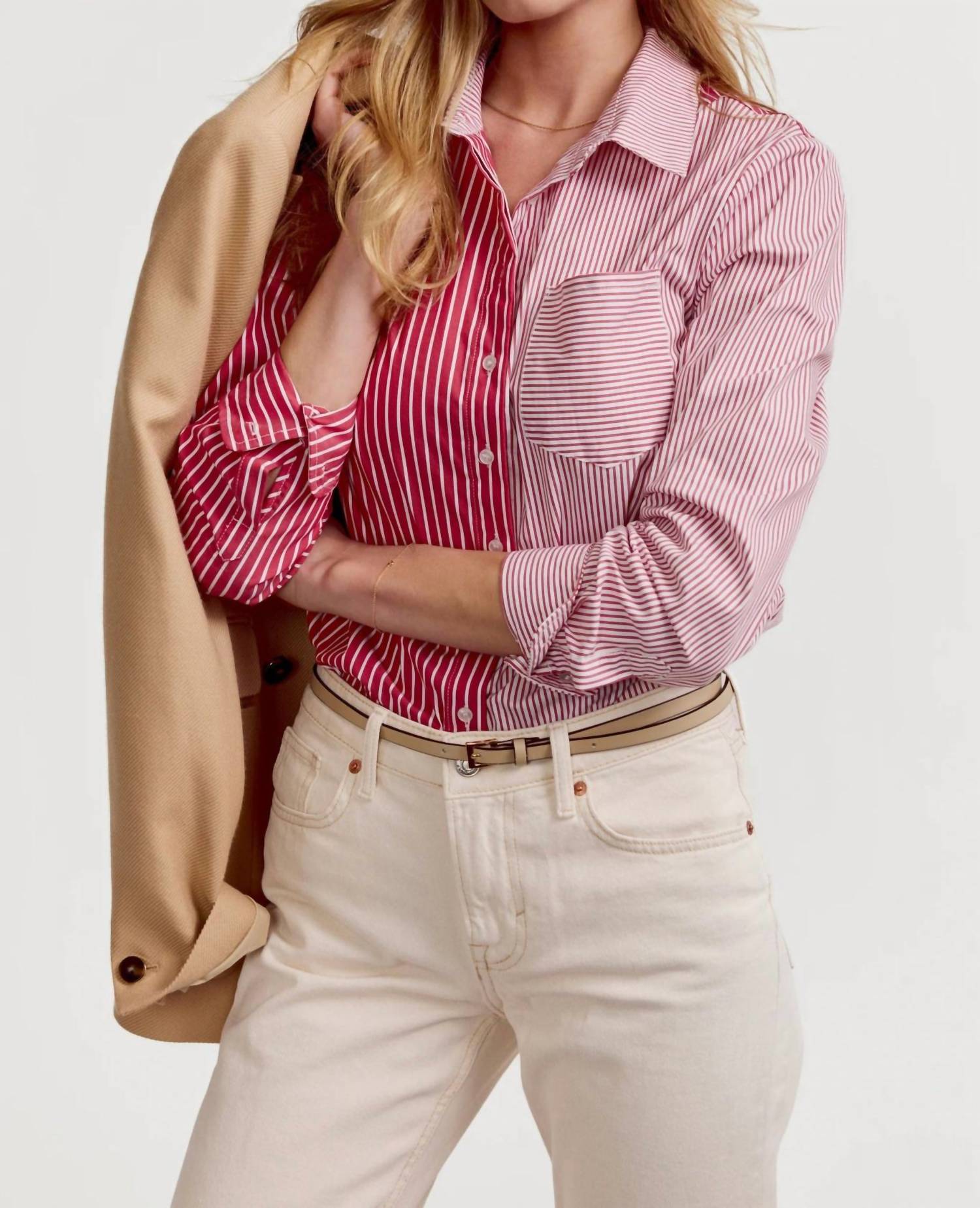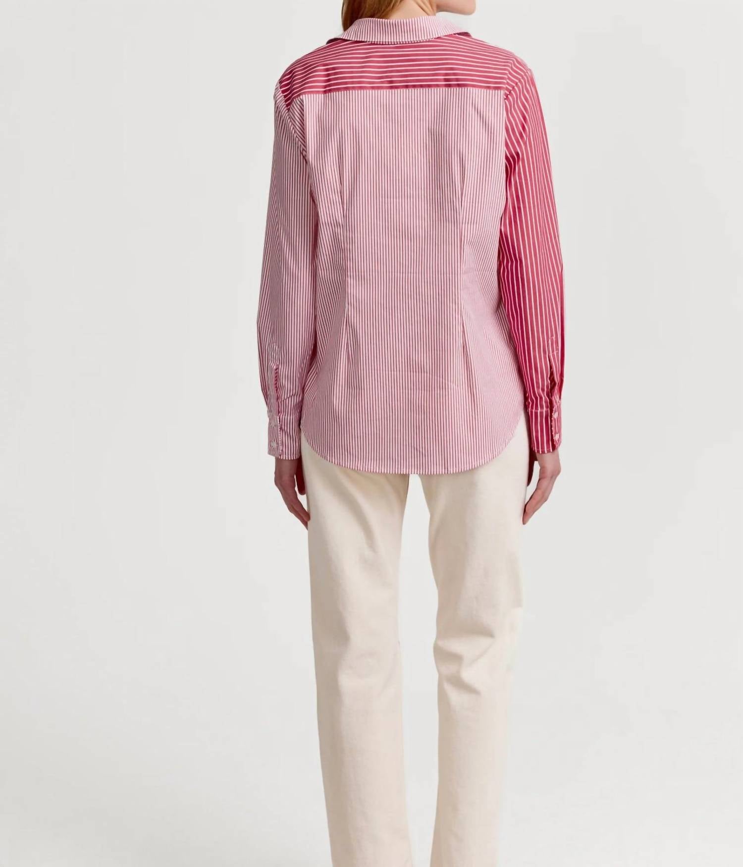 A classic button down shirt that will never go out of style. Introducing the Boyfriend Shirt by THE SHIRT in a chic Red Multistripe pattern, specifically designed for a relaxed fit. This women's long sleeve button down features the brand's innovative No Gape® button technology to prevent any blouse gape. Made from a cotton blend, it ensures a comfortable wear. Care is straightforward with a machine wash, followed by a line dry.