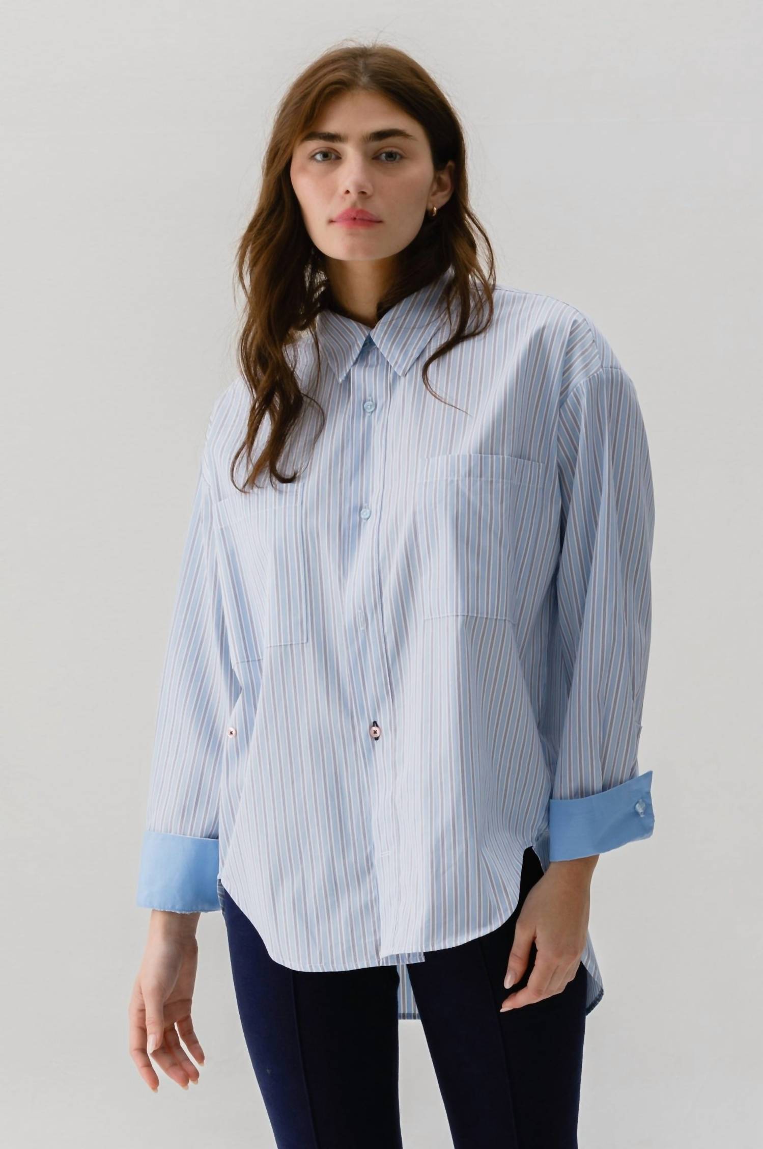 This button down shirt is comfortable yet polished. Introducing the Boyfriend Shirt by CISSA, a chic choice for women who appreciate both comfort and style. Crafted from Albini Giza 87 Egyptian Cotton, this long sleeve shirt features a relaxed stripe pattern and a high-low hemline for a unique silhouette. Equipped with two oversized front pockets and a button closure, it offers both practicality and the option to style it with a signature wrapped look. Perfect for elevating your casual wardrobe with its effortlessly cool collar neckline.