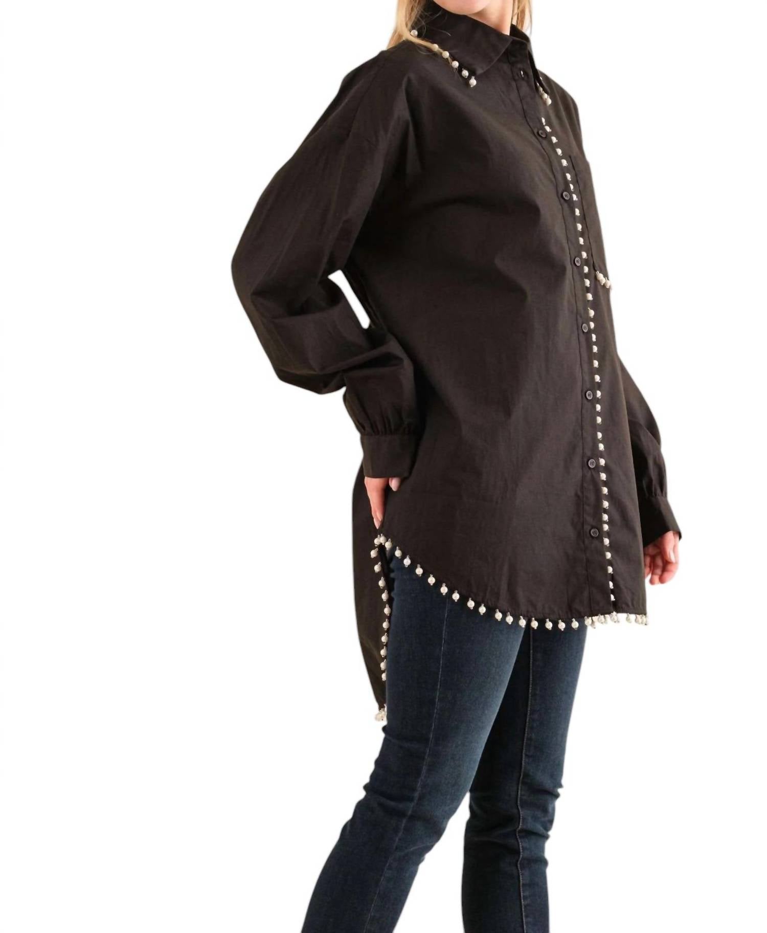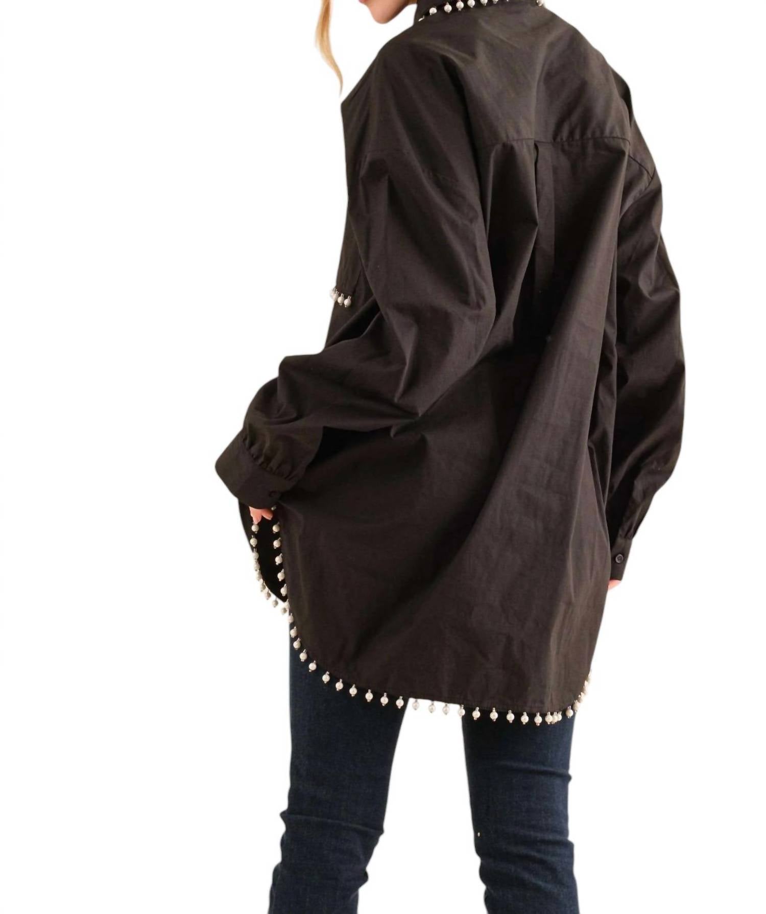 This oversized button-down shirt features long sleeves, a collared neck, and a chest pocket. It has a hi-low hem, and pearl trim accents. Made from 65% Polyester and 35% Cotton.