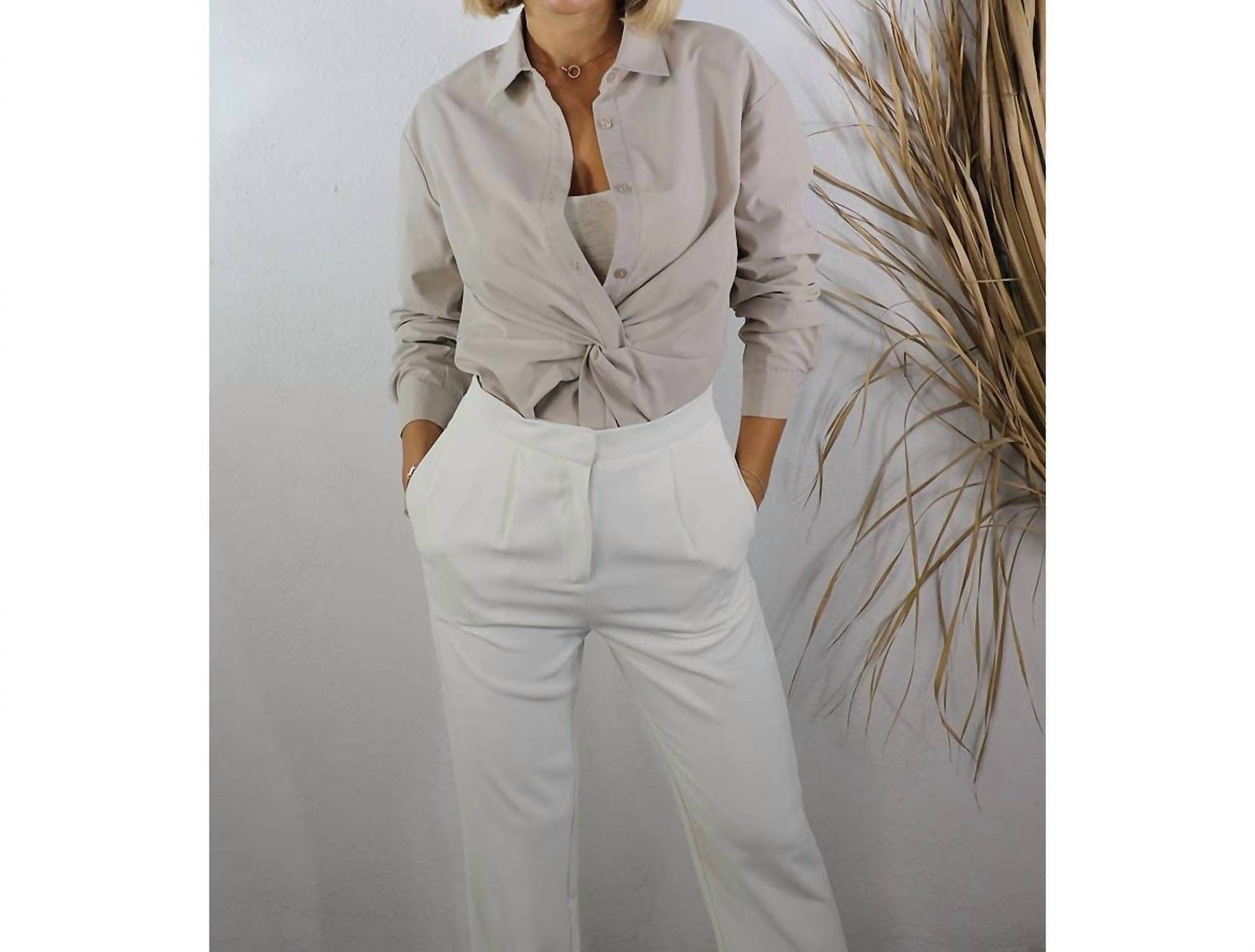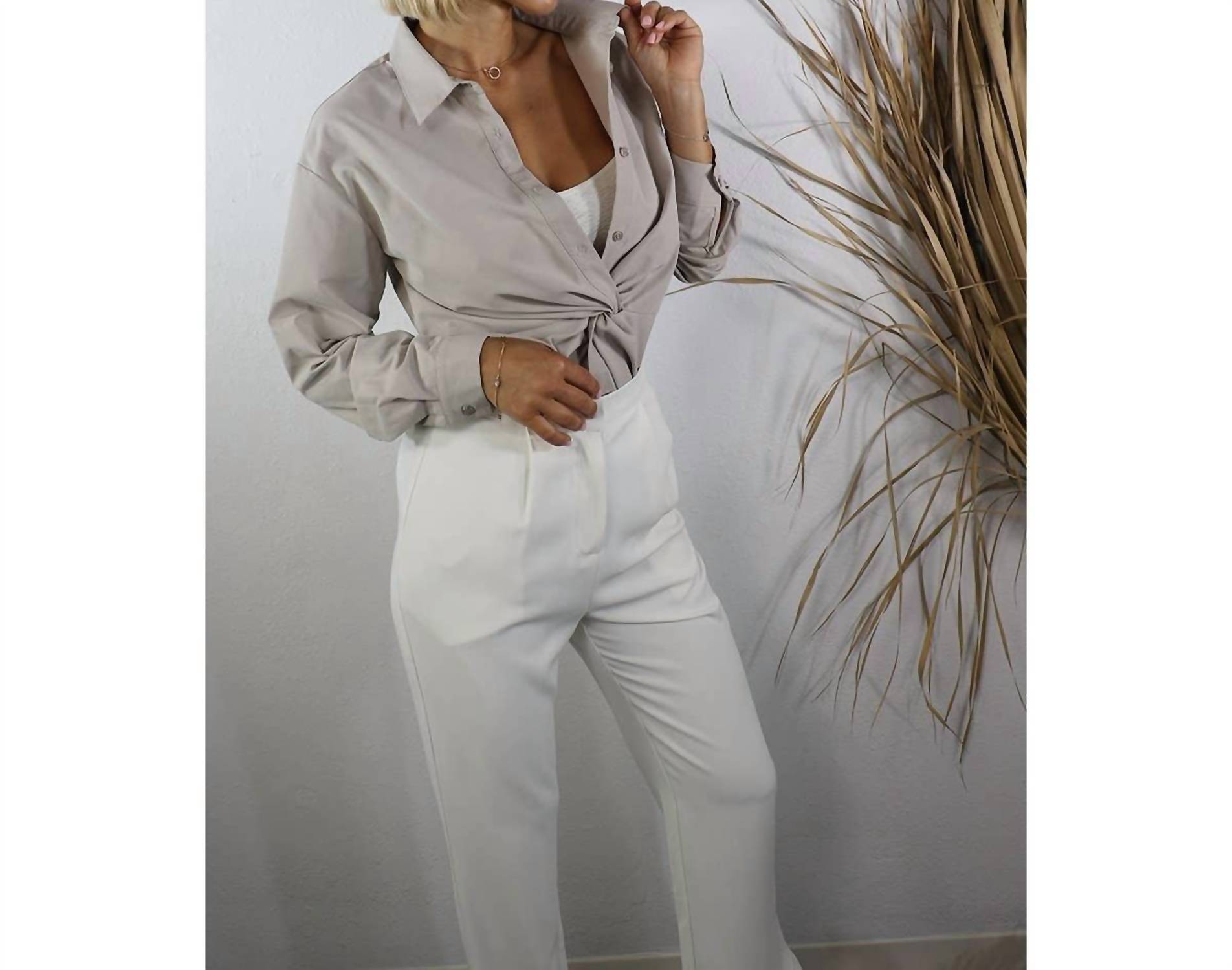 Perfectly tailored and soft to the touch. Crafted from 100% luxurious rayon in a sophisticated stone beige hue. This women's shirt features long sleeves and a classic collar, offering both fashion and comfort. Button closure. Machine wash.