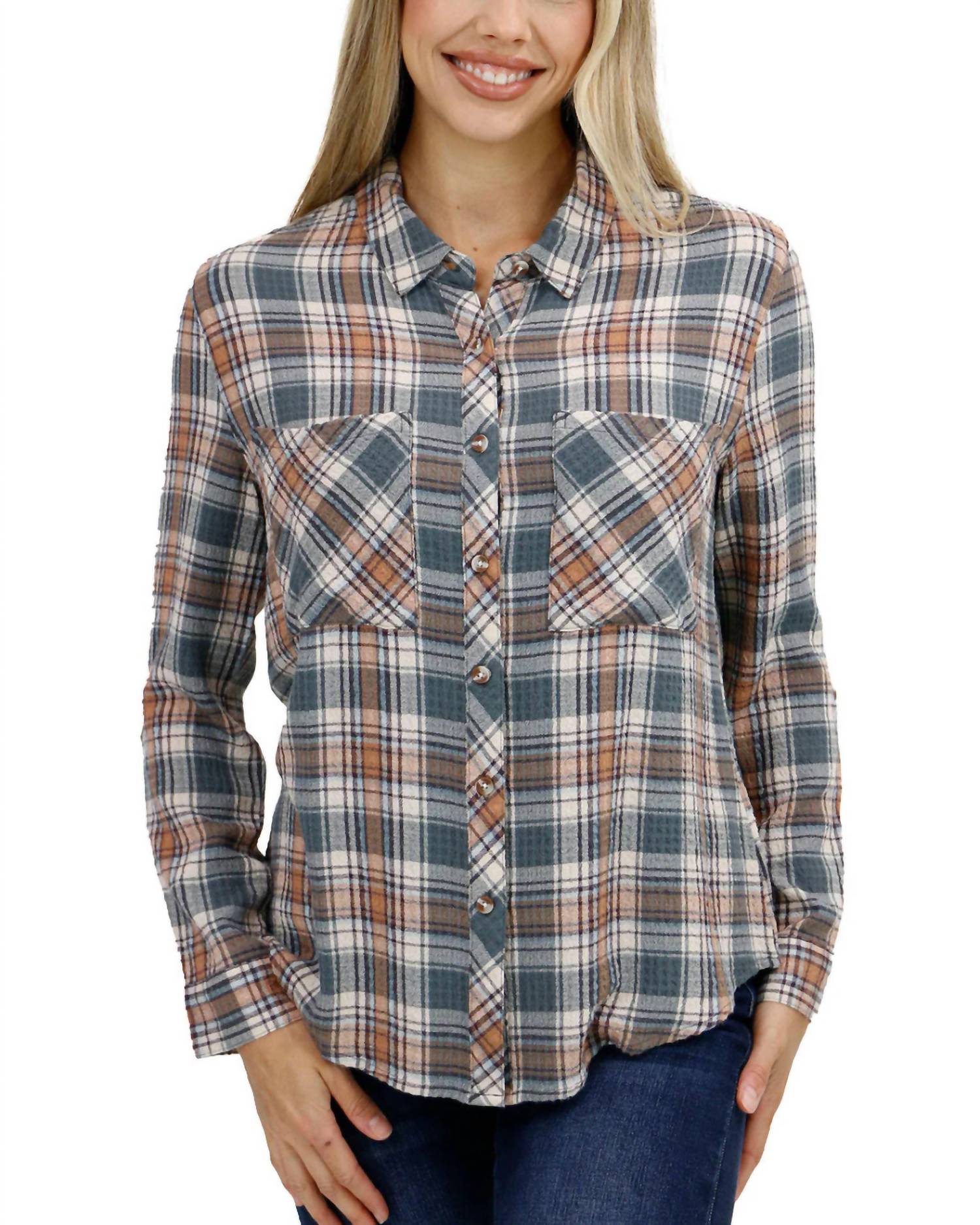 A classic button down shirt that will never go out of style. Elevate your wardrobe with the Favorite Button Up Plaid by Grace and Lace, featuring a custom plaid print in Copper Sage. This long-sleeve shirt is crafted from stretchy and drapey Rayon for ultimate comfort and a casual oversized boyfriend fit. Designed for versatility, it includes button closure and handy pockets, perfect for layering or wearing solo. Care: Machine washable for easy maintenance.