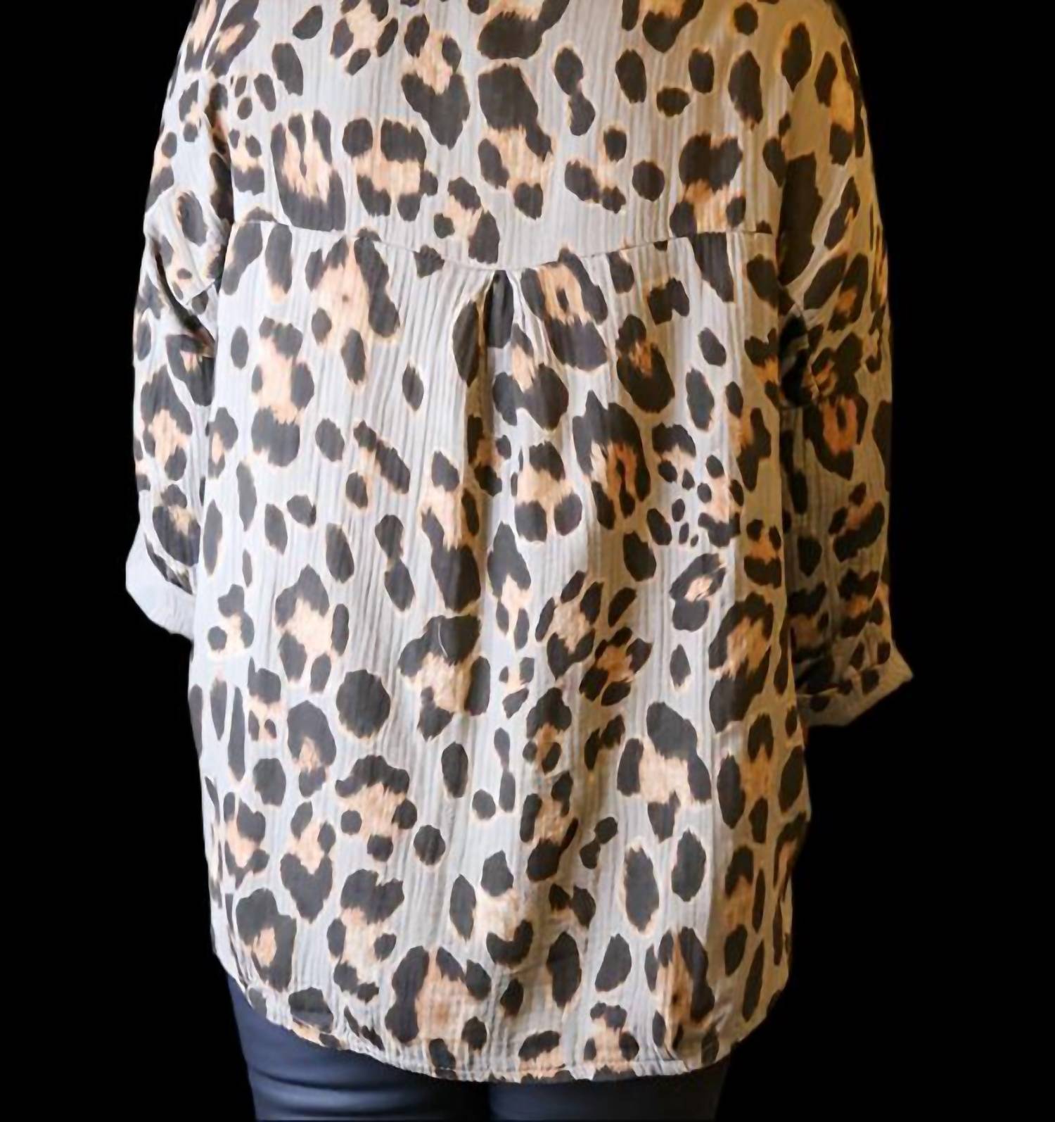 Perfectly tailored and soft to the touch. Women's Grey Animal Print Blouse, Look Mode Taupe Cheetah Print High Low Pullover Top. This oversized pullover is designed with a V-neckline, collar, and long sleeves. It fits one size (4-12) and is made from 100% viscose for comfort. Ideal for fall, it features a high-low hem for a stylish look.