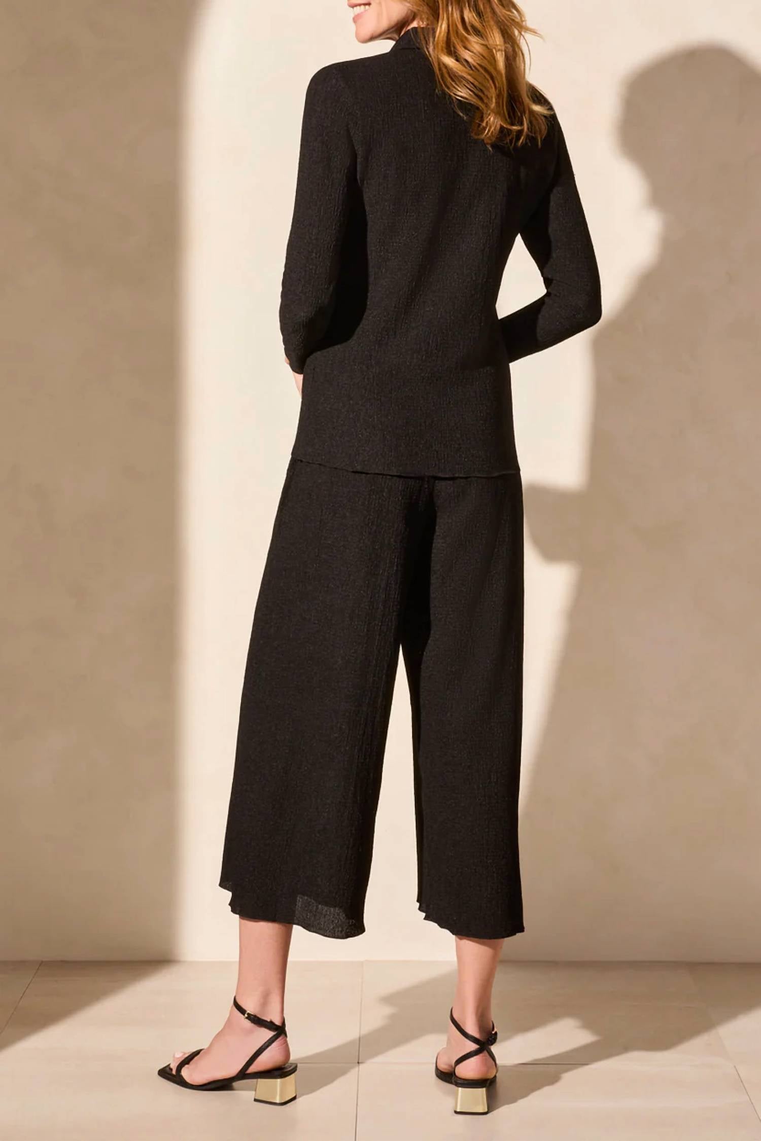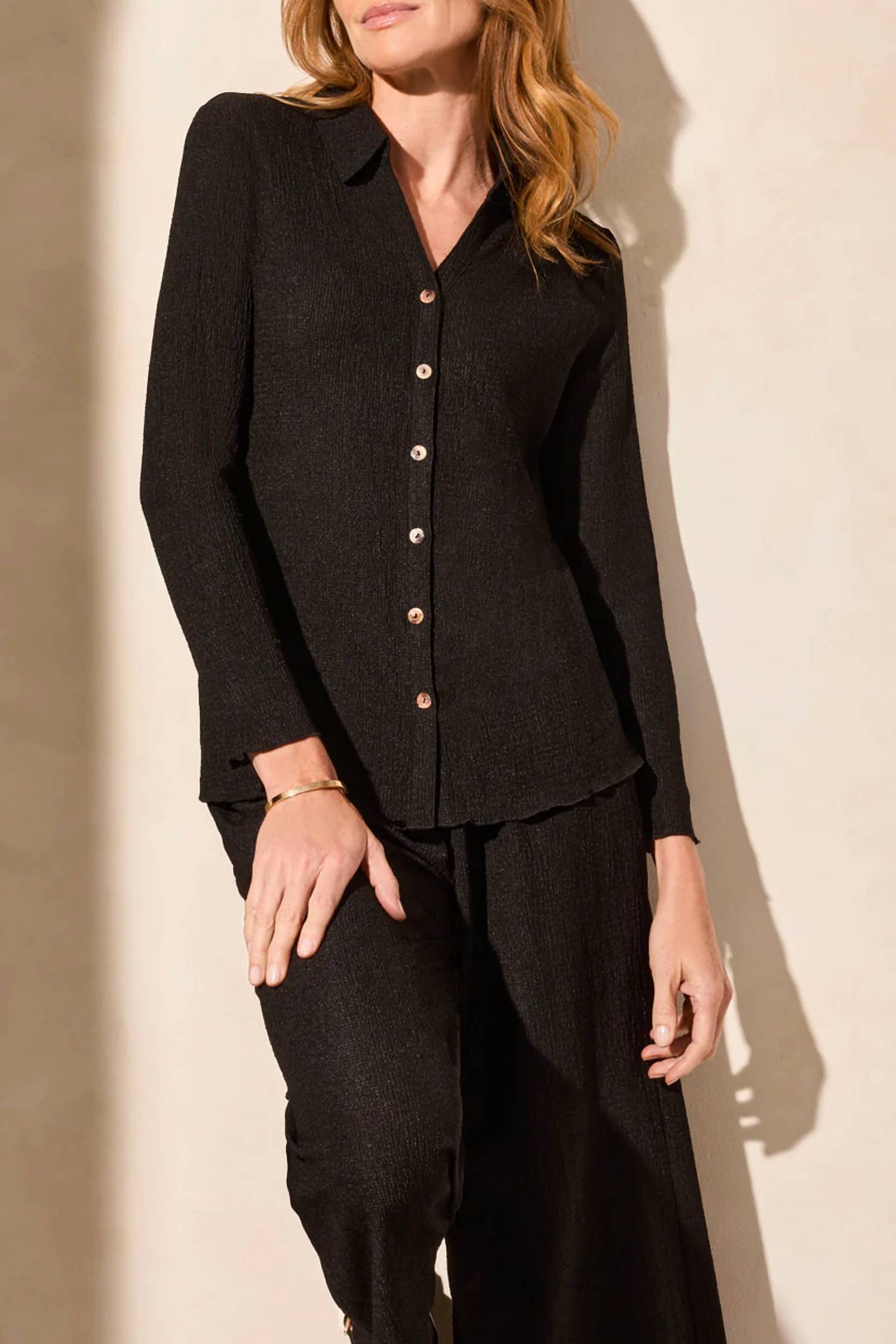 Perfectly tailored and soft to the touch. Elevate your wardrobe with the Long Sleeve Button Down Knit Shirt by TRIBAL, a blend of style and comfort in chic black. This shirt features long sleeves and a button closure, showcasing delicate pearl buttons and a revisited V-neck for a modern twist. Crafted from a premium 98% polyester and 2% elastane composition, its textured crinkle knit provides a lightweight, flowing feel. Perfect for summer occasions, this minimalist piece is machine washable and should be line dried for easy care.