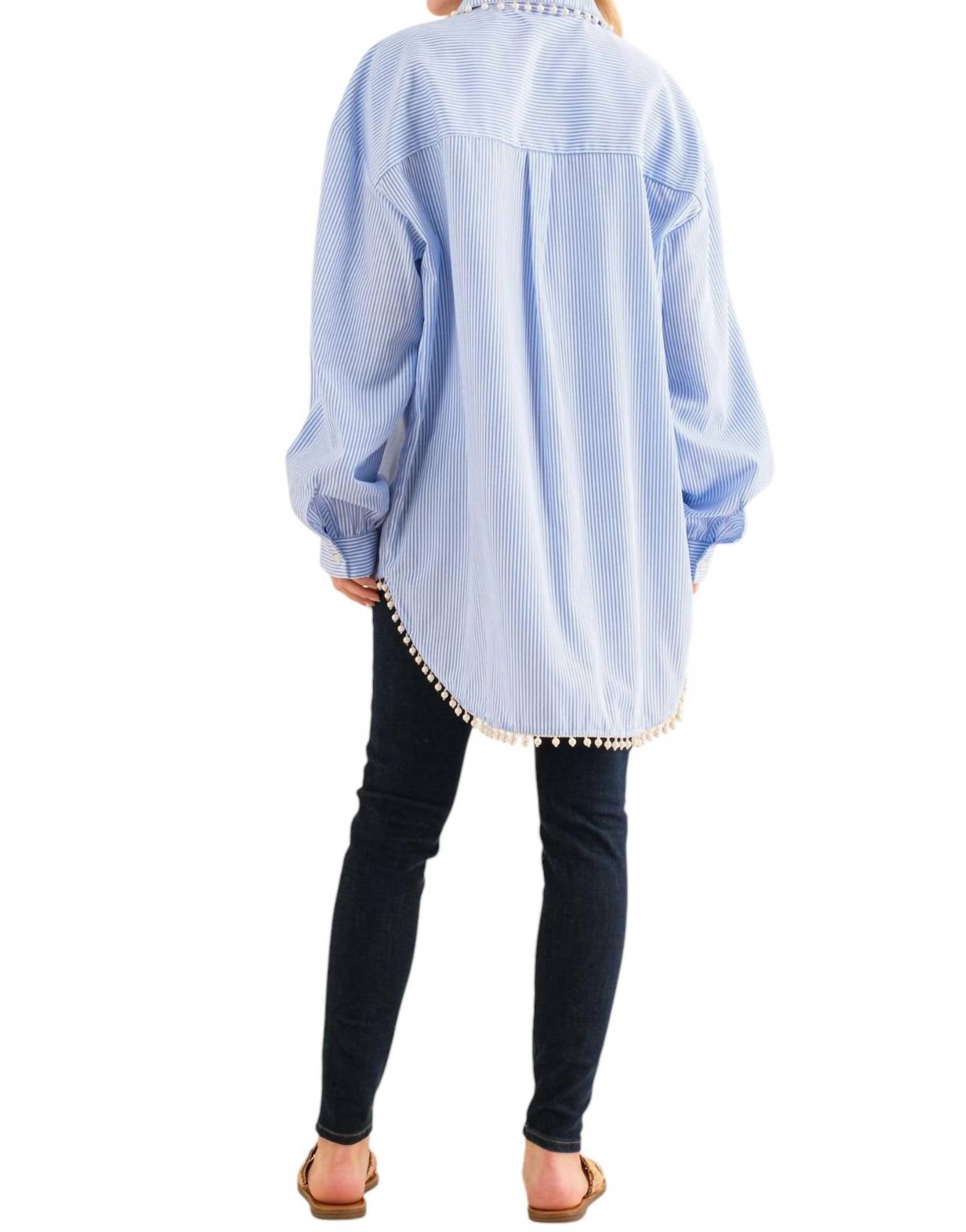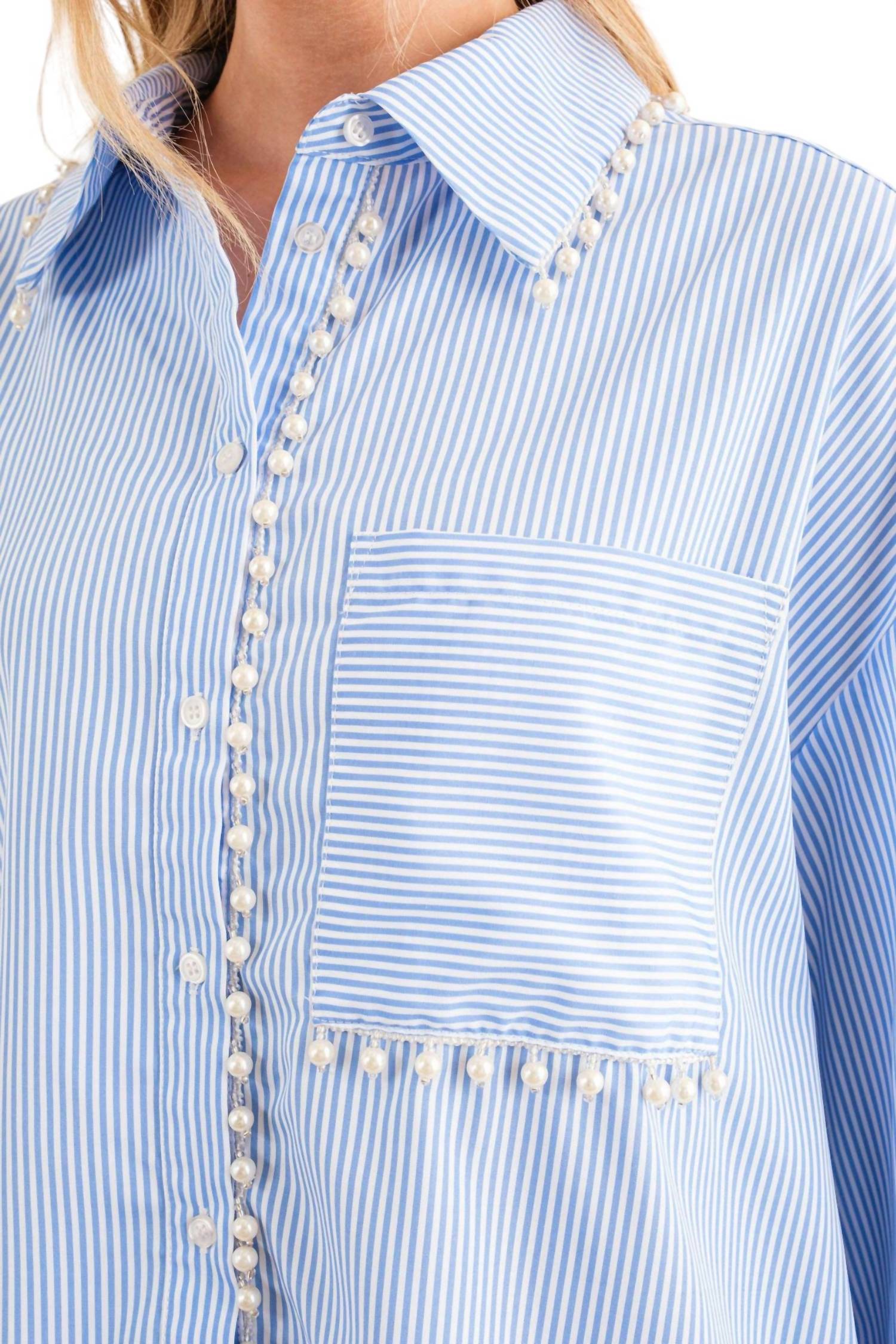 This oversized button-down shirt features long sleeves, a collared neck, and a chest pocket. It has a hi-low hem, and pearl trim accents. Made from 65% Polyester and 35% Cotton.
