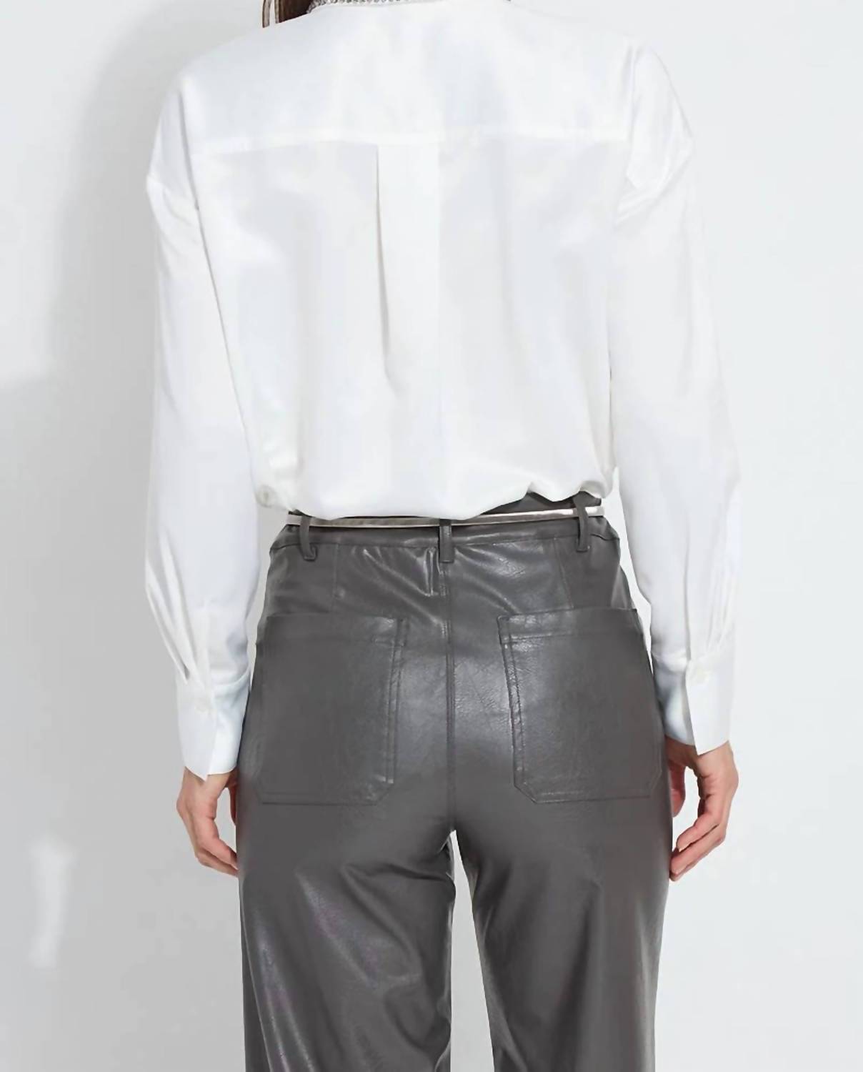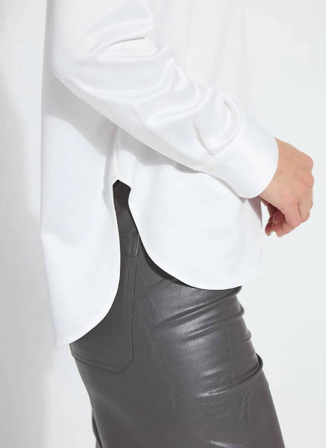 A classic button down shirt that will never go out of style. Elevate your wardrobe with the Aurora Beaded Satin Shirt by Lysse, a stunning choice in off white for a touch of elegance. This oversized piece features long sleeves and exquisite hand-stitched silver crystal beading at the collar. Crafted from silky satin with 100% polyester composition, it offers a double yoke and a high-low hem for a stylish silhouette. Closure: Button closure. Care: Turn inside out to hand wash and line dry. Model is 5'10" and is wearing a size S.