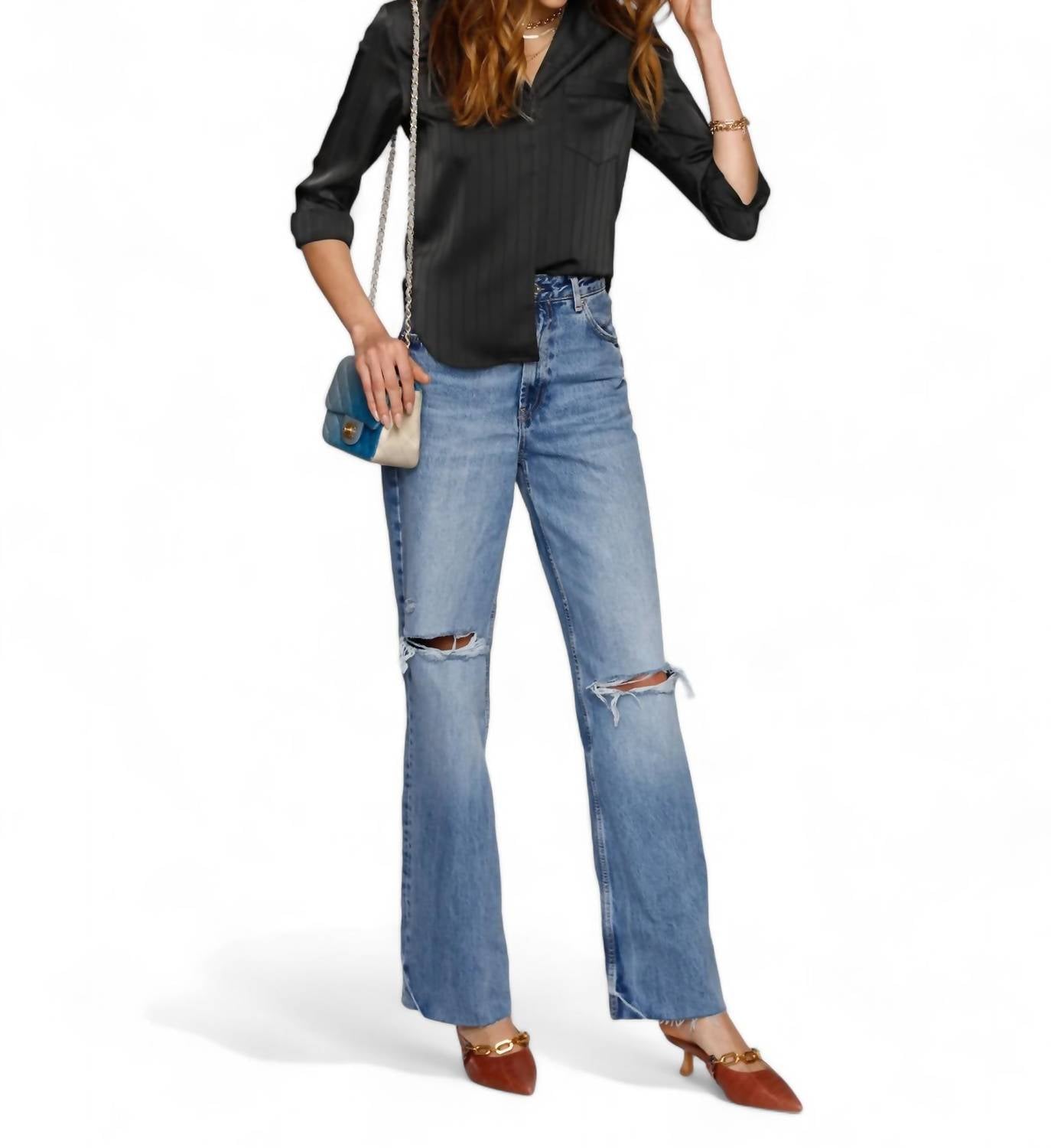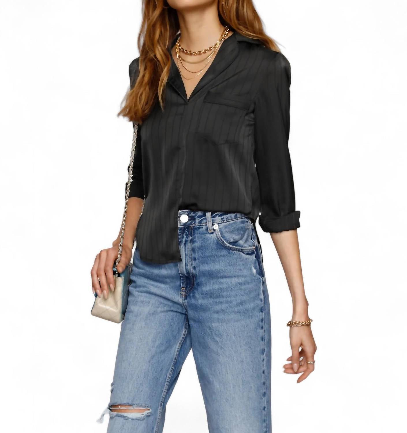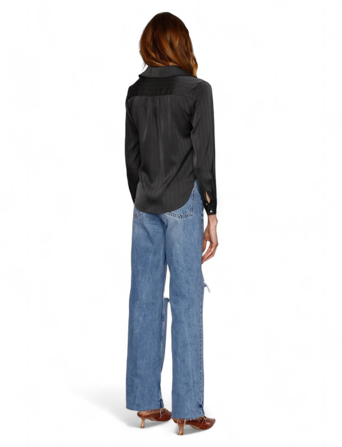 A classic button down shirt that will never go out of style. This shirt is crafted from jacquard satin with a relaxed fit and pajama-inspired details. It is a pullover style and made from 100% polyester. It is recommended to hand wash. The length is 24 inches from the high point of the shoulder, based on size S.