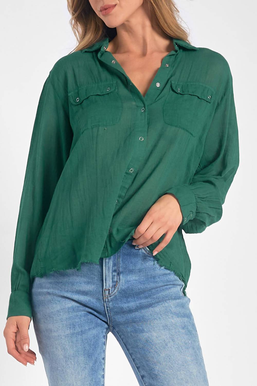 This button down shirt is comfortable yet polished. Introducing the Button Down Shirt by ELAN, an essential piece in hunter green that effortlessly ushers you into fall. This women's top is crafted from soft, lightweight cotton, offering style and comfort. It features a collared neckline, long sleeves, and a solid pattern with convenient pocket detailing. The shirt secures with a button closure, making it a versatile addition to any wardrobe.
